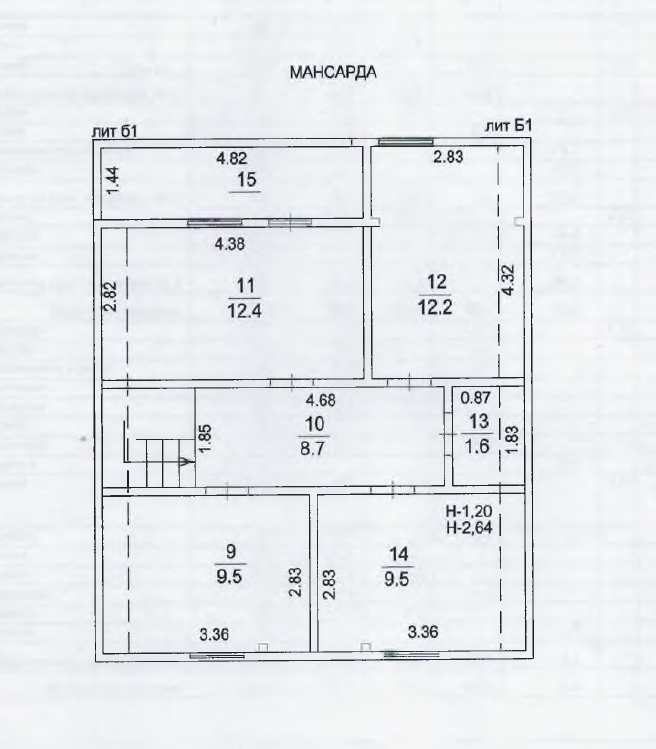 2 этаж (мансарда): 4 изолированные комнаты 9,5+9,5+12,2+12,4 м2 с балконом 6,95м2, коридор 8,7м2, санузел 1,6 м2. Высота потолка 2,12м.
