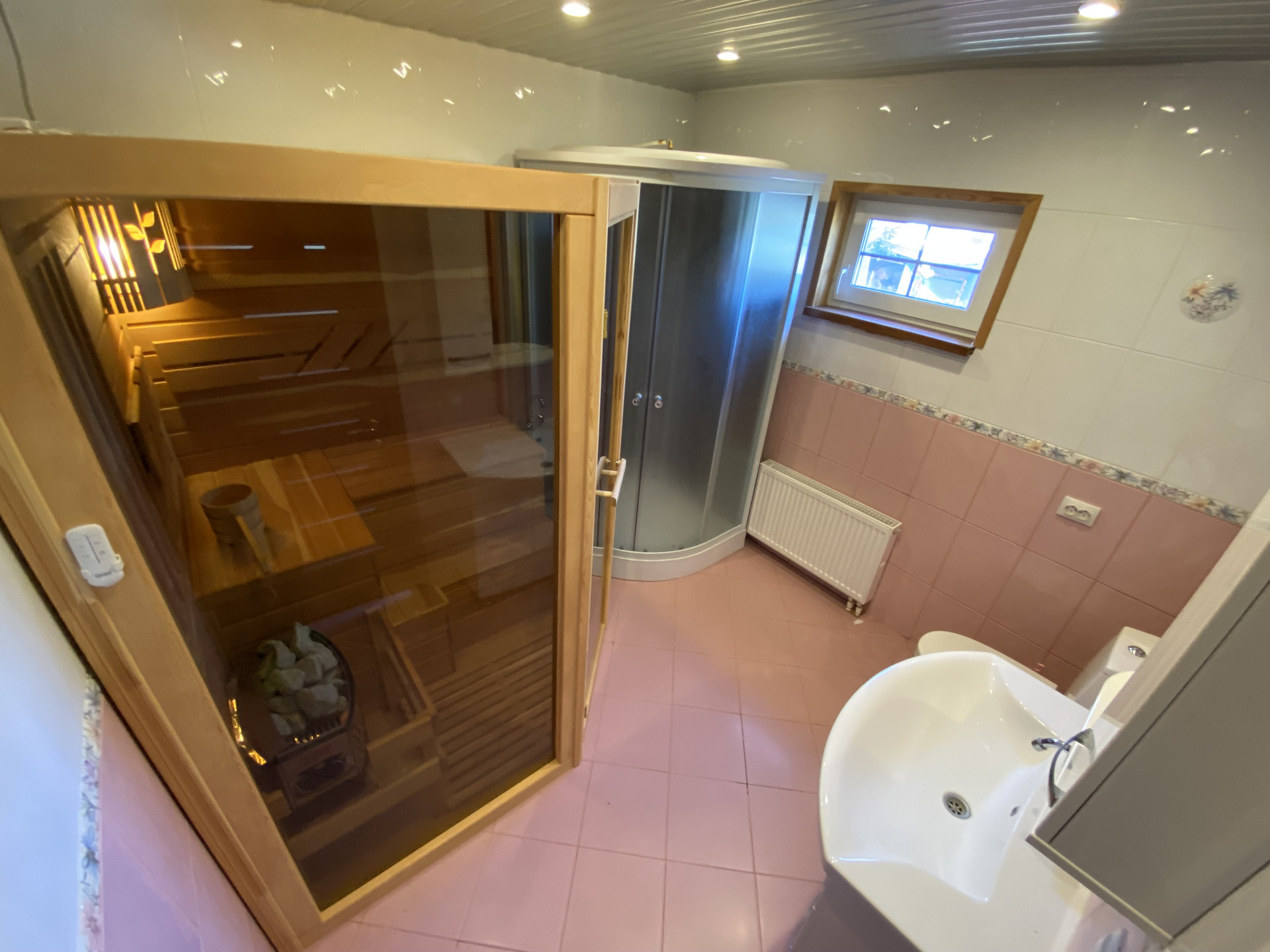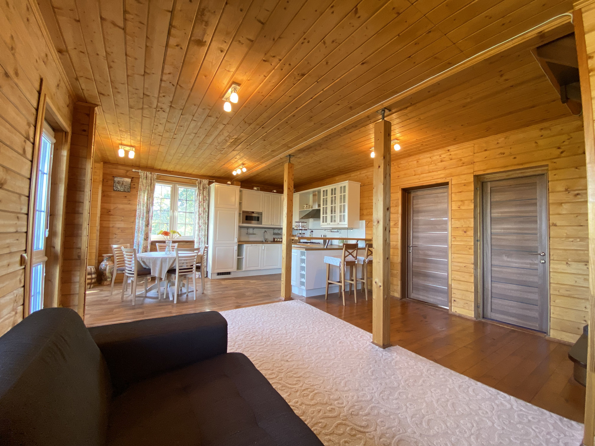 1 этаж: крыльцо 6,9м2, прихожая 7,7м2, техническое помещение 5,5м2, совмещенный санузел 8м2 с сауной, кухня-гостиная 42м2, терраса 7,5м2. Высота потолка 2,55м.
