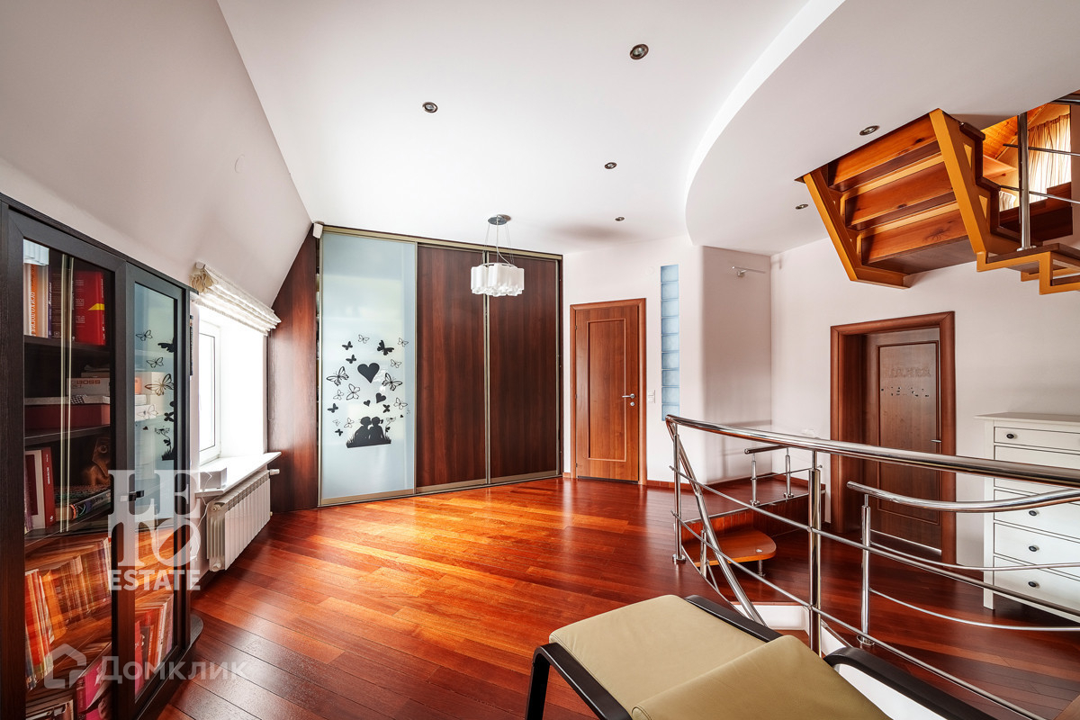 На второй этаж ведет удобная лестница из натурального дерева. Там расположены детская комната и спальня с выходом на балкон и двумя нишами под гардеробные. Холл можно использовать в качестве библиотеки.