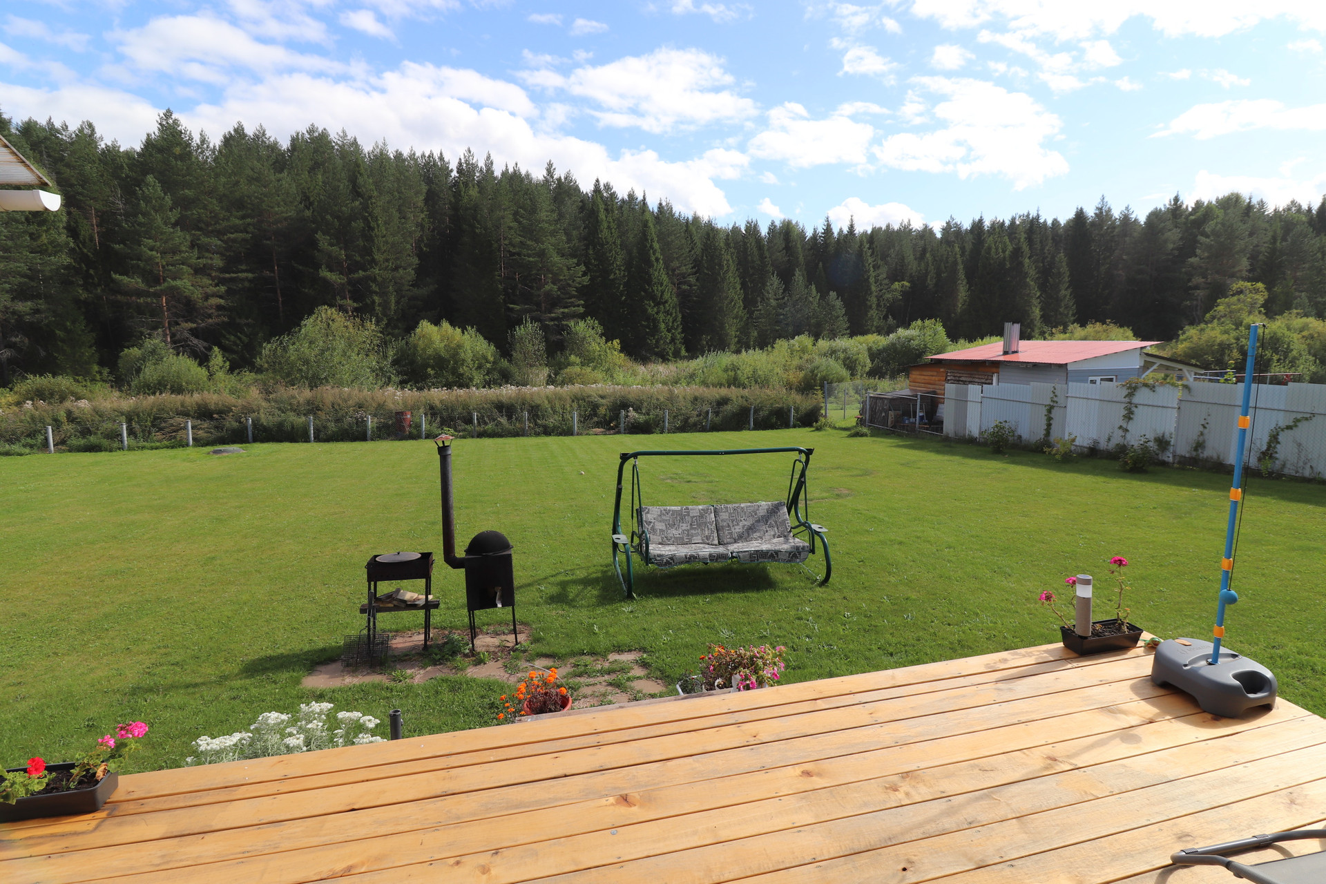 Участок разработан, растет ровный, мягкий газон, по которому можно и даже очень приятно ходить босиком.