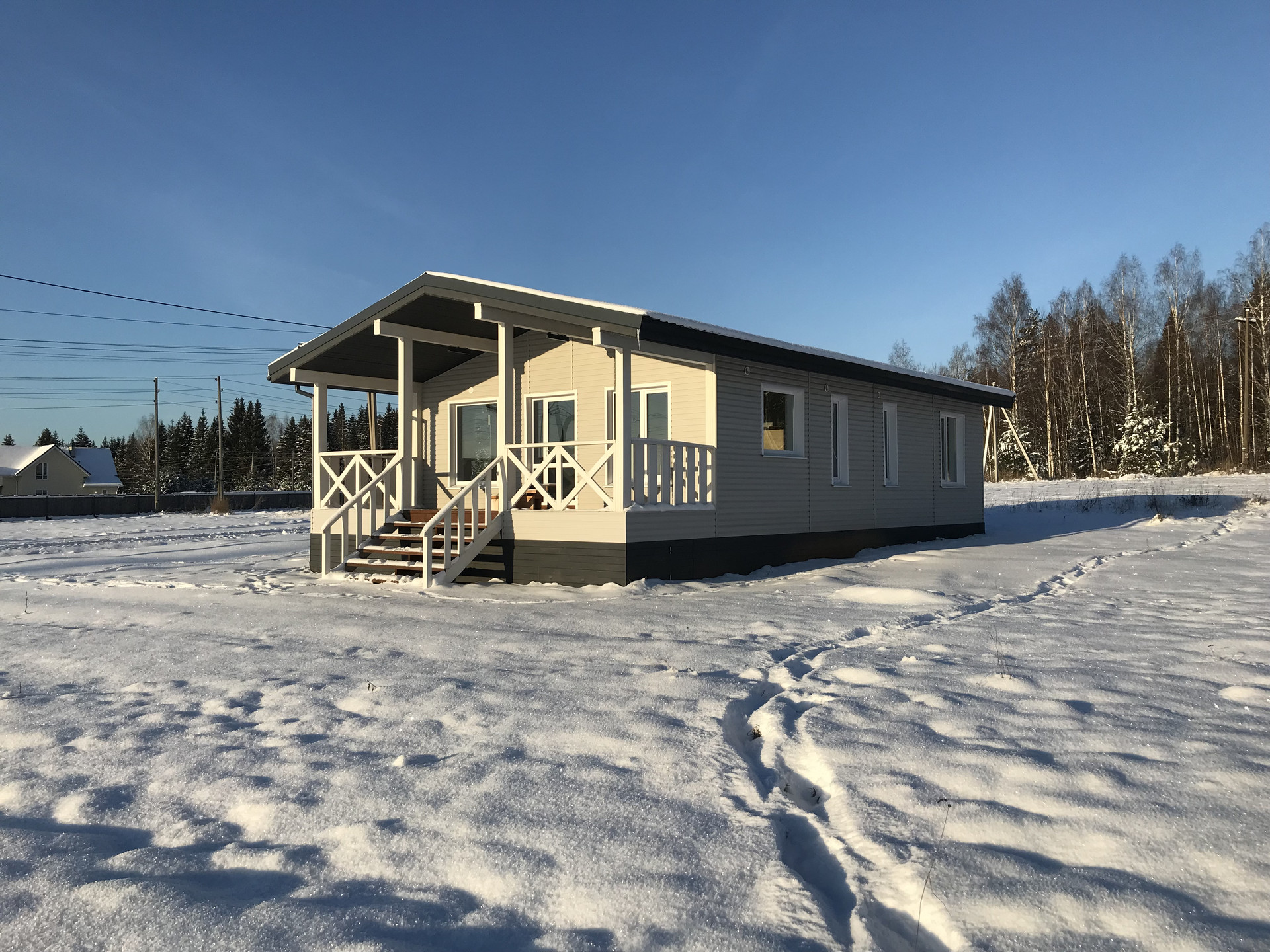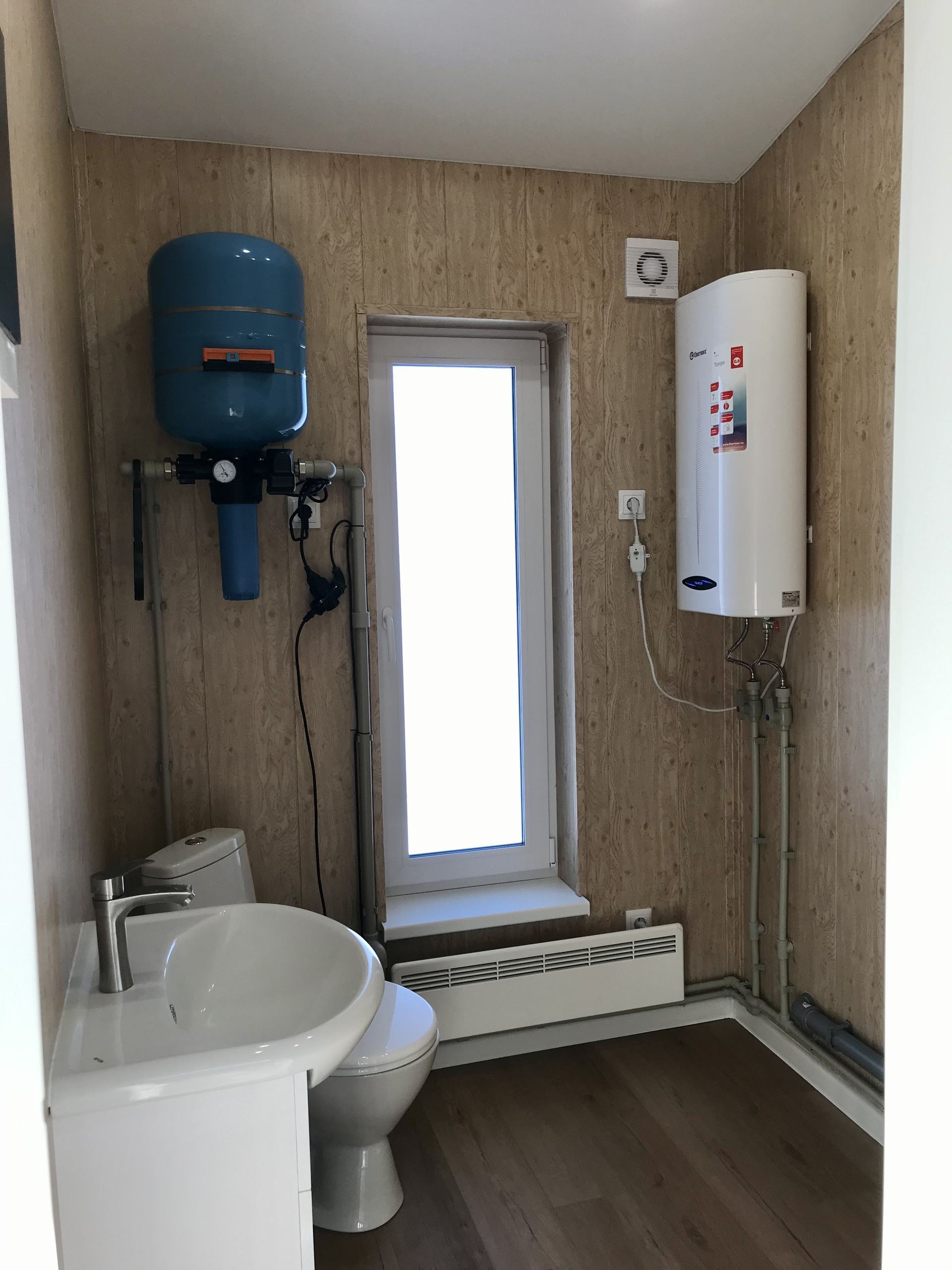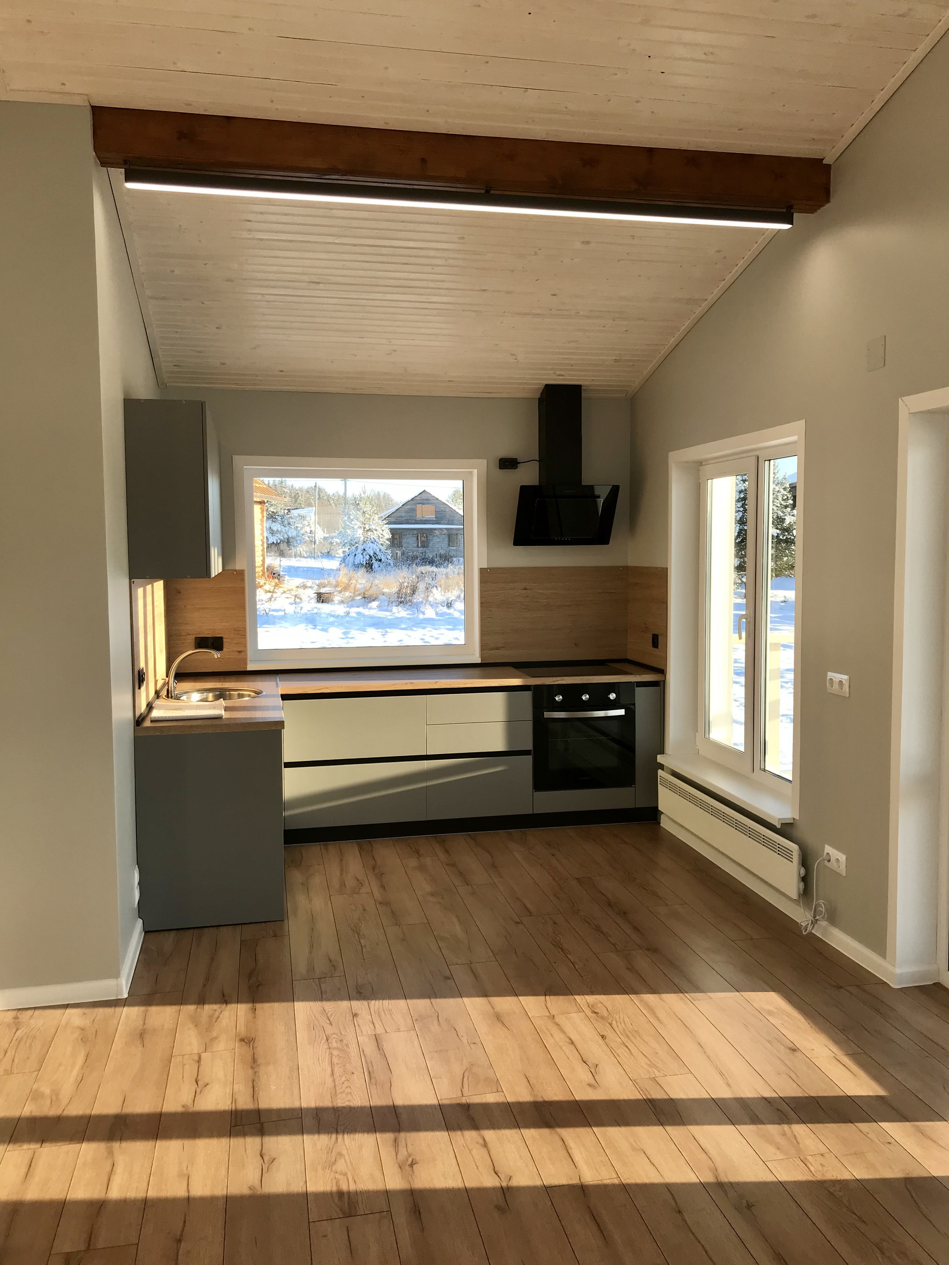 В доме выполнен ремонт с применением современных технологий и материалов. Загородный дом уже имеет систему водоснабжения и систему канализации. Отопление электрическими конвекторами Ensto, в с/у и в прихожей установлена регулируемая система «Тёплый пол». В зоне кухни установлен кухонный гарнитур с встроенной техникой, такие как варочная панель, духовой шкаф и вытяжка. Предусмотрено так же место под посудомоечную машину. Спальная комната имеет свой гардероб. Санузел включает в себя всю необходимую сантехнику и мебель. В техническом помещении предусмотрен дополнительный туалет с умывальником и местом под стиральную и сушильную машину.