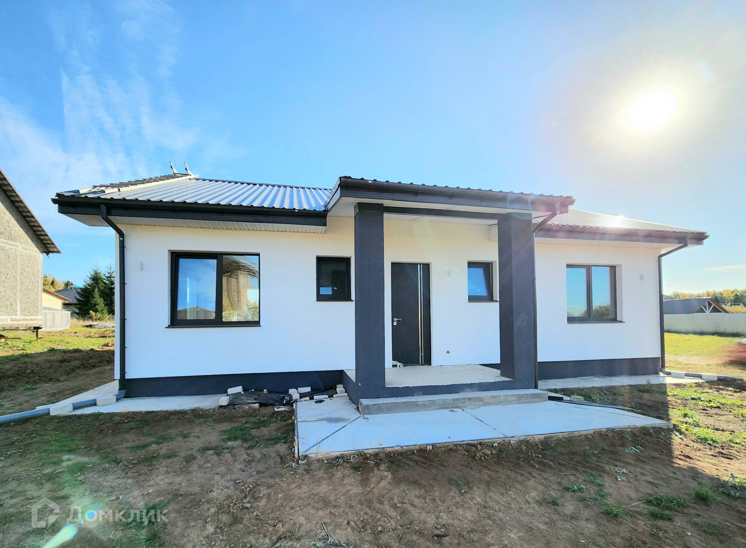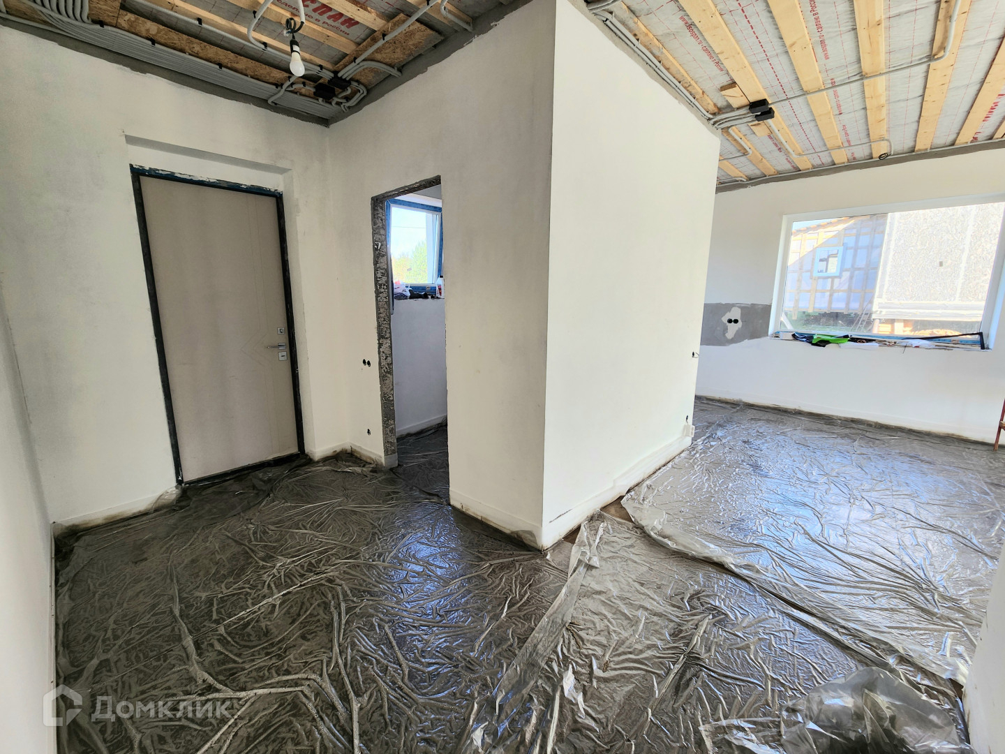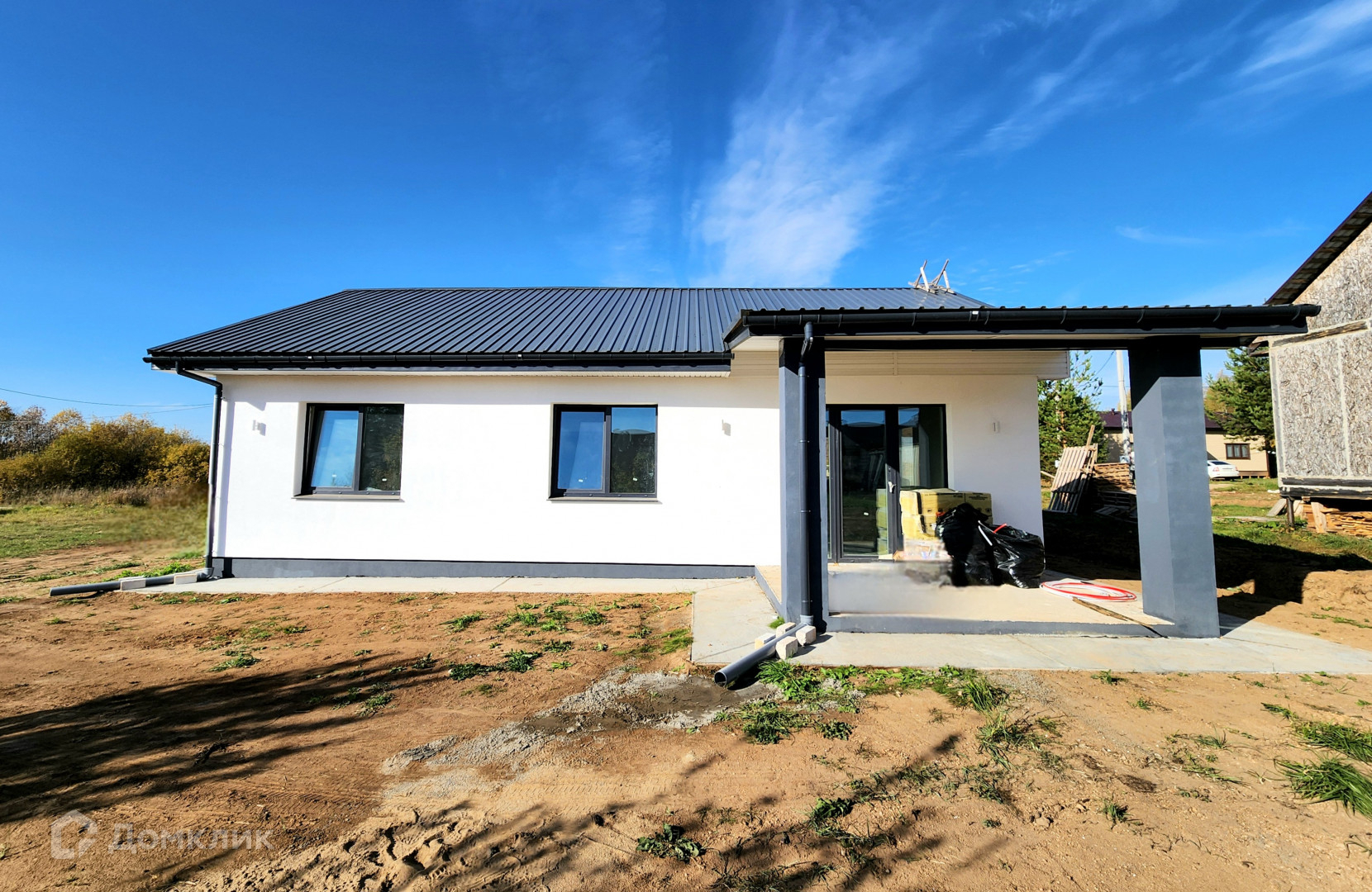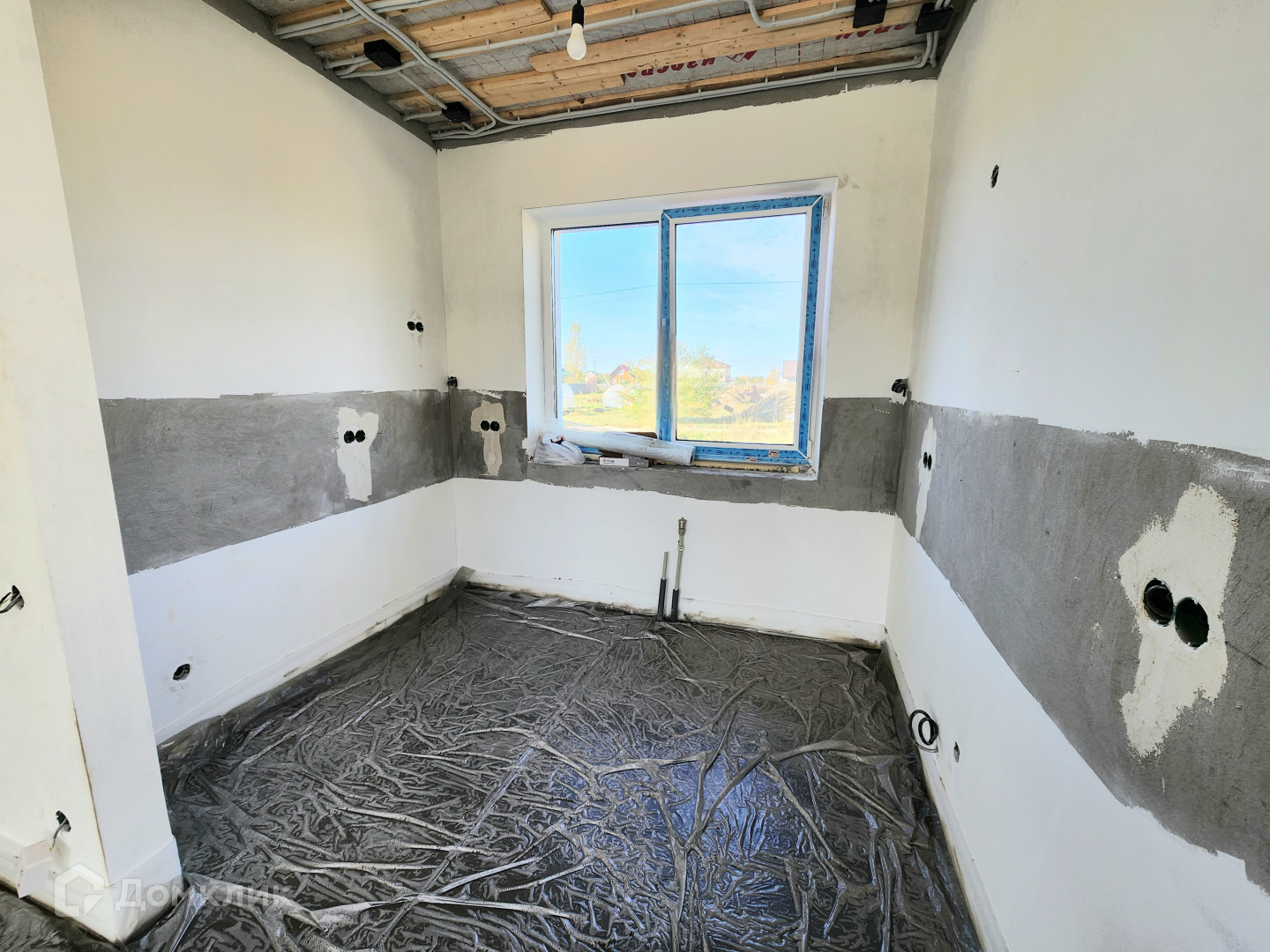 Дом готов, из газосиликатного блока 300, утеплен базальтовой ватой 100мм, мокрый фасад Кrеizеl, по планировке кухня-гостиная и 3 изолированные комнаты. Сделана предчистовая отделка, штукатурка  и шпаклевка стен, теплые полы, стяжка пола, установлены мульти окна 70 мм, качественная входная дверь 2300мм с терморазрывом "Стальной портье". Декоративный фасад с утеплением 100 мм, утепление по потолку 200 мм, отмостка утепленная. Фасад дома с подсветкой. Сделан септик, центральный водопровод. Выполнена электрика под ключ.