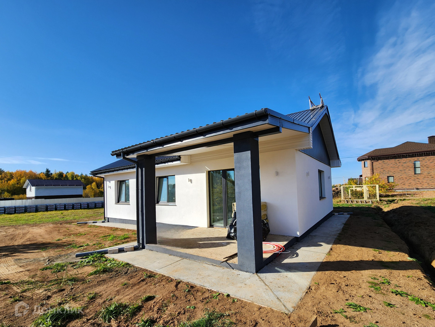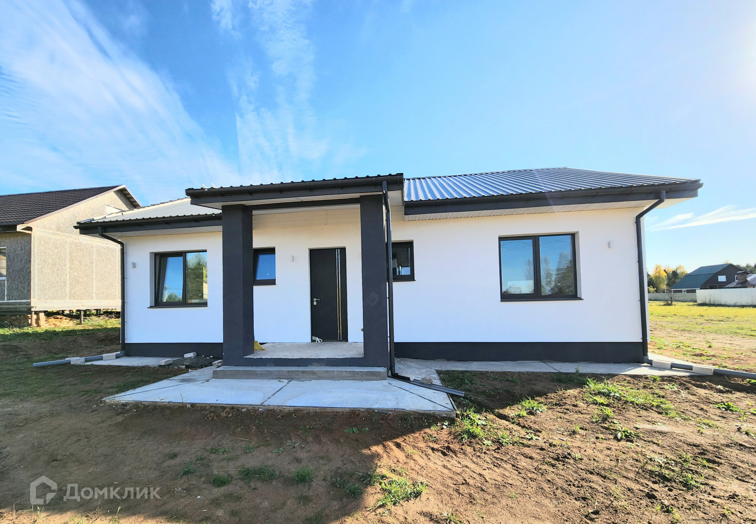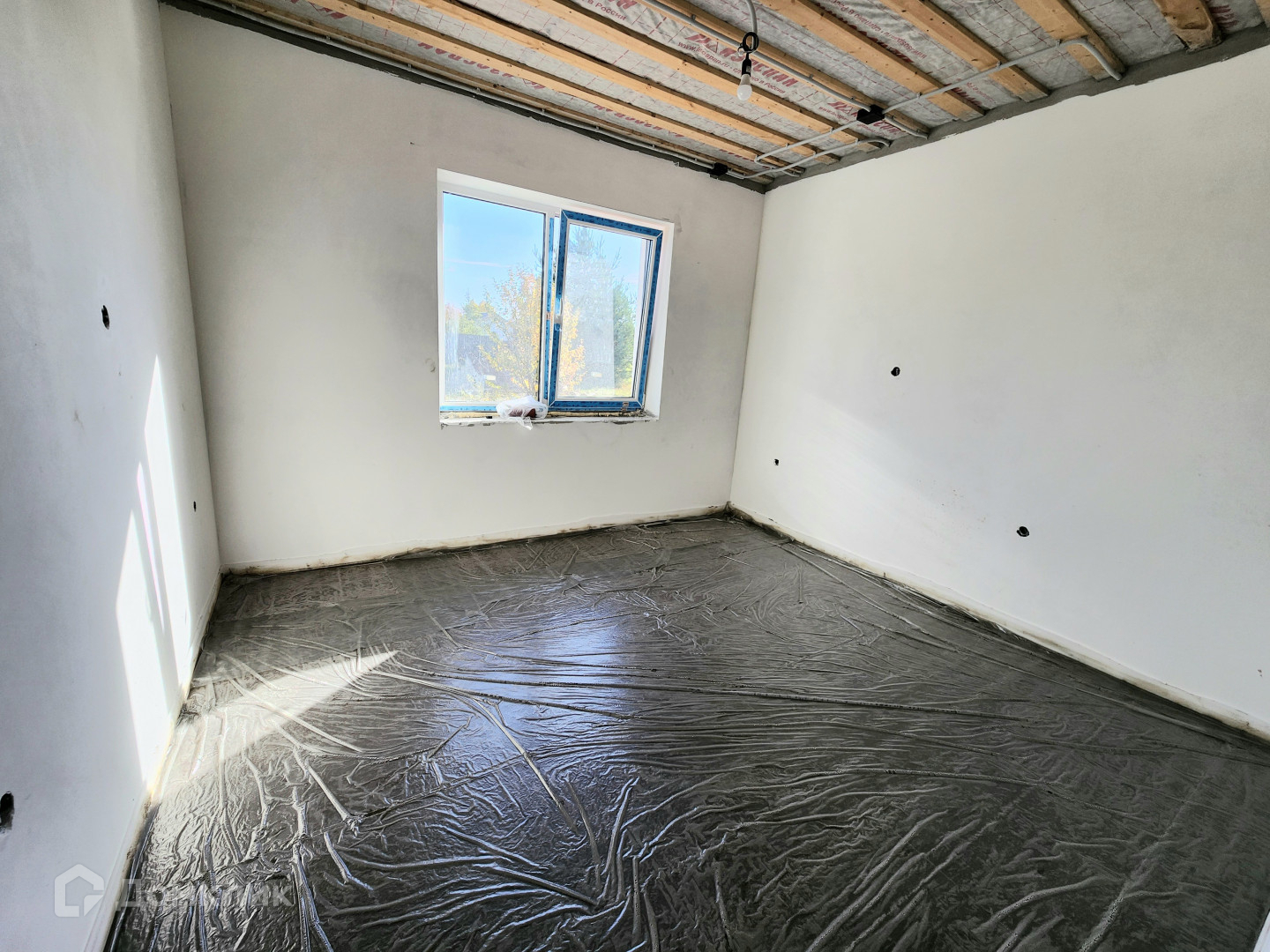 Дом готов, из газосиликатного блока 300, утеплен базальтовой ватой 100мм, мокрый фасад Кrеizеl, по планировке кухня-гостиная и 3 изолированные комнаты. Сделана предчистовая отделка, штукатурка  и шпаклевка стен, теплые полы, стяжка пола, установлены мульти окна 70 мм, качественная входная дверь 2300мм с терморазрывом "Стальной портье". Декоративный фасад с утеплением 100 мм, утепление по потолку 200 мм, отмостка утепленная. Фасад дома с подсветкой. Сделан септик, центральный водопровод. Выполнена электрика под ключ.