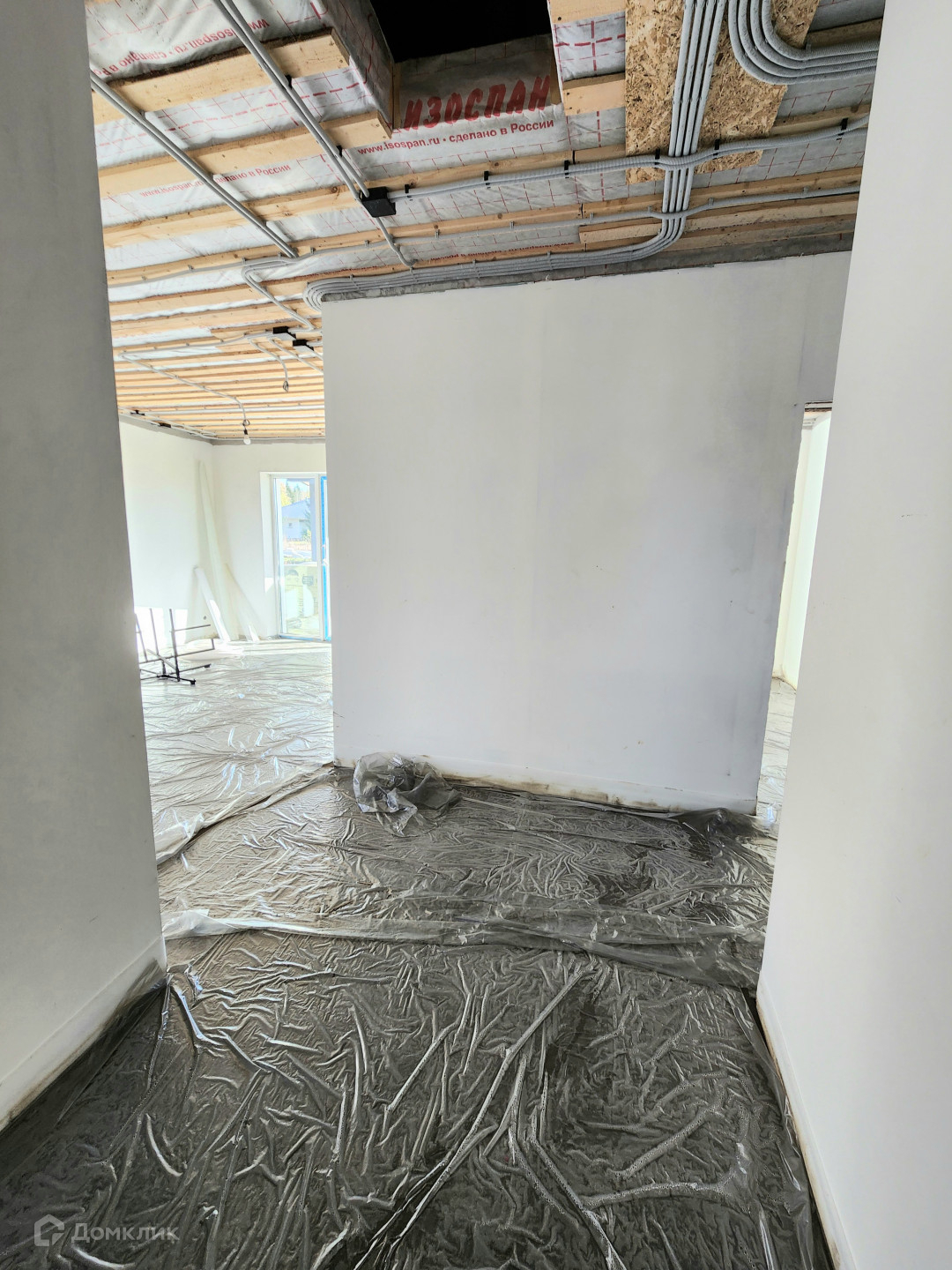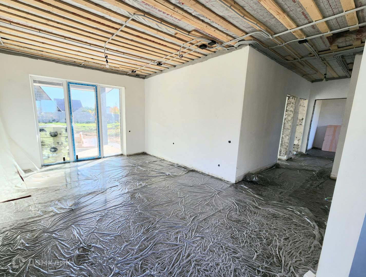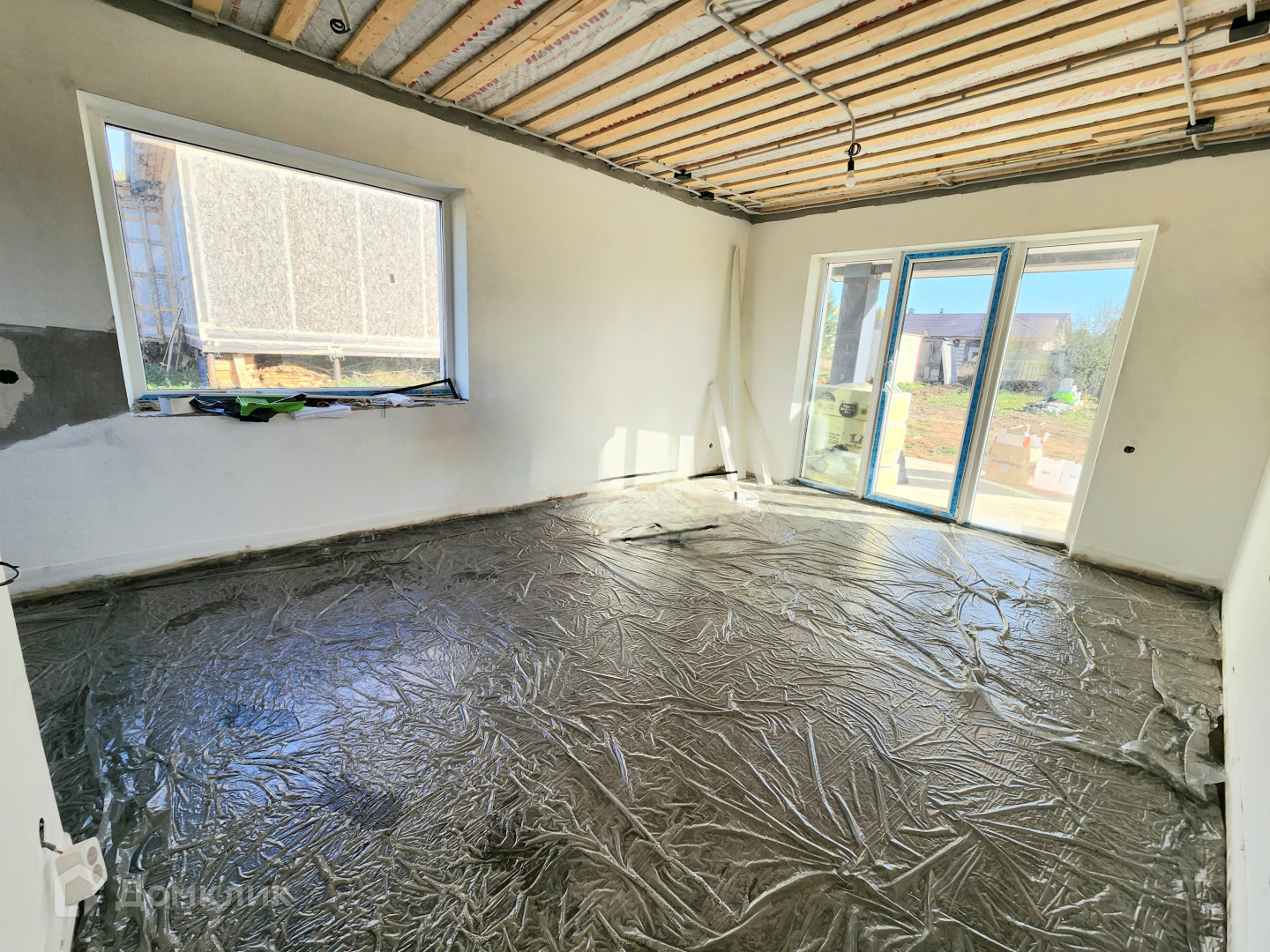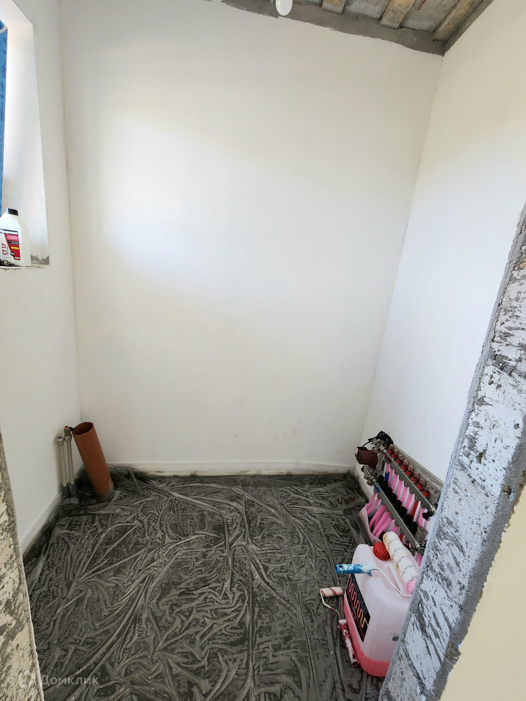 Дом готов, из газосиликатного блока 300, утеплен базальтовой ватой 100мм, мокрый фасад Кrеizеl, по планировке кухня-гостиная и 3 изолированные комнаты. Сделана предчистовая отделка, штукатурка  и шпаклевка стен, теплые полы, стяжка пола, установлены мульти окна 70 мм, качественная входная дверь 2300мм с терморазрывом "Стальной портье". Декоративный фасад с утеплением 100 мм, утепление по потолку 200 мм, отмостка утепленная. Фасад дома с подсветкой. Сделан септик, центральный водопровод. Выполнена электрика под ключ.