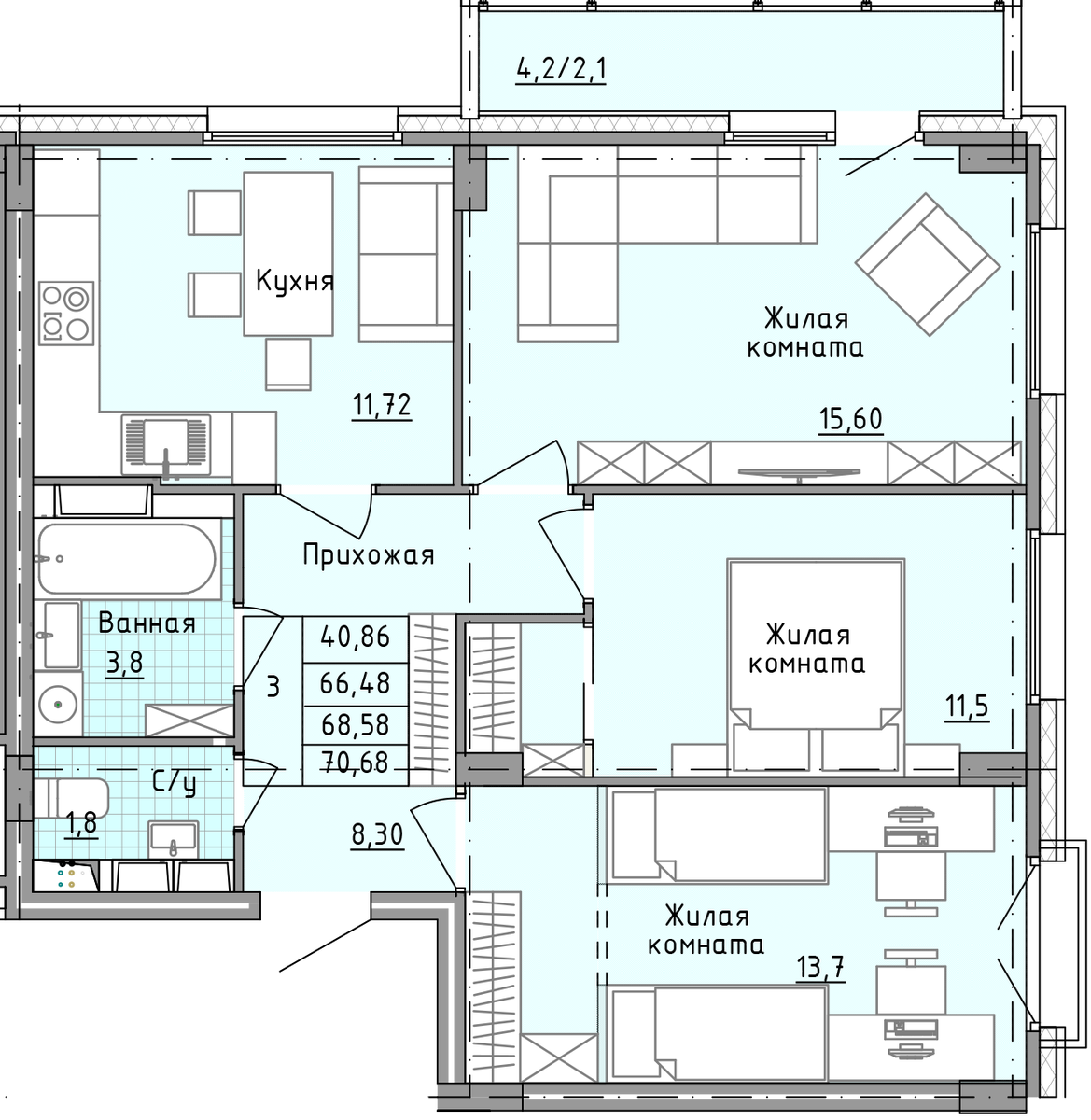 Общая площадь 70.7 м2