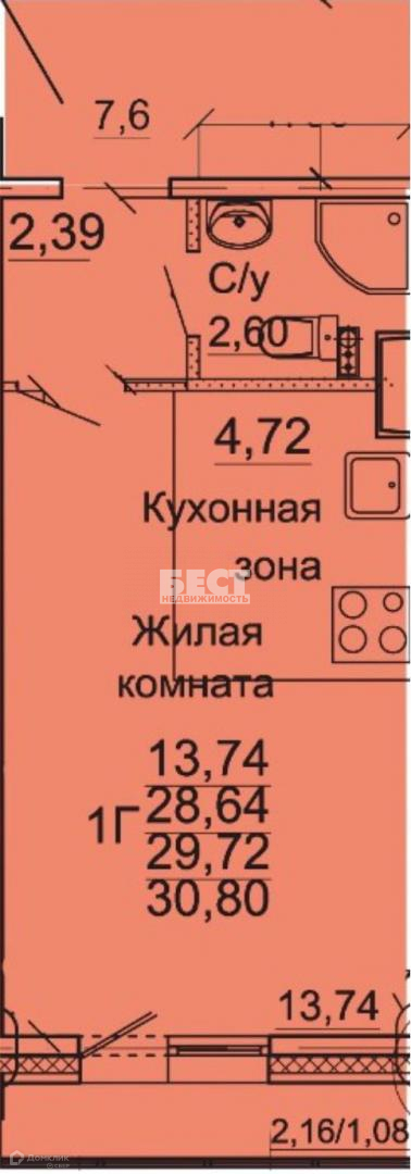 Комната 13.74 кв.м, кухня 4.72 кв.м, санузел совмещенный, удобная прихожая с гардеробной.