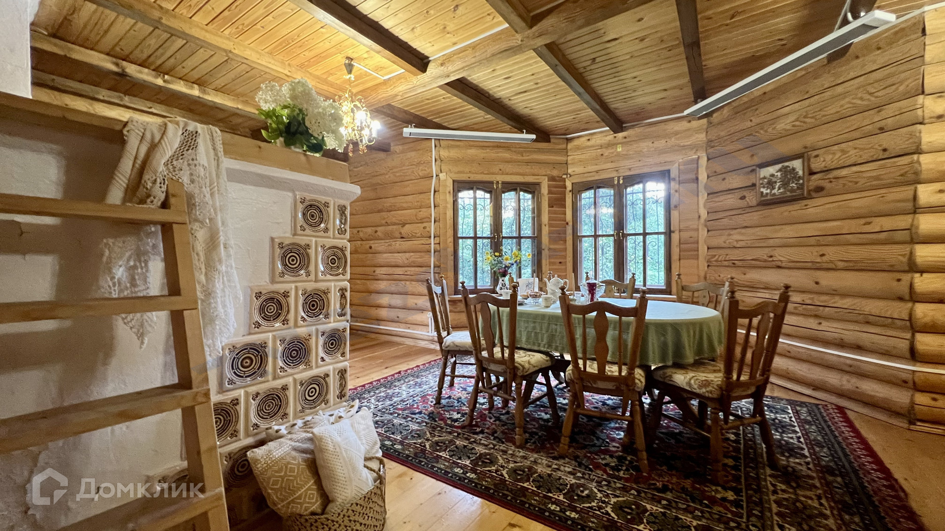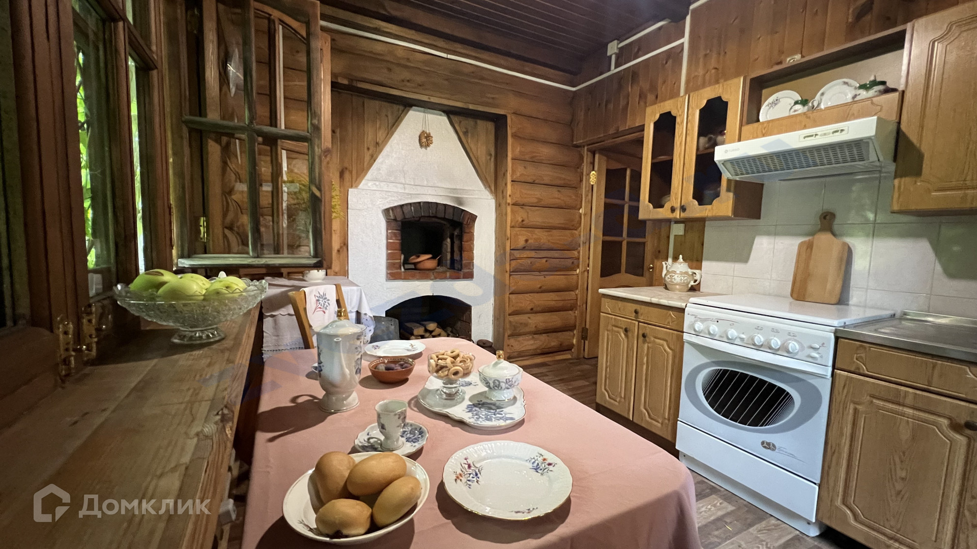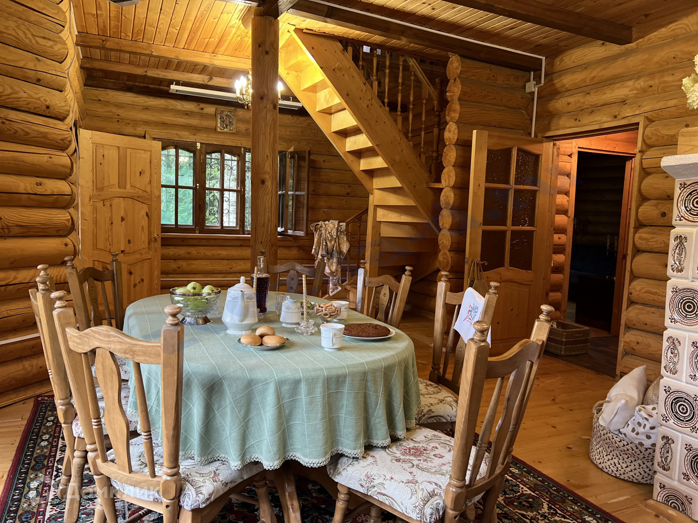 Дом бревенчатый около 140 м2, двухэтажный. Комнат 5: гостиная с эркером, спальня на 1 этаже, кабинет, две спальни на втором этаже. Кухня с печью в которой вы сможете выпекать хлеб и пирожки, а может и приготовите кашу в горшке.