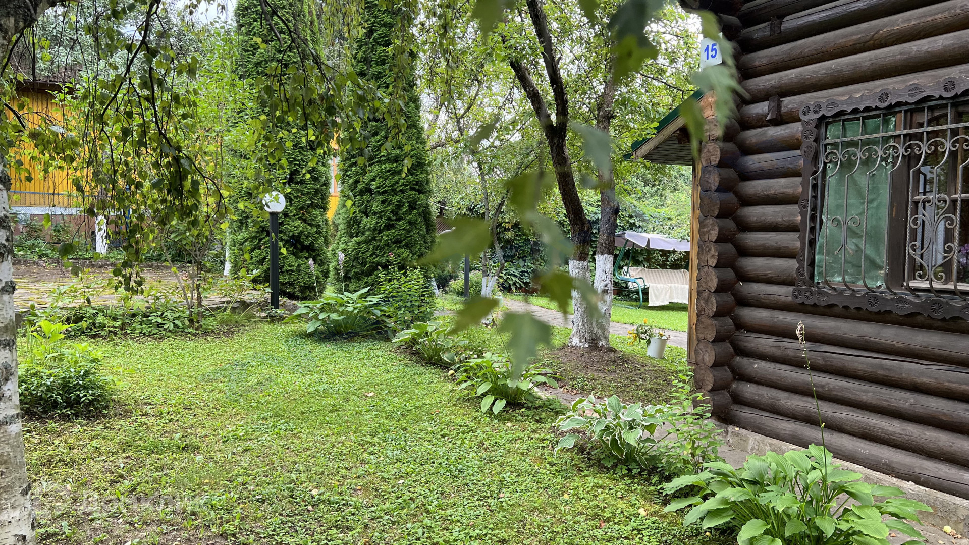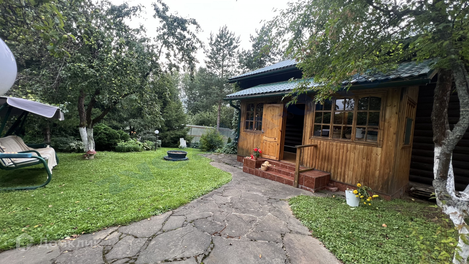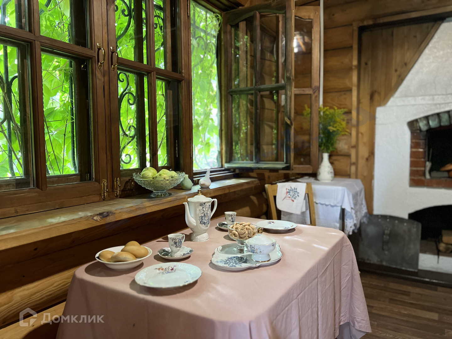На ухоженном участке, уже разросшийся сад, посреди которого стоит русский терем с невероятной печью, украшенной изразцами, с палатями.