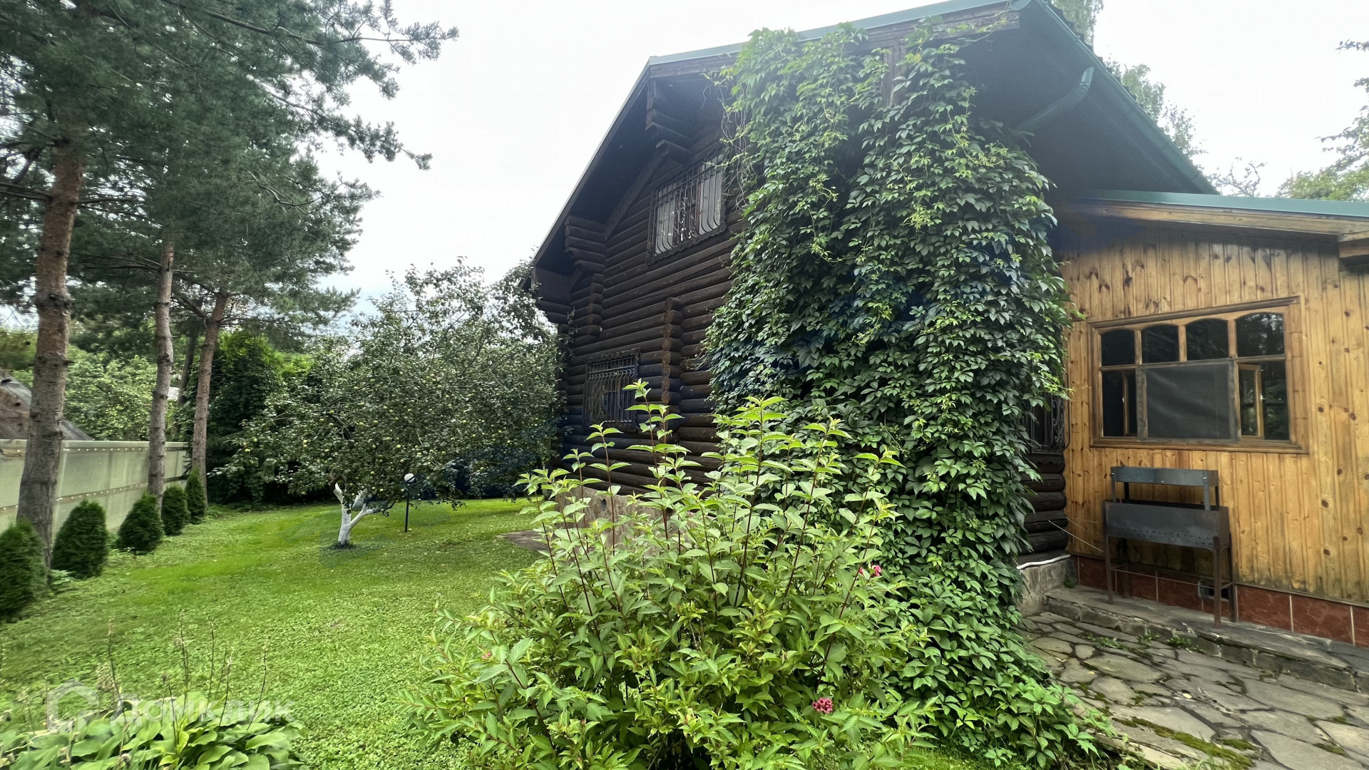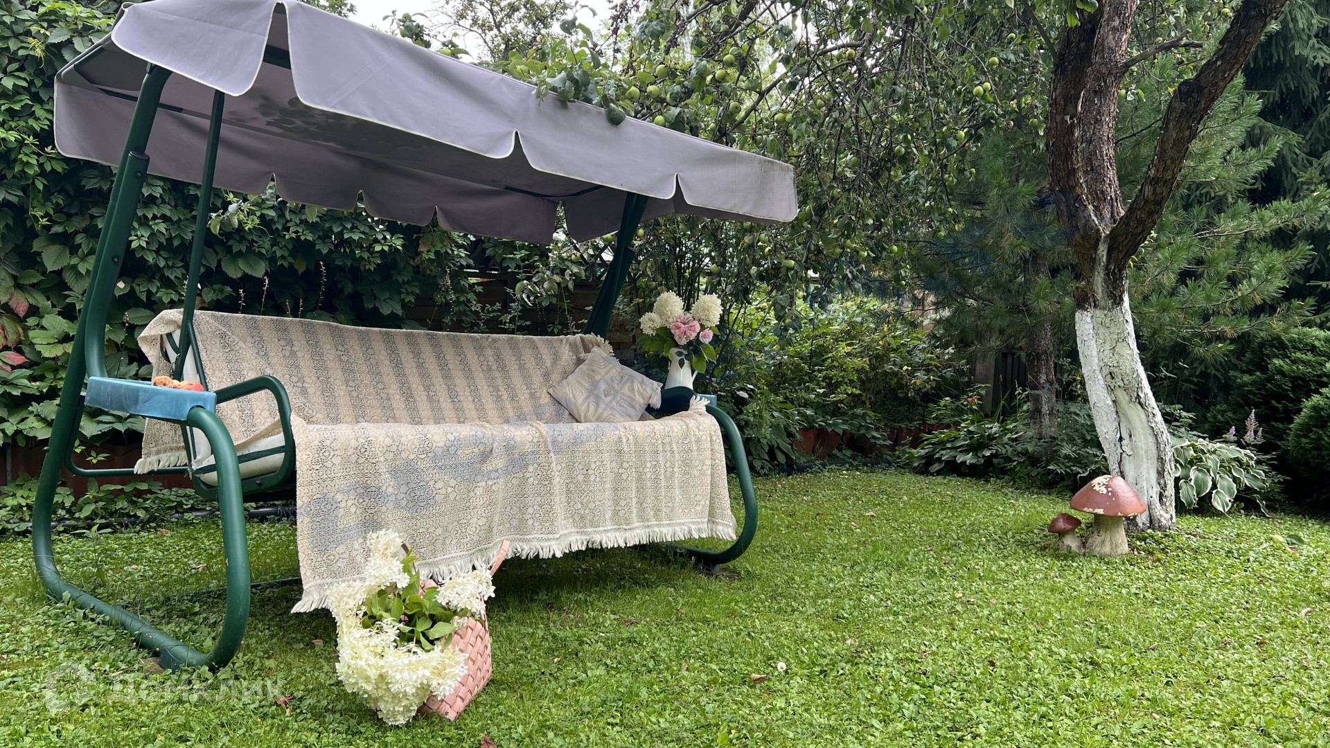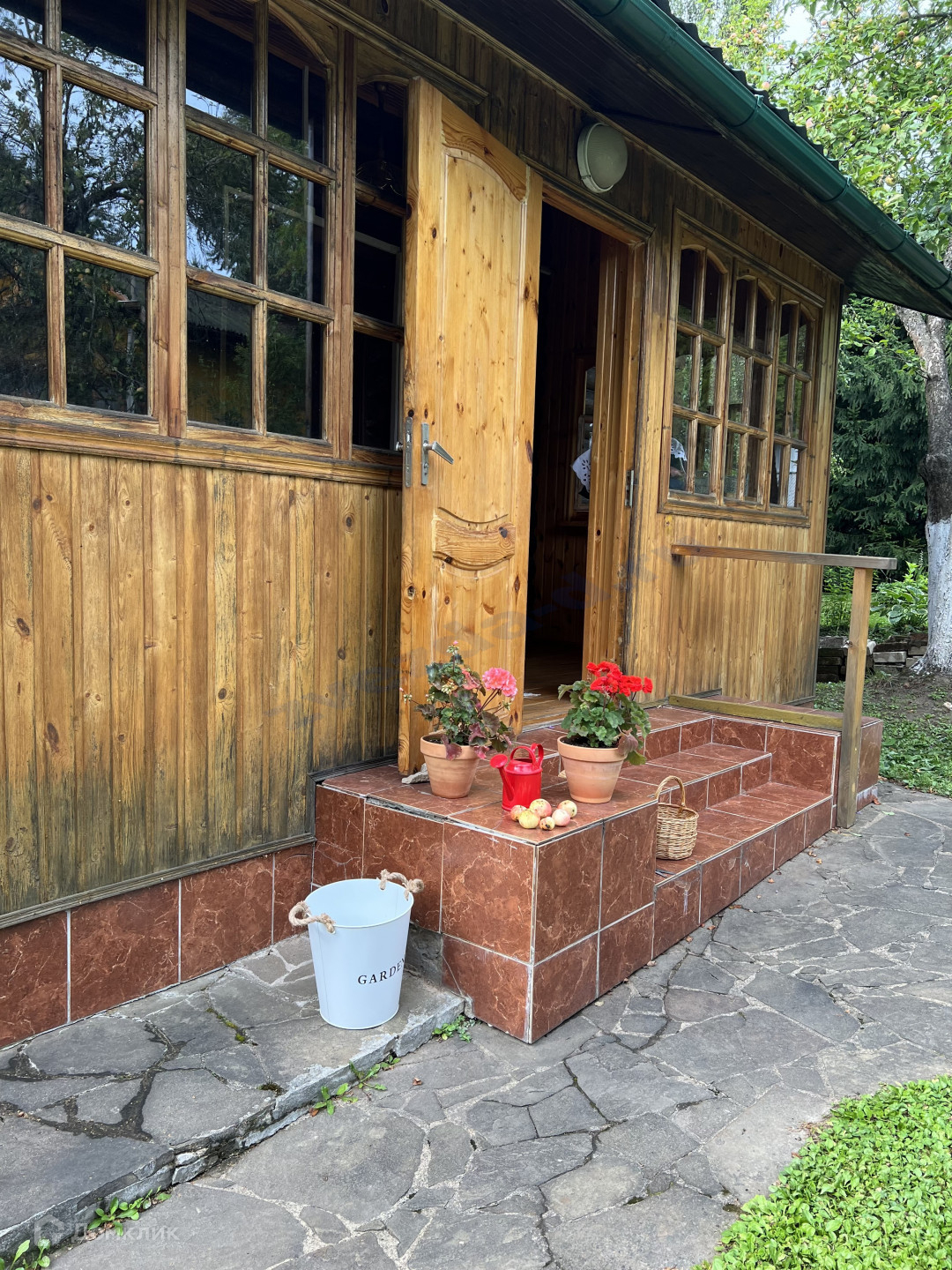 На ухоженном участке, уже разросшийся сад, посреди которого стоит русский терем с невероятной печью, украшенной изразцами, с палатями.