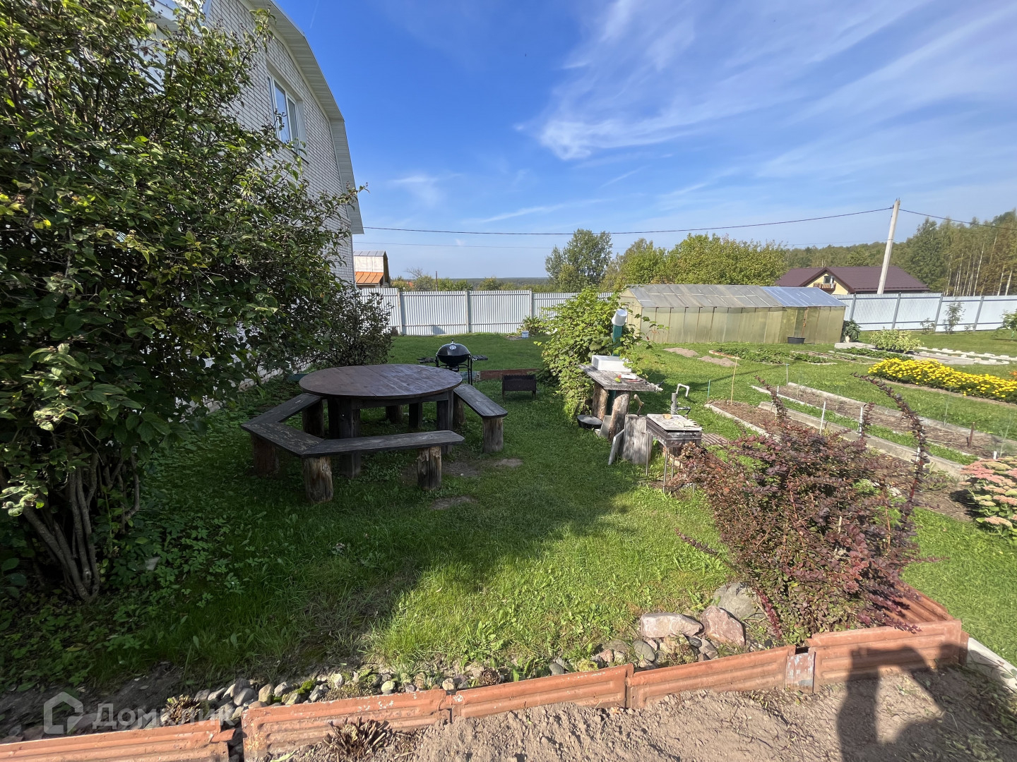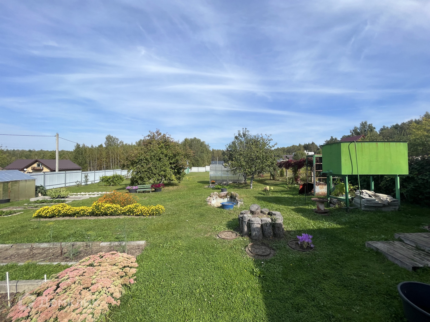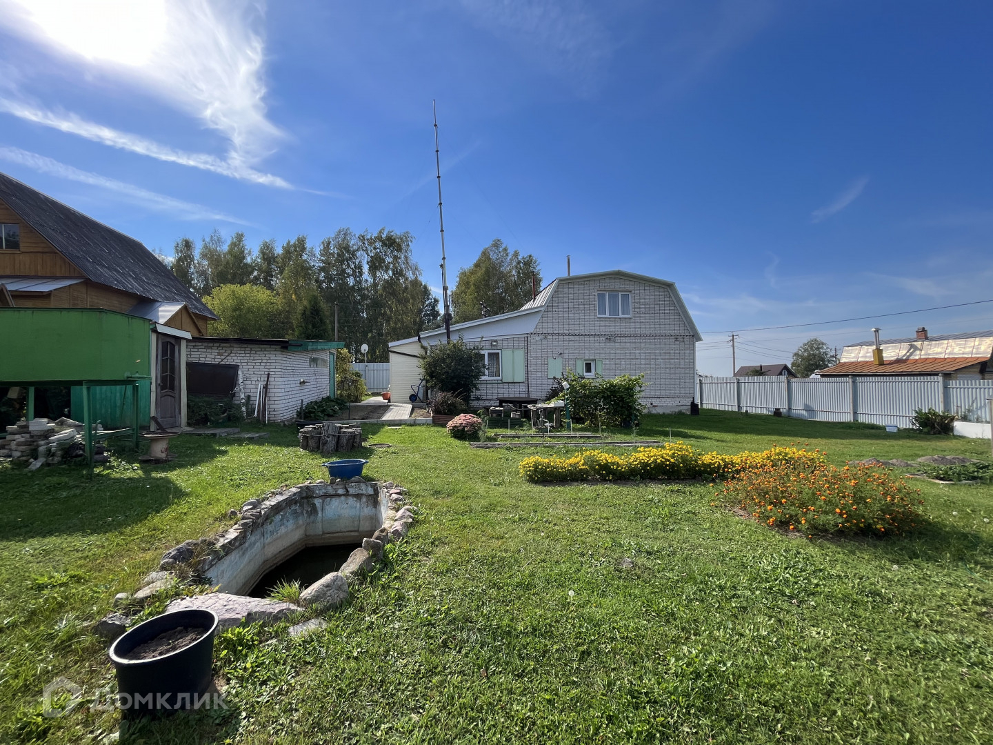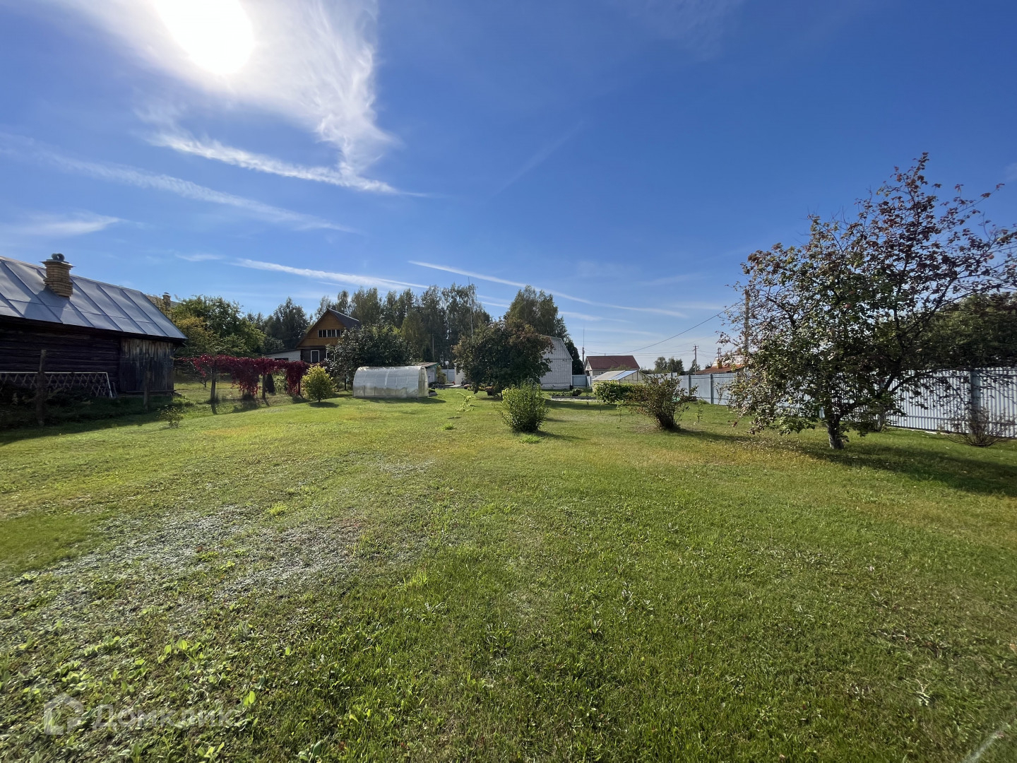 На участке : хорошая действующая баня, зона отдыха, туалет, кирпичная хоз. постройка, теплица, цветы, яблони, груши .