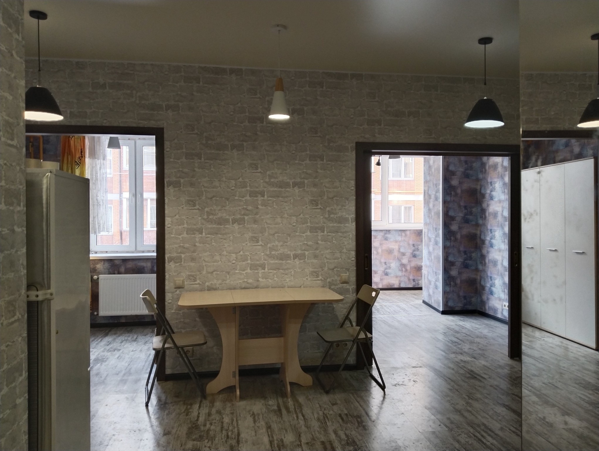 Две спальни + кухня-гостинная. Санузел совмещенный в кафеле. Балкон утеплен и присоединен к общей площади. Отопление и горячая вода автономные, от автоматического газ.котла, квартира - теплая. Пол: в прихожей и санузле плитка, в остальной части квартиры износостойкий ламинат 33 класса приятного цвета старый дуб. Потолок натяжной со встроенным светом (на балконе покрашен). Стены - обои. На окнах рулонные шторы. По умолчанию оставляю кухонный гарнитур.