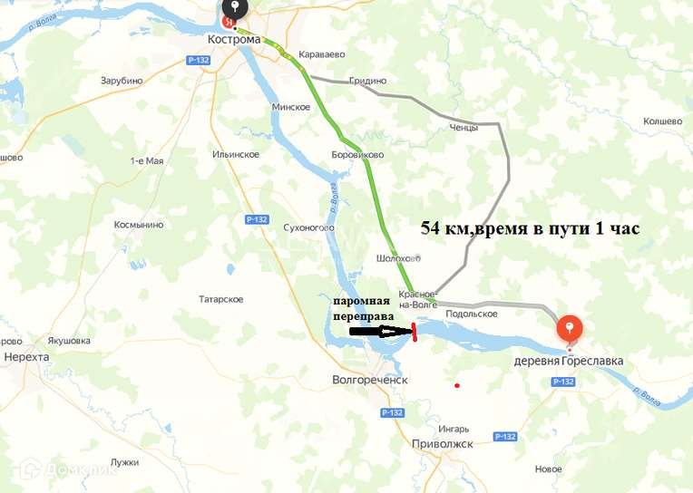 Участок граничит с деревней Гореславка от Костромы до посёлка 54 км. ведёт асфальтированная дорога по времени занимает 1 час езды . Отличное место для постройки базы отдыха.