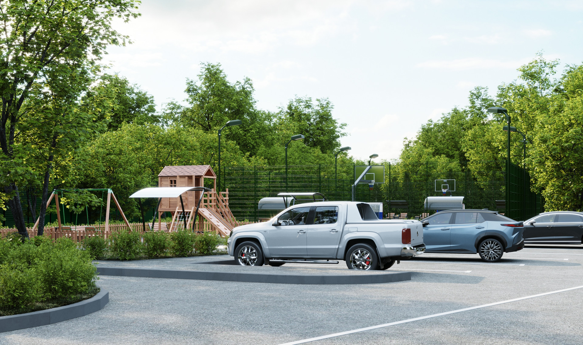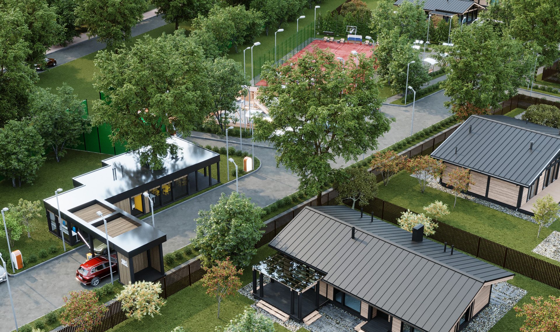 Инфраструктура внутри поселка предусматривает многофункциональную спортивную площадку, workout зону, детскую игровую площадку