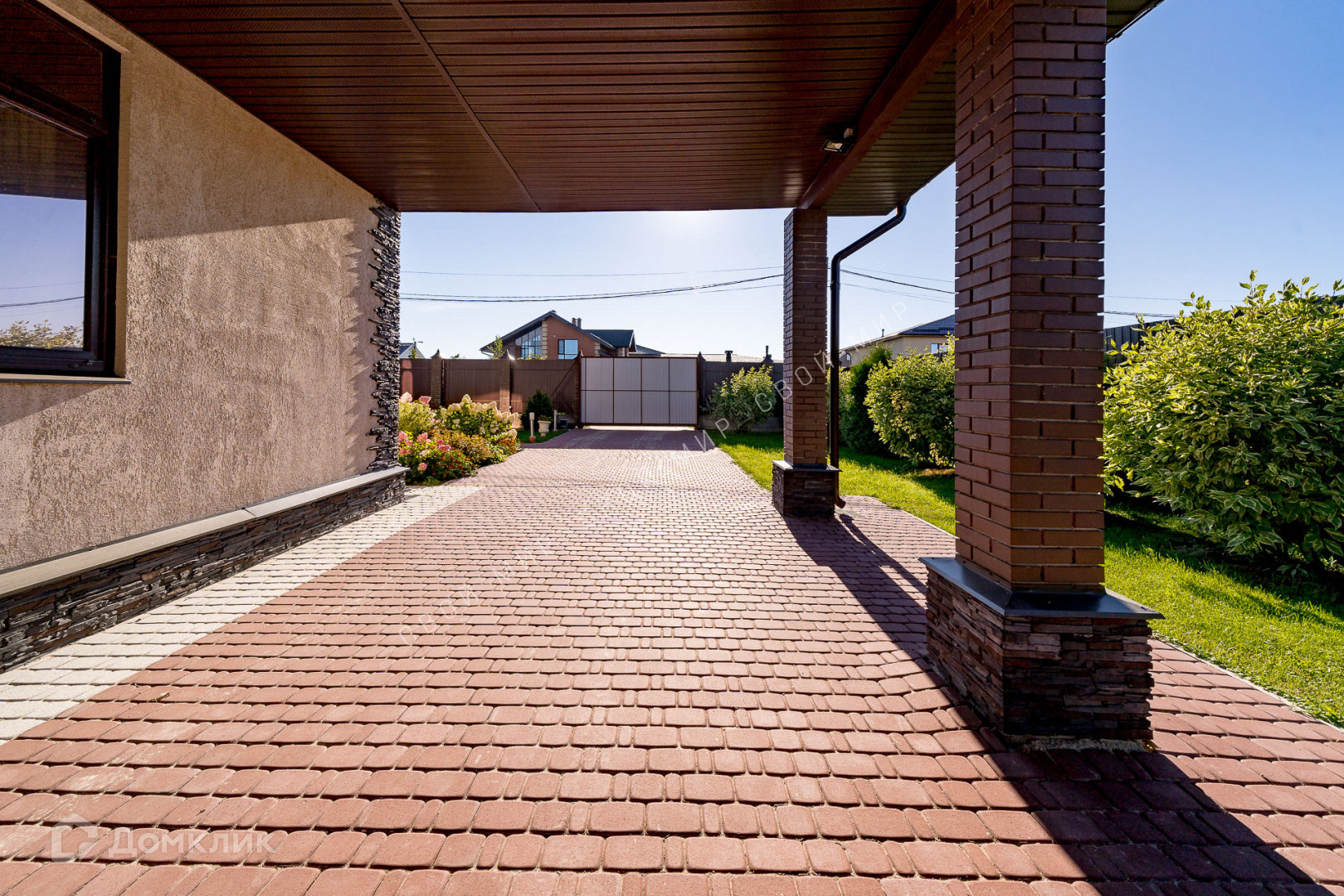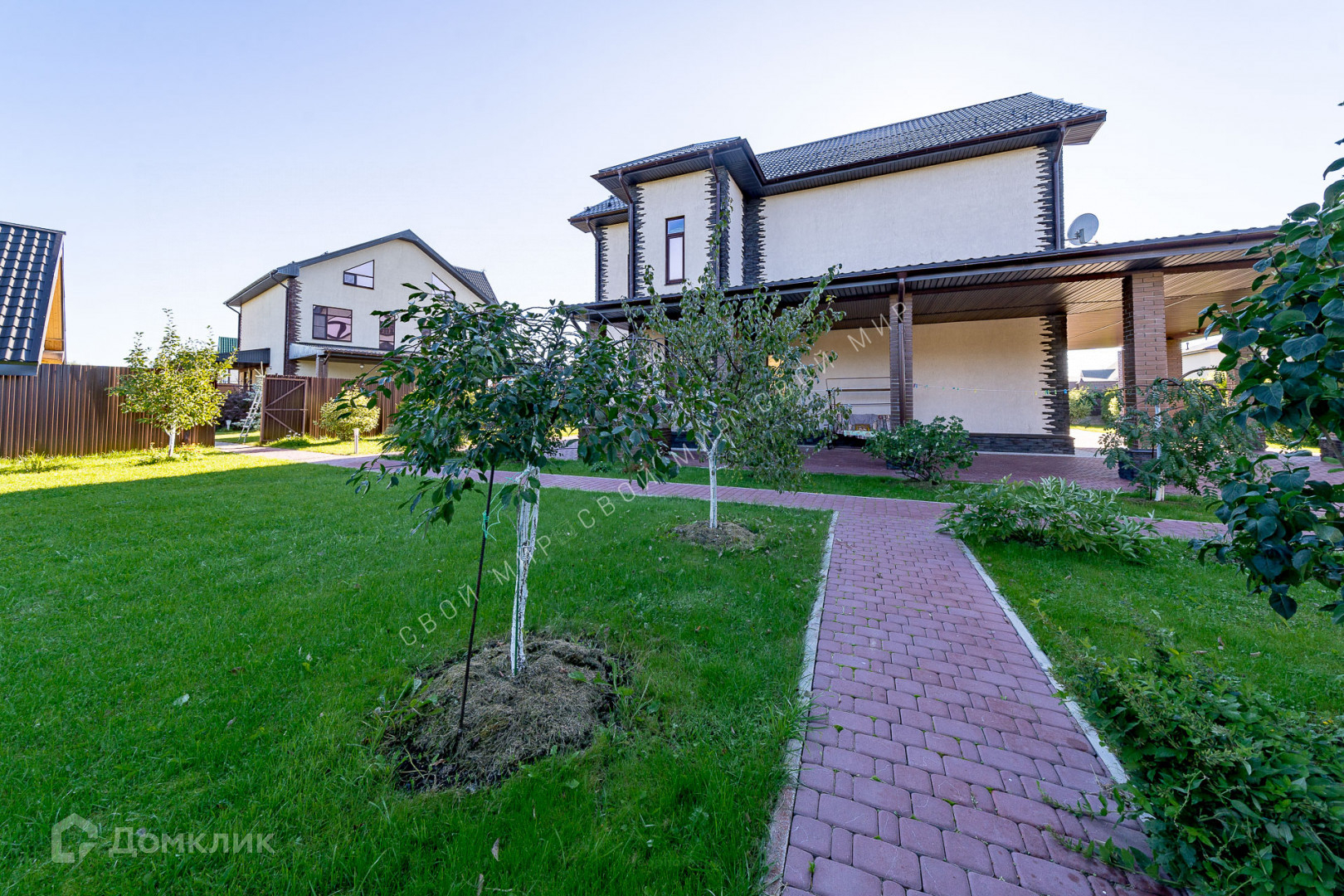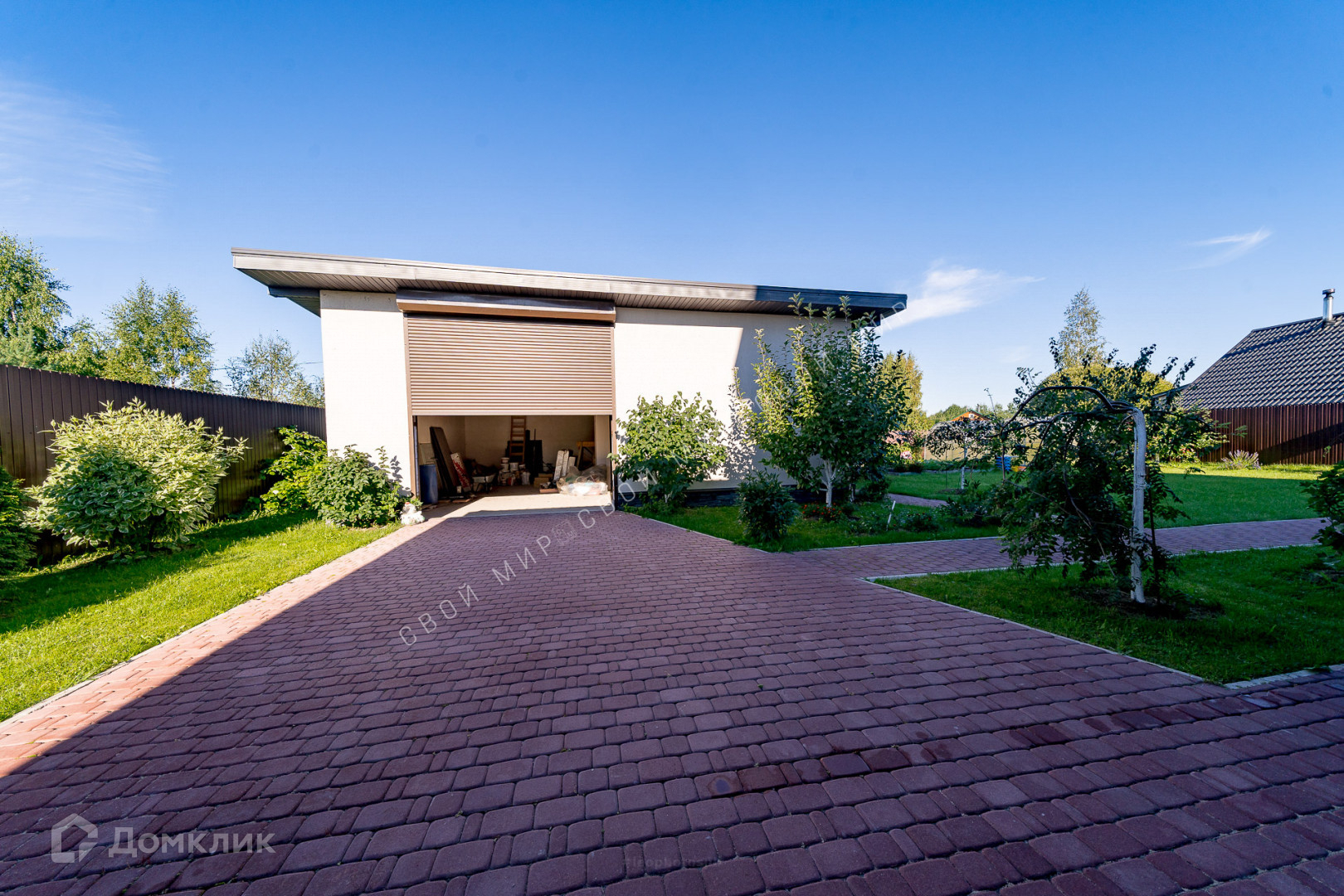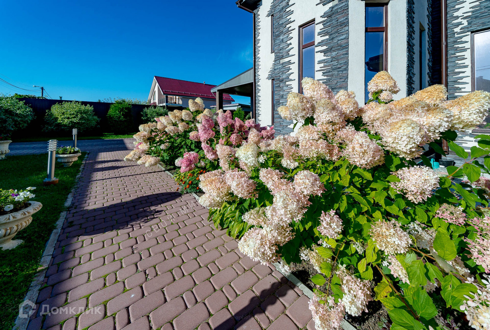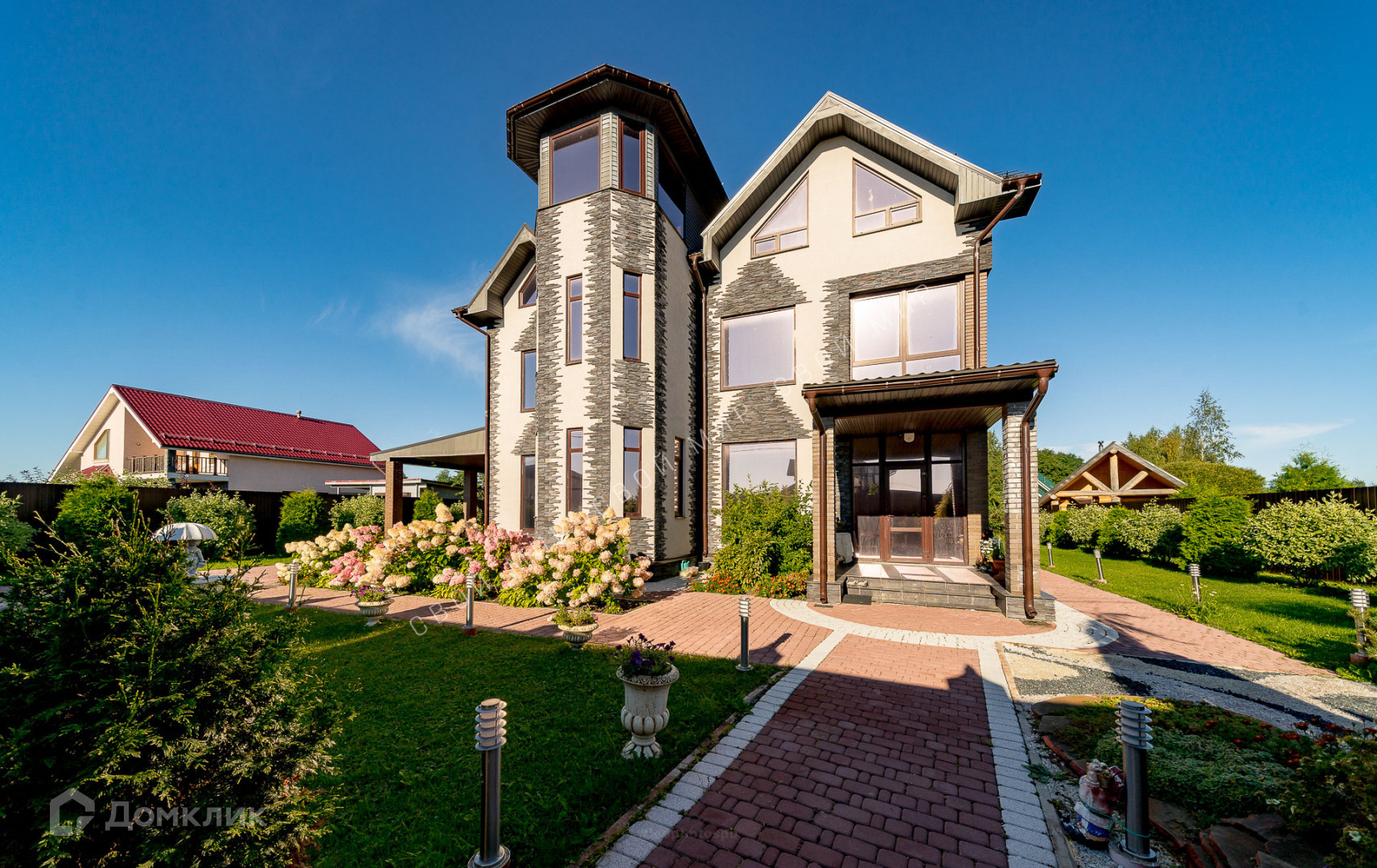 На участке установлен фонтан и садовые скульптуры, произведена современная дизайнерская уличная подсветка. Садовые дорожки и зоны отдыха выложены итальянской тротуарной плиткой по всему периметру участка.