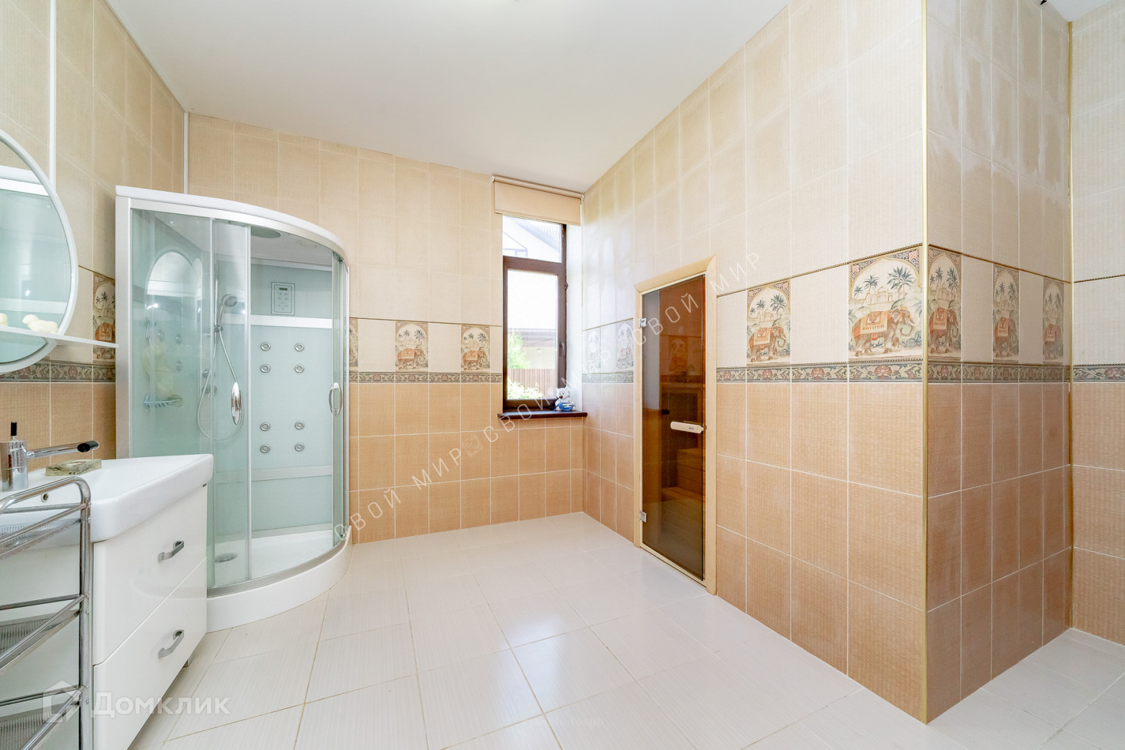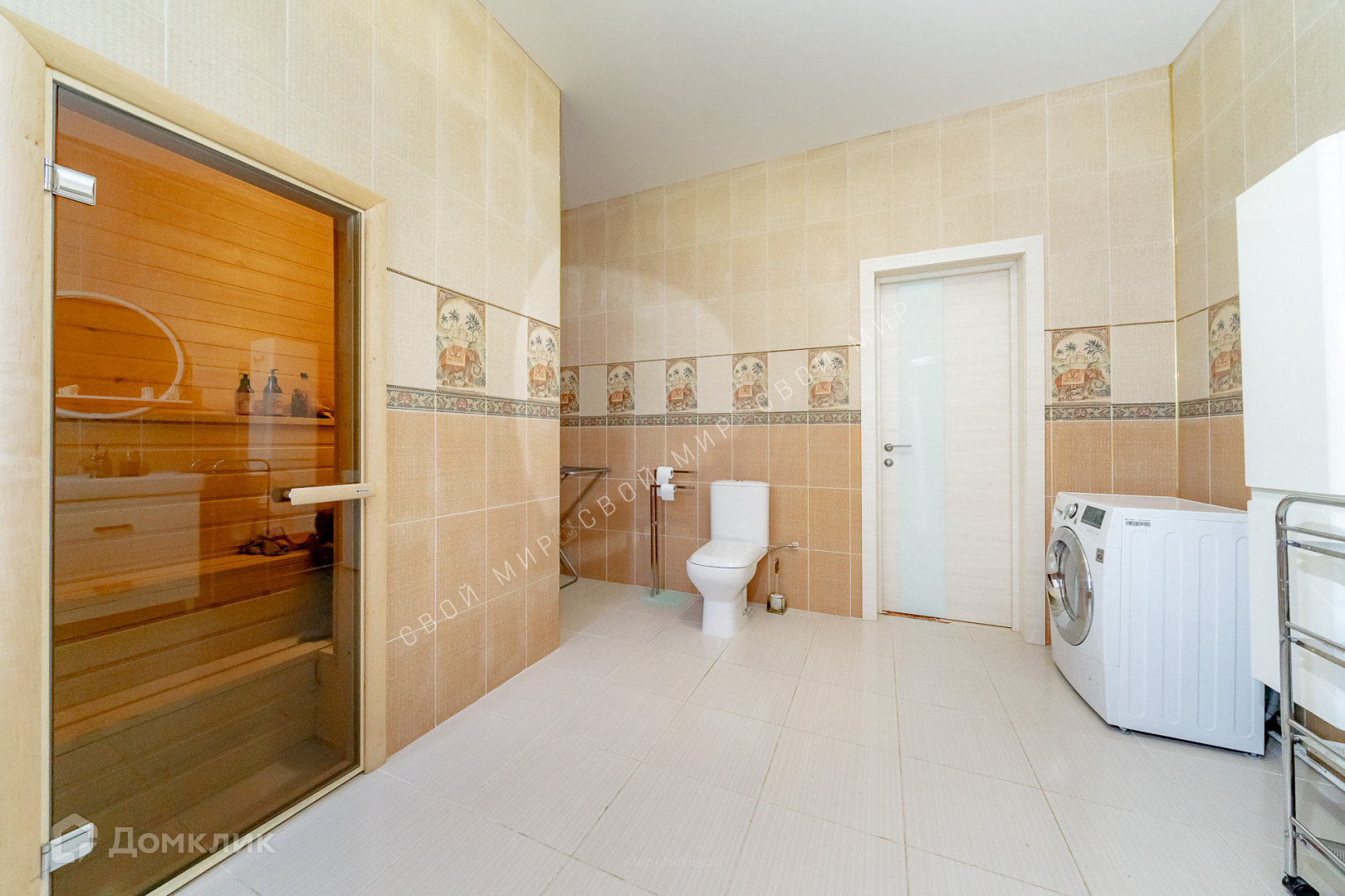 На первом этаже расположены: прихожая, гардеробная, просторная кухня-столовая с обеденной зоной и гостиная с большим телевизором и зоной отдыха, санузел, ванная комната с душевой кабиной и просторная современная сауна.