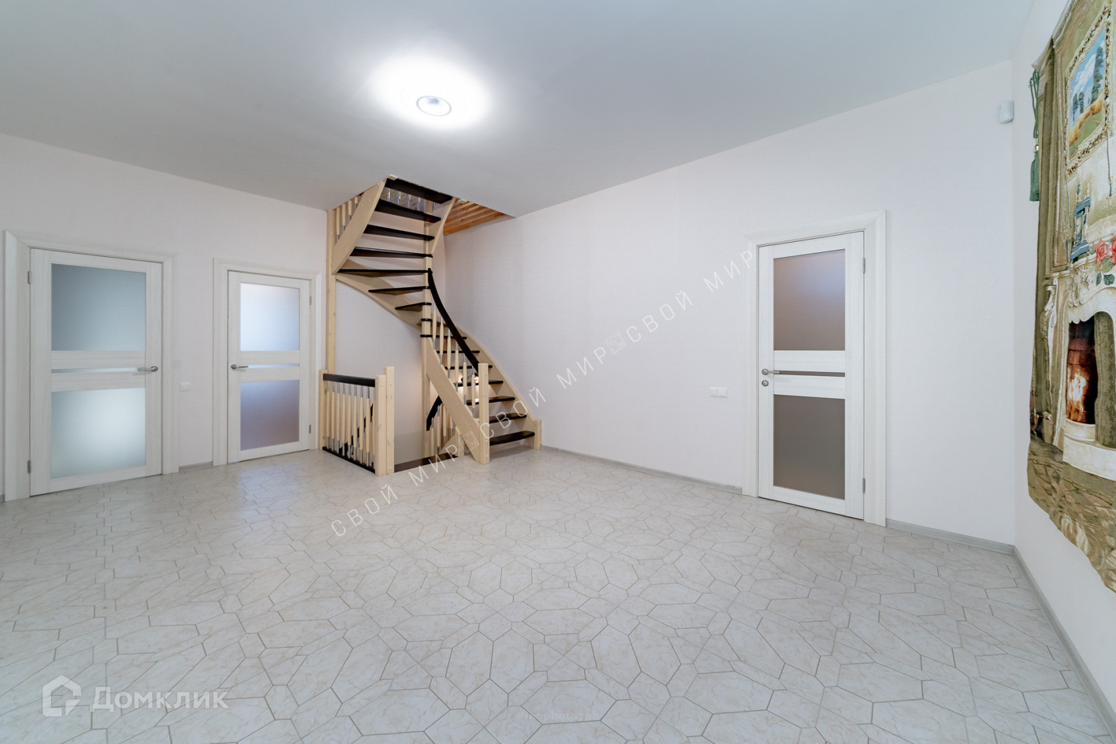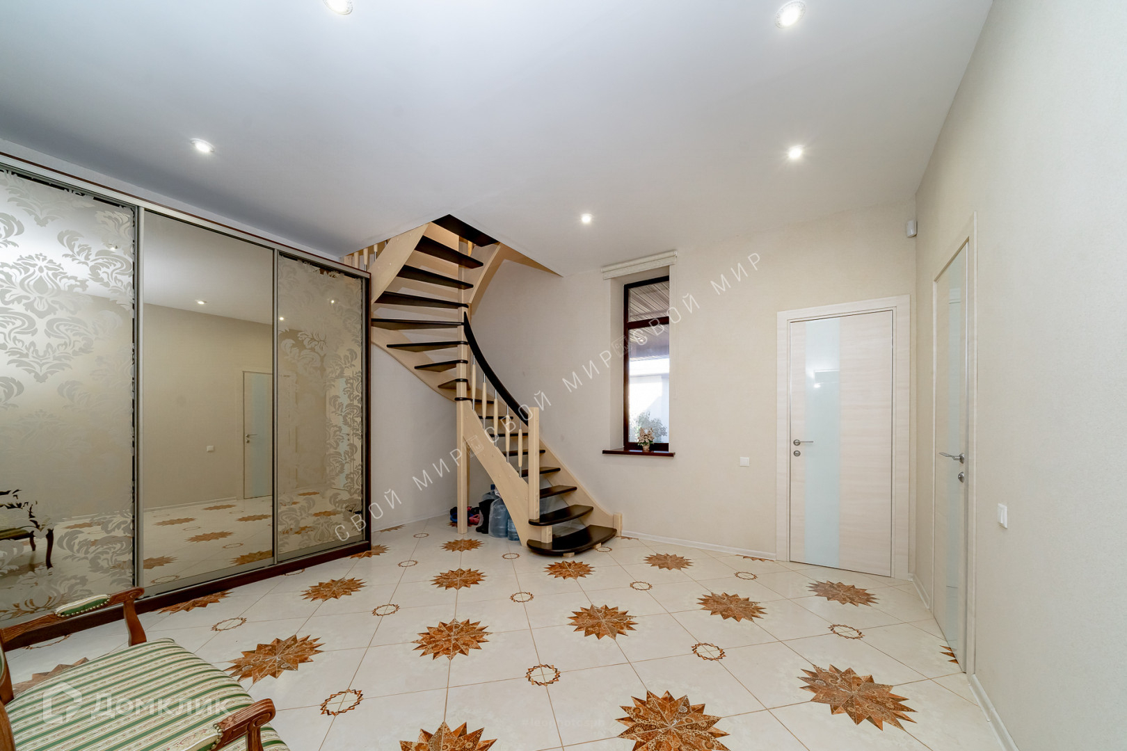 Полувинтовая лестница из натурального дерева ведёт на второй этаж.