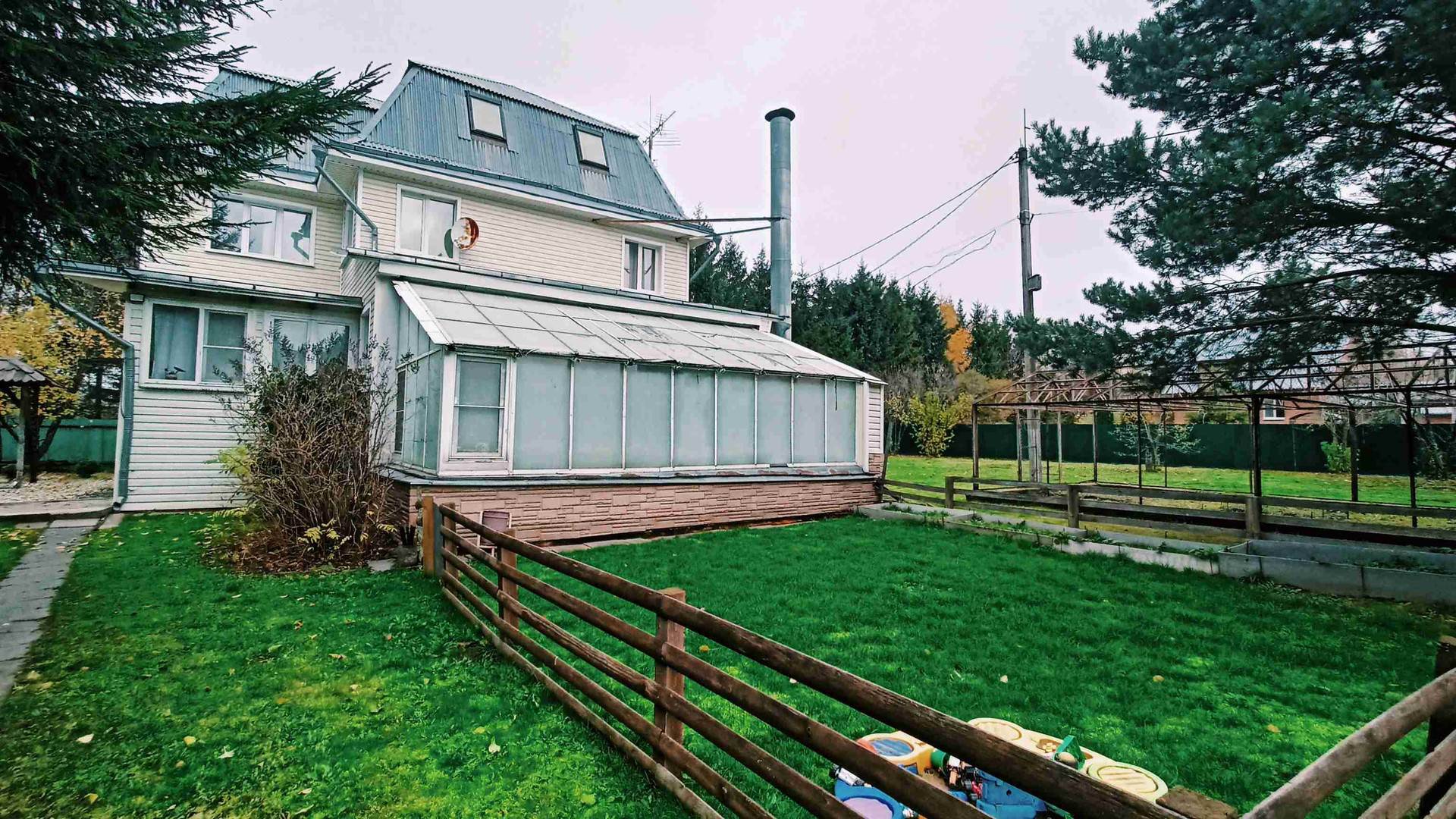 Участок ровный, ухоженный, окружён высокими елями, что создаёт атмосферу уюта и уединения. Забор и ворота металлические.