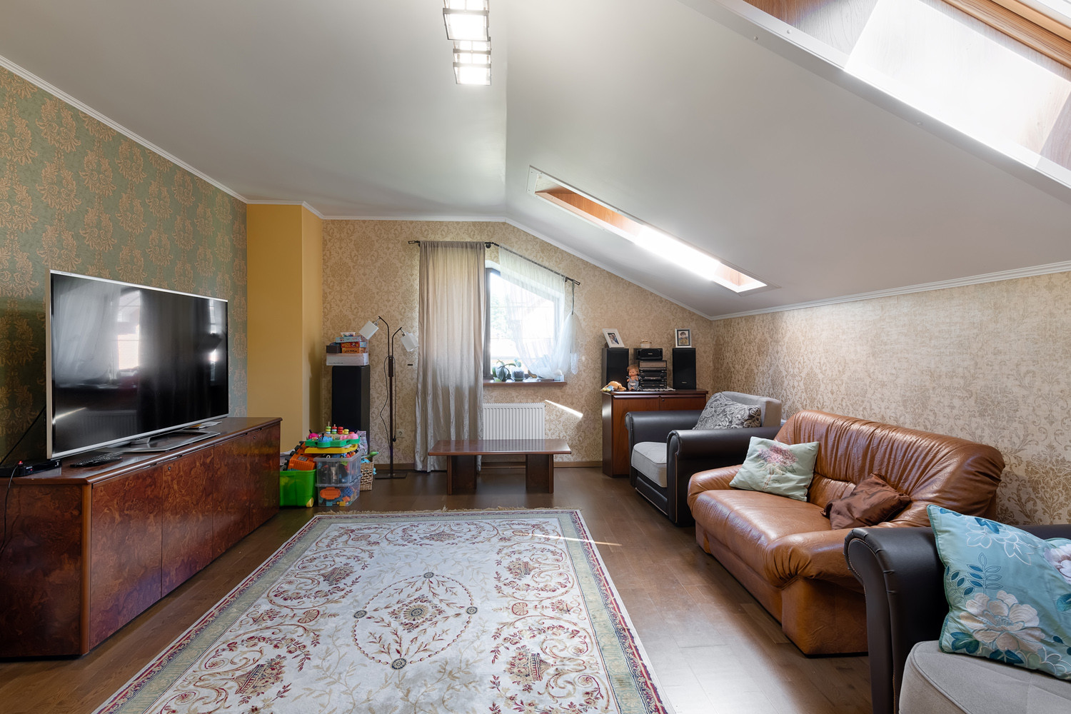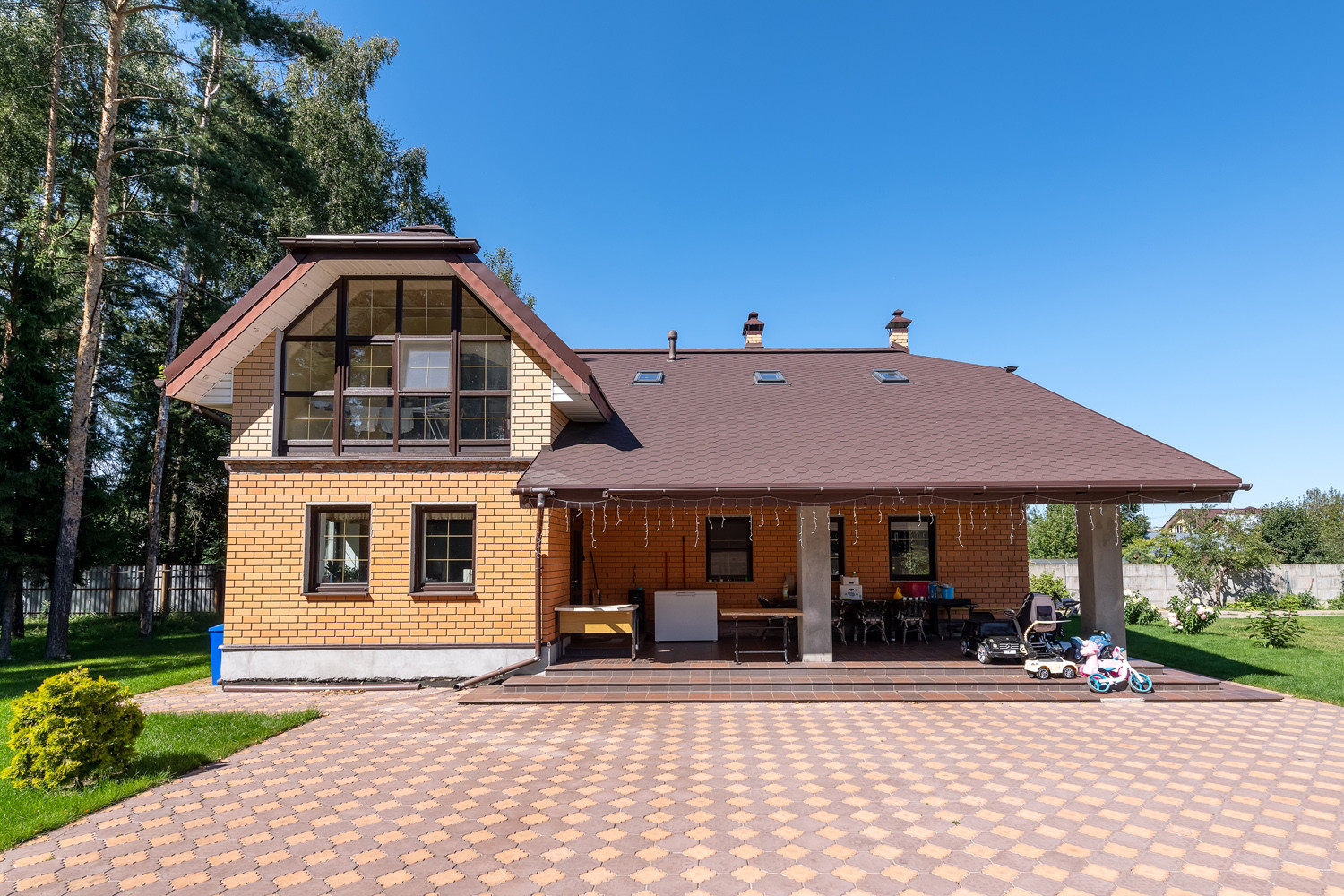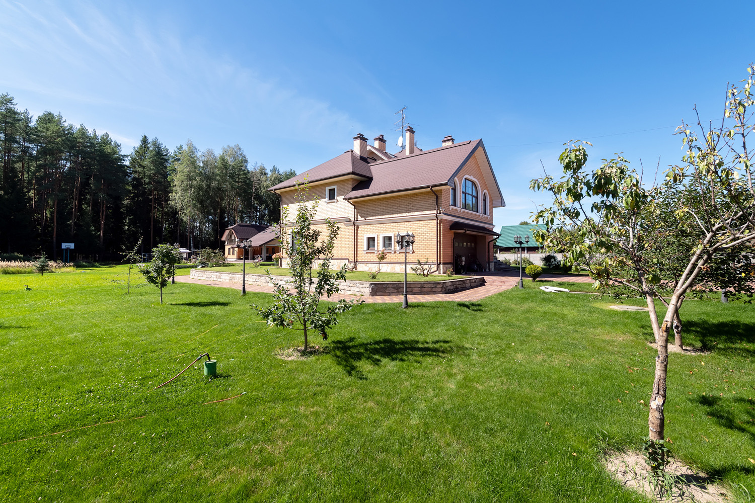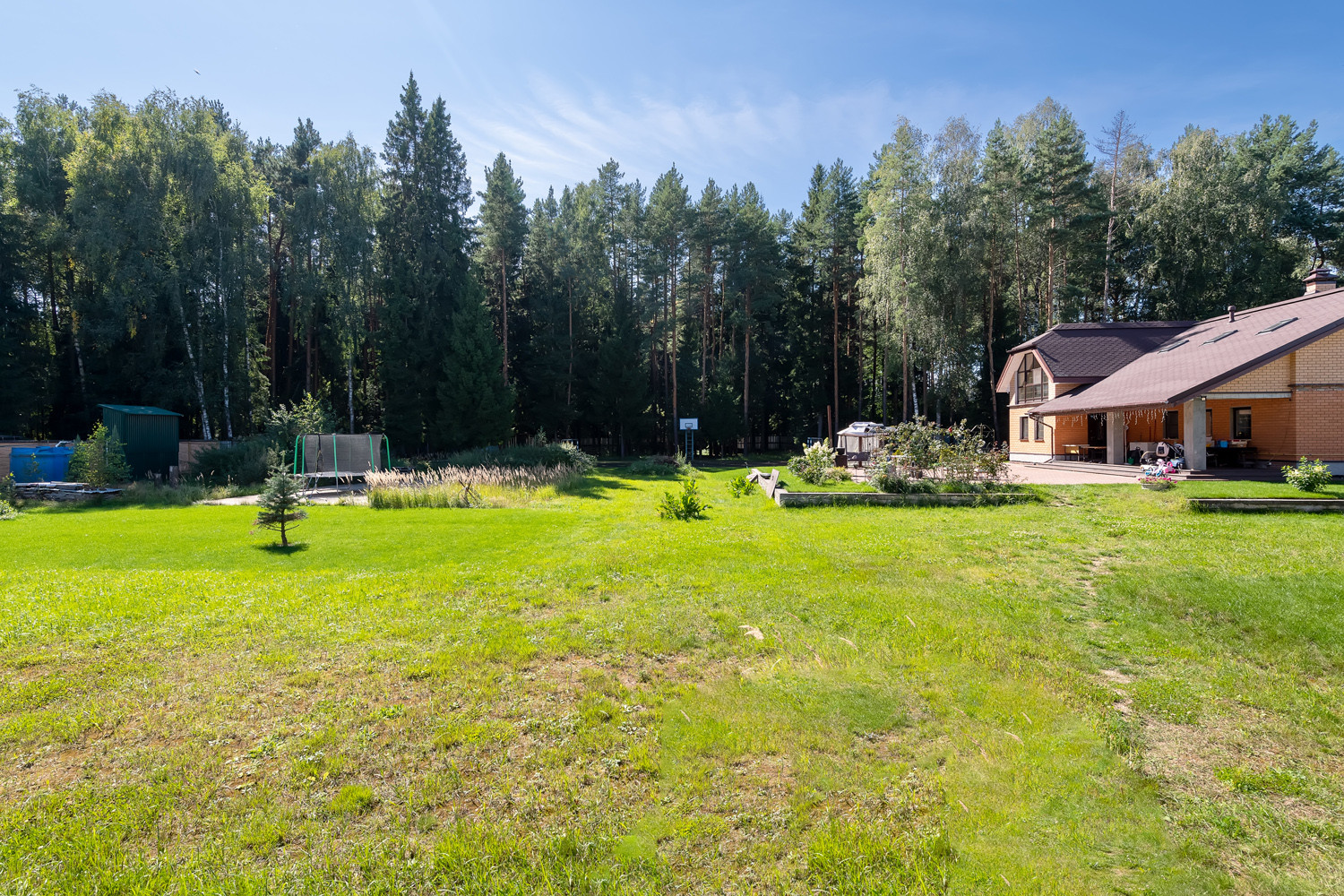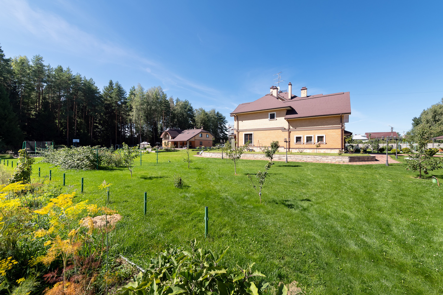 Участок очень просторный и ухоженный, ровный газон, много плодово-ягодных деревьев, такие как голубика, малина, смородина. Виноградники в количестве 25и штук. Установлен автополив. Есть клумбы с цветами.
