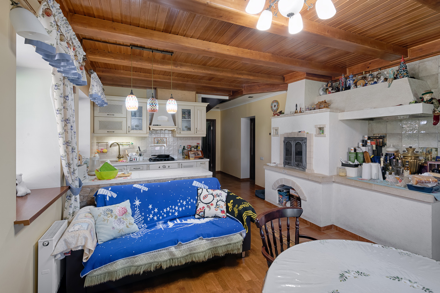 В доме 4 спальни, 2 санузла с душевыми, кухня-гостиная, прихожая-гардеробная, баня с бассейном, камин и русская печь. Отделка выполнена из качественных материалов: пол - паркетная доска, керамическая плитка, оборудован премиальной техникой.