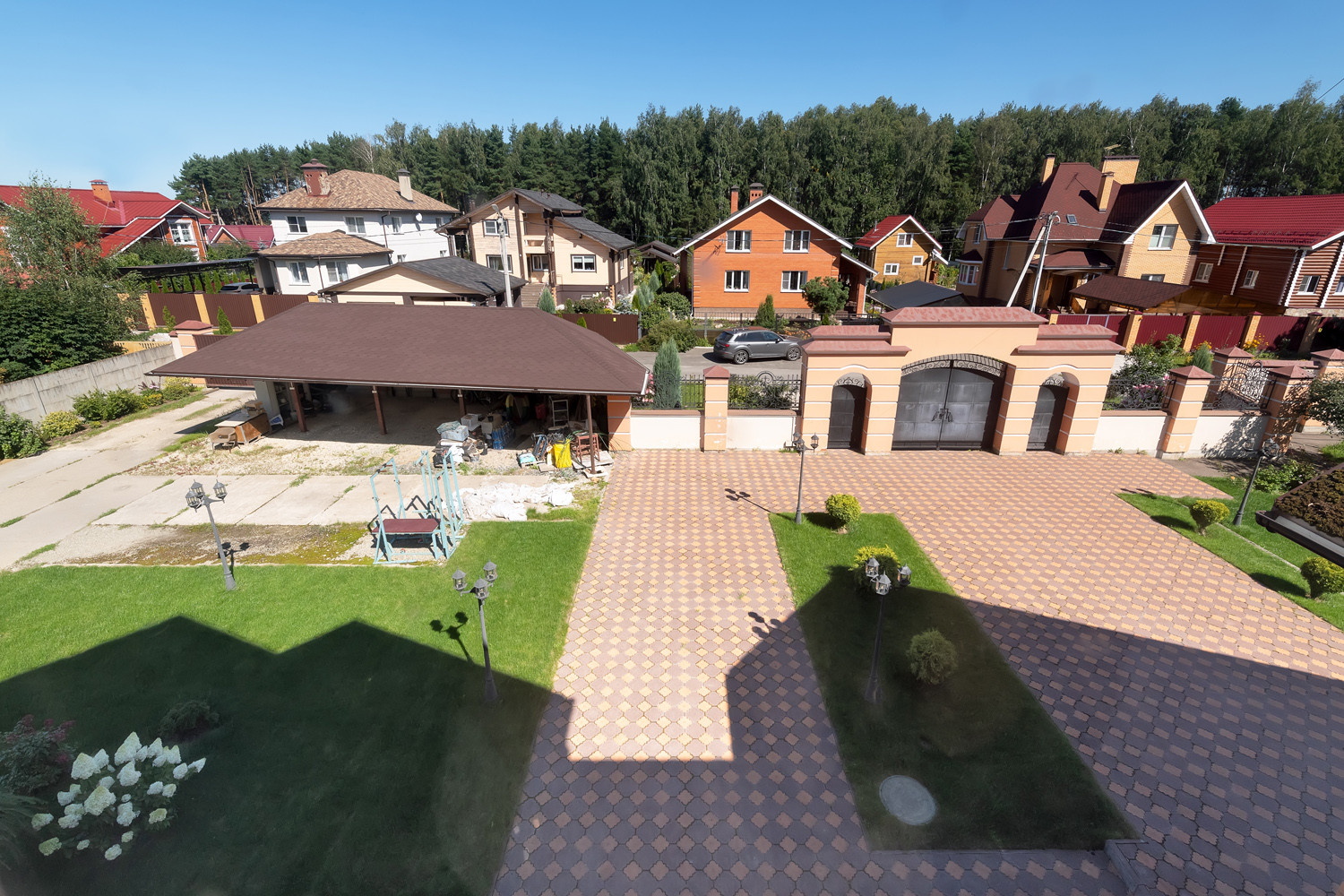 Участок огорожен дорогим фасадным забором, центральная кованная входная группа + откатные ворота.