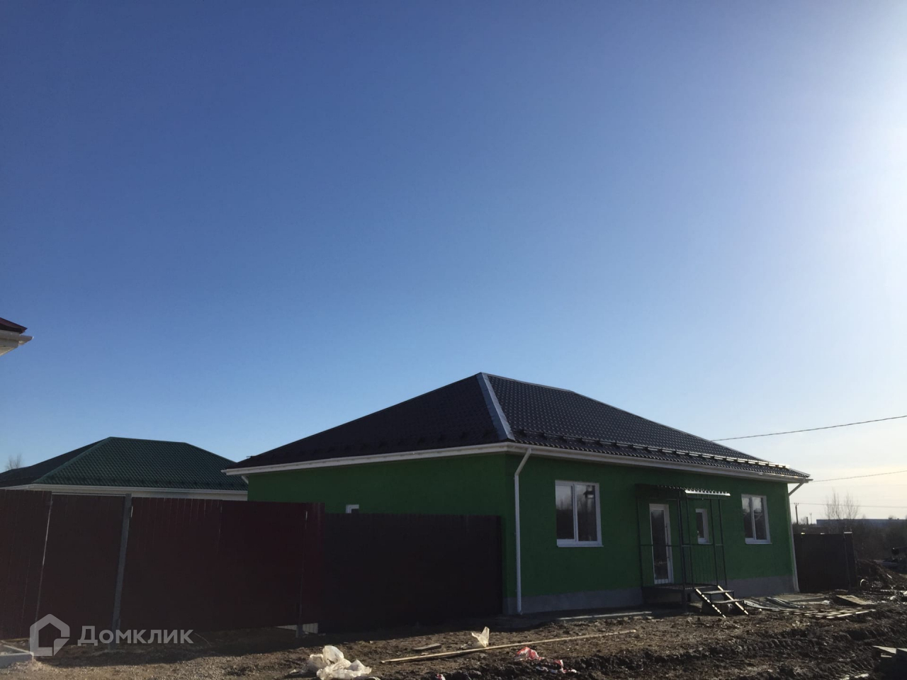 Дом одноэтажный. Построен из газосиликатного блока, кровля выполнена металлочерепицей. Фундамент ленточный на бетонных колоннах. Предчистовая отделка всех стен (чистовая отделка по вашему желанию также возможна). Также есть возможность поставить беседку, баню, гараж, бассейн. Для этого будут выведены необходимые коммуникации.