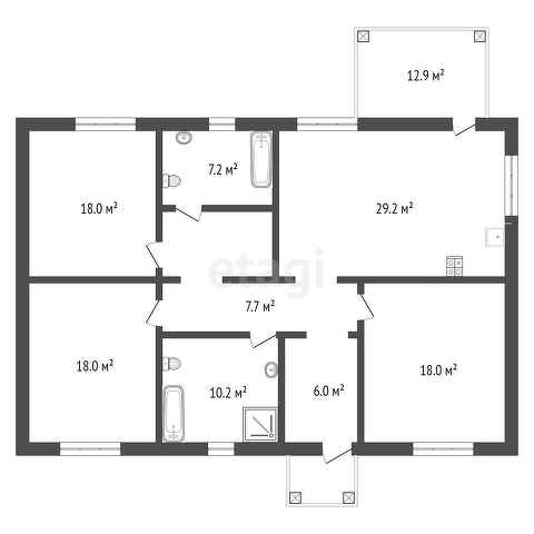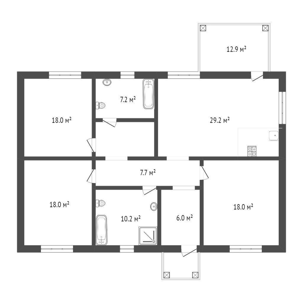 В доме 3 просторные жилые комнаты по 18 кв.м. каждая, просторная кухня гостиная 29 кв.м. и 2 санузла.