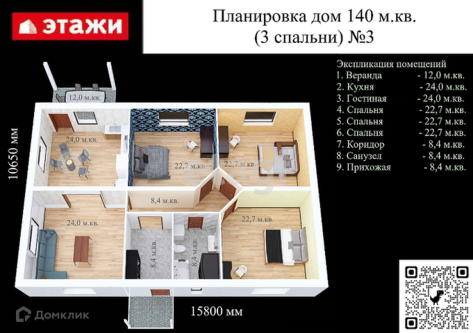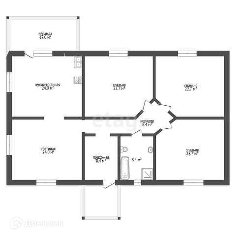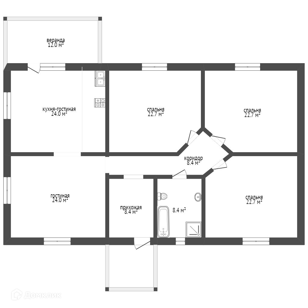 В доме -3 спальни по 22,7м.2; кухня-24 кв.м, гостиная-24 кв.м.