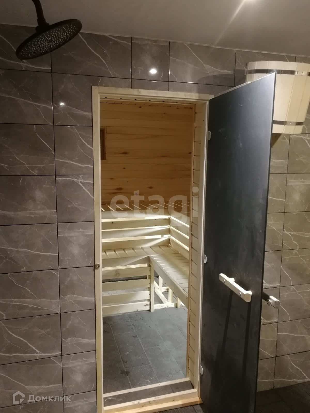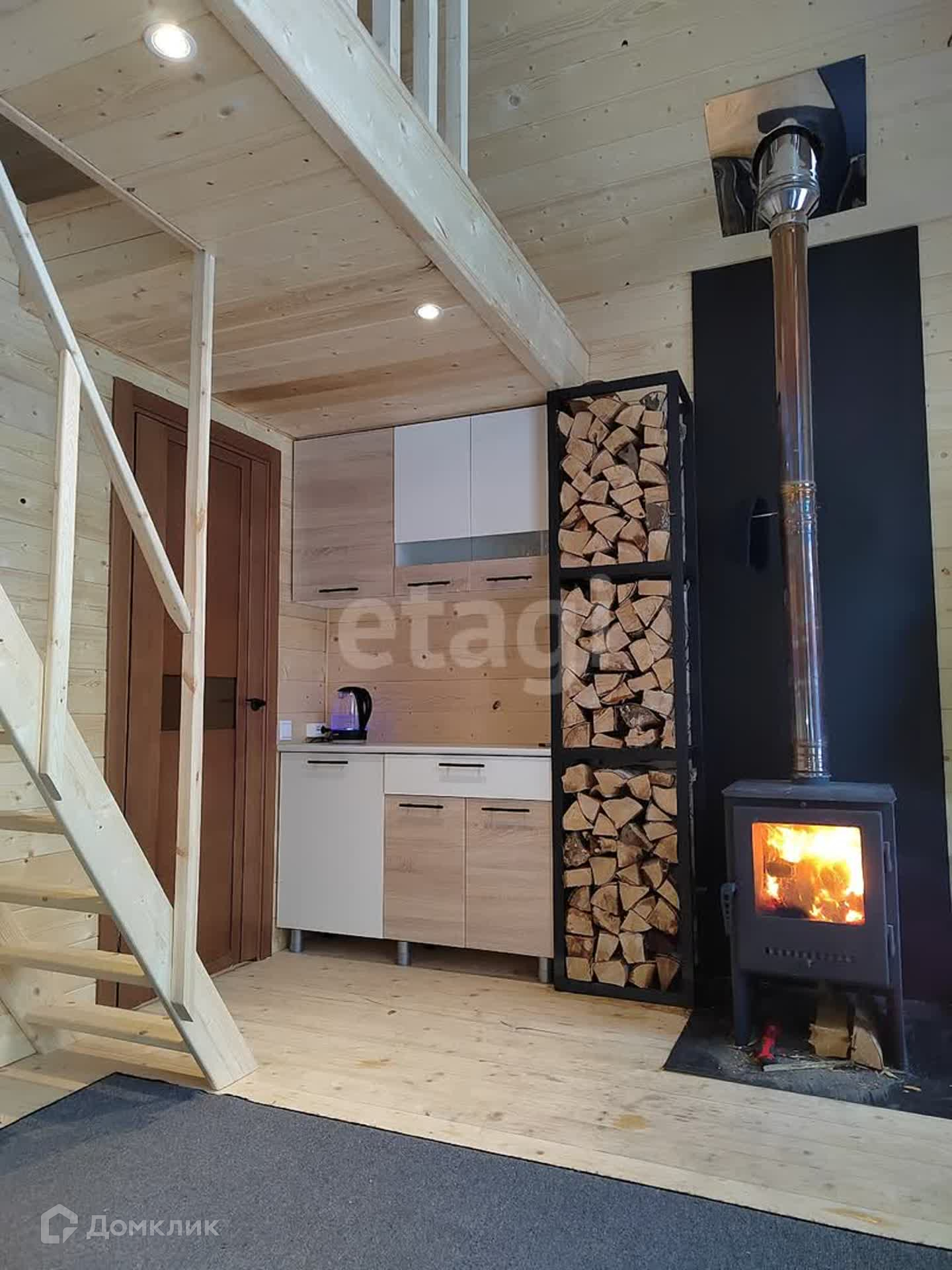 На первом этаже располагается гостевая зона, кухня, сауна и просторная душевая с теплым полом, на втором - уютная зона для отдыха.