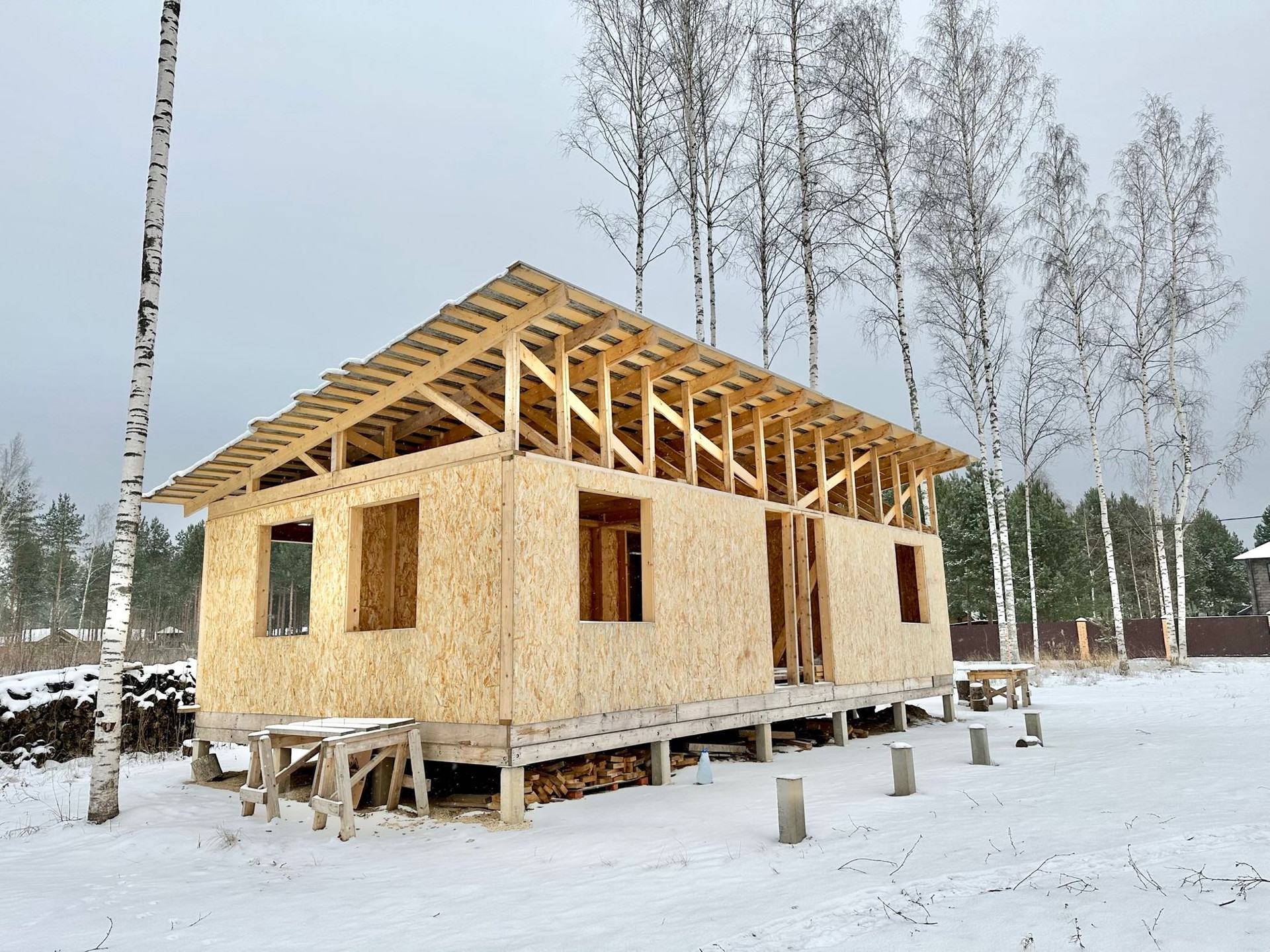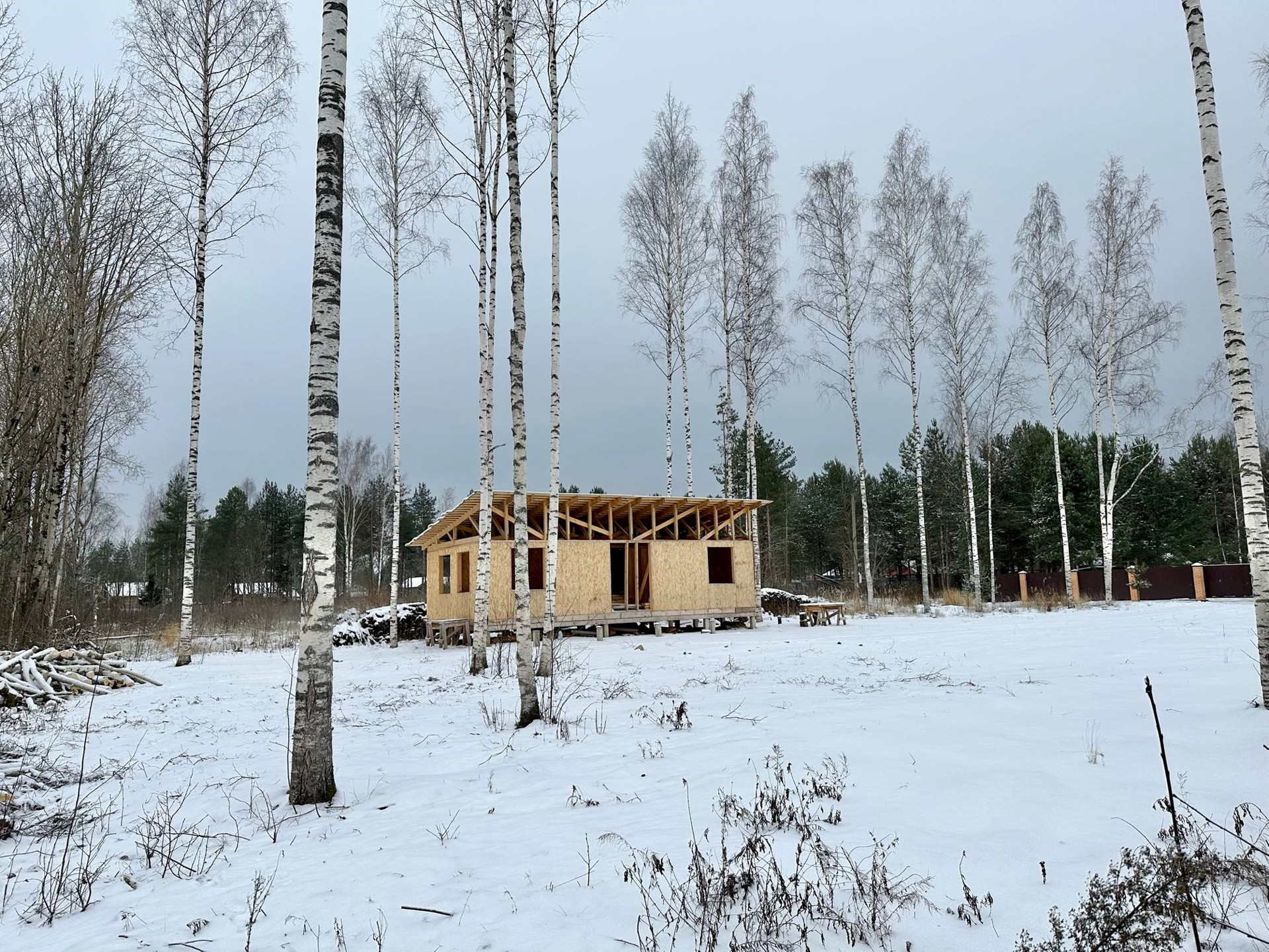 ❇️На участке начато строительство каркасного гостевого дома на свайном фундаменте. Стены возведены под крышу, Покрытие временное - рубероид.