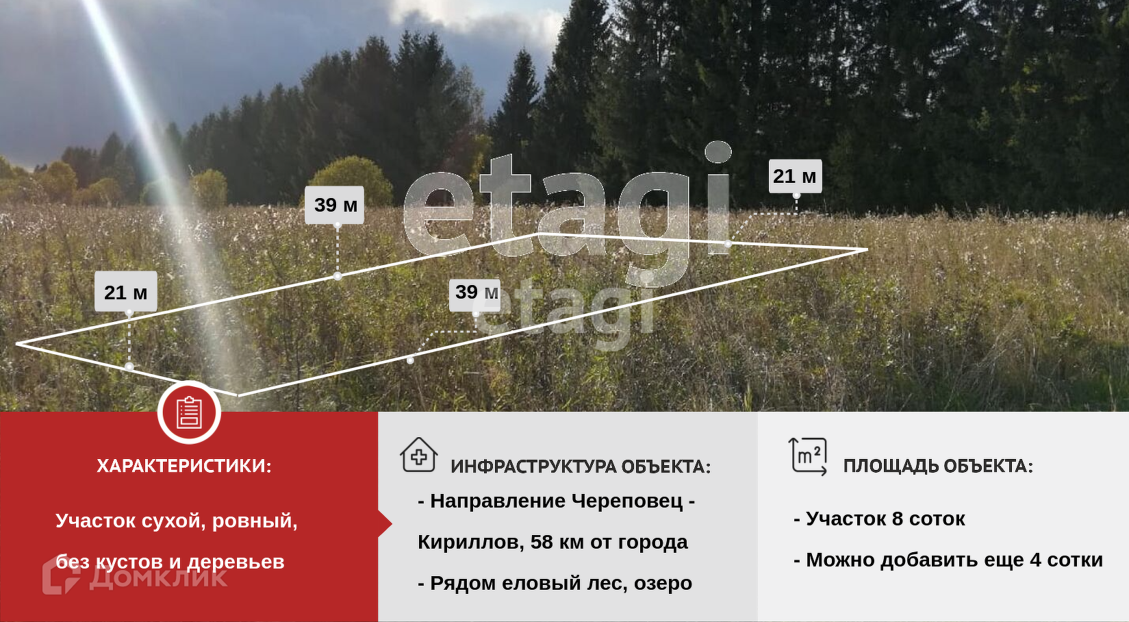 Участок (8 соток) ровный, сухой без кустов и деревьев, только травушка-муравушка. Есть возможность "добавить" к имеющимся 8 соткам ещё 4!