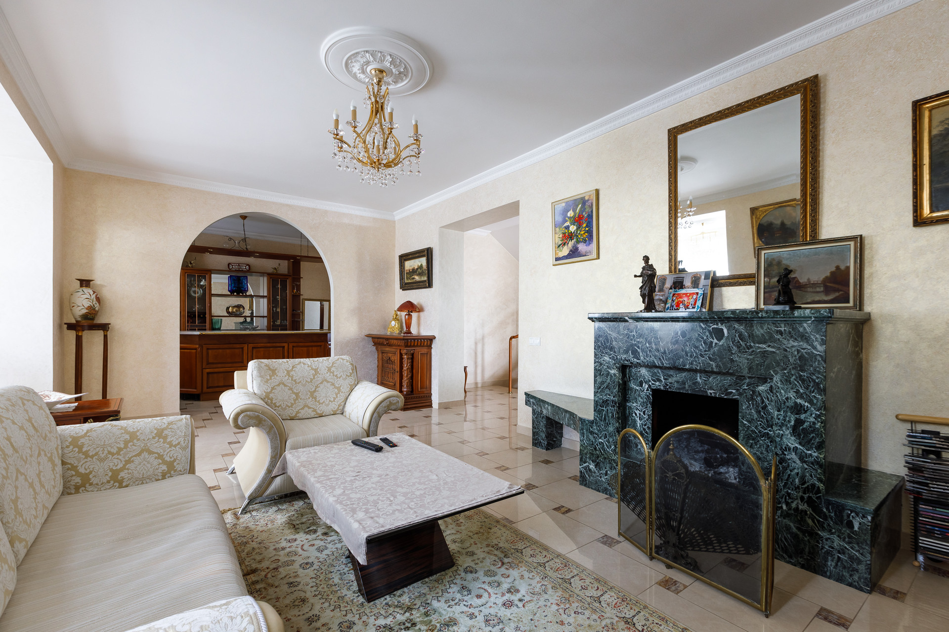 1 этаж: кухня-столовая, гостиная-каминный зал, санузел;