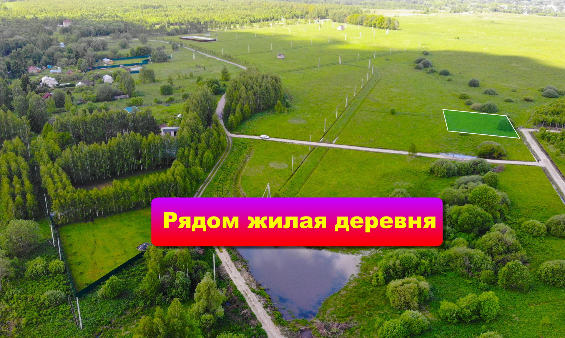 Участок ровный и прямоугольной формы. На участке нет деревьев, только несколько небольших кустарников. До деревни асфальтовый подъезд, а внутри деревни щебневая дорога.