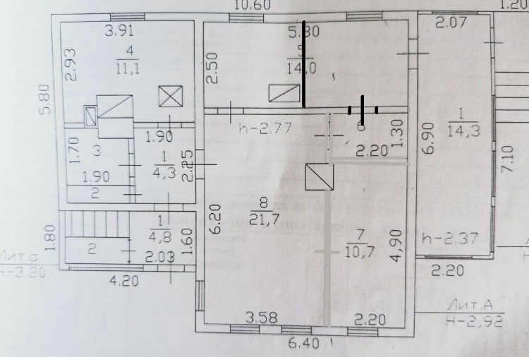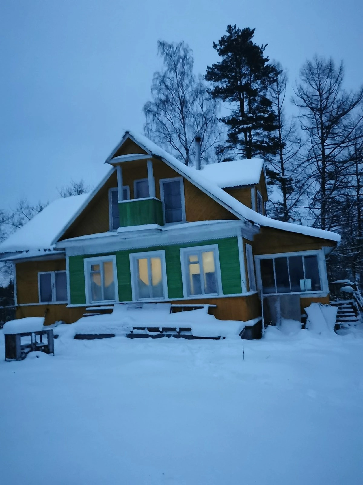 Дом 90х годов постройки, на первом этаже расположены помещения под ванну, туалет, кухню, две жилых комнаты и большая комната на три окна, есть веранда с отдельным входом. Под кухней находится погреб в человеческий рост. Фундамент ленточный под всем домом. На втором этаже две жилых комнаты по обоим сторонам дома и одна проходная комната.