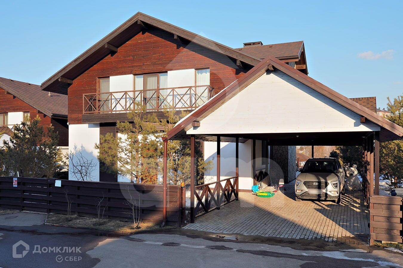 На участке расположен навес на 2 машино-места. Рядом инфраструктура поселка Горки-10: торговые комплексы, школа, детские сады, конно-спортивный центр, два санатория управделами Президента РФ, лес, река.