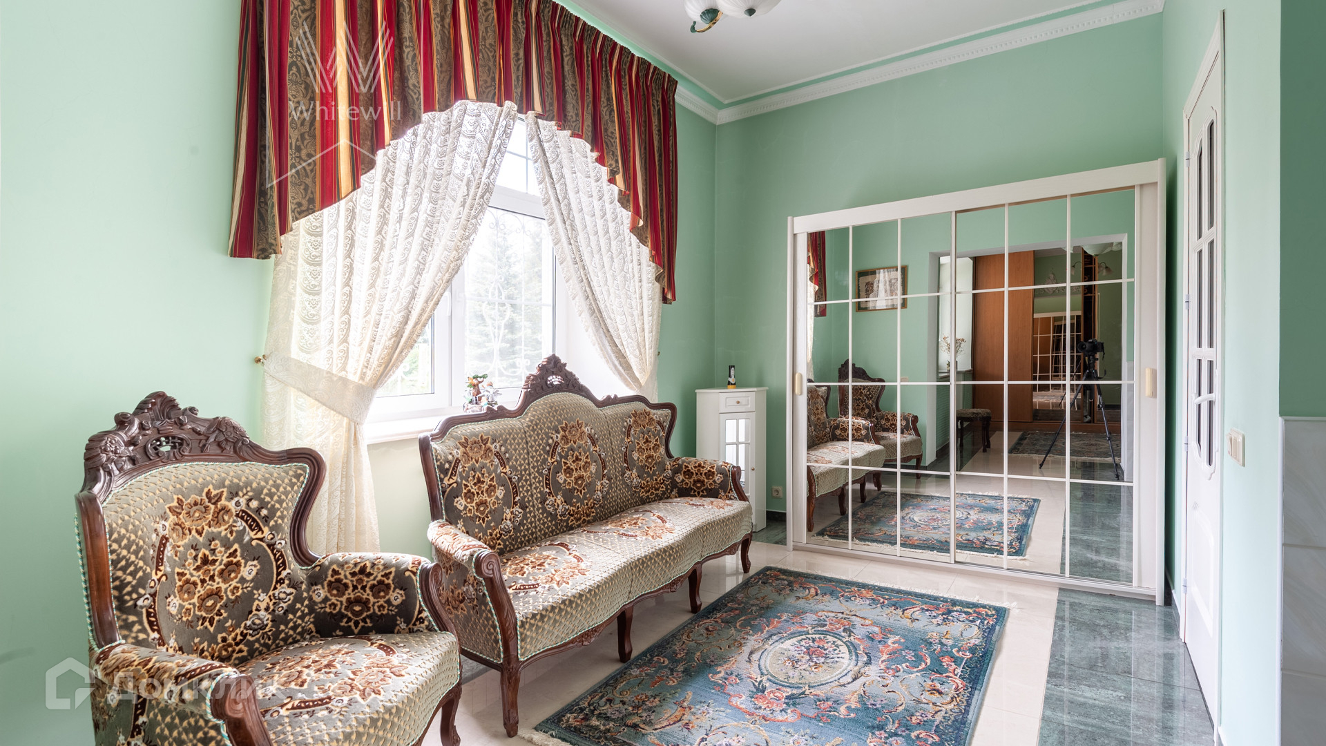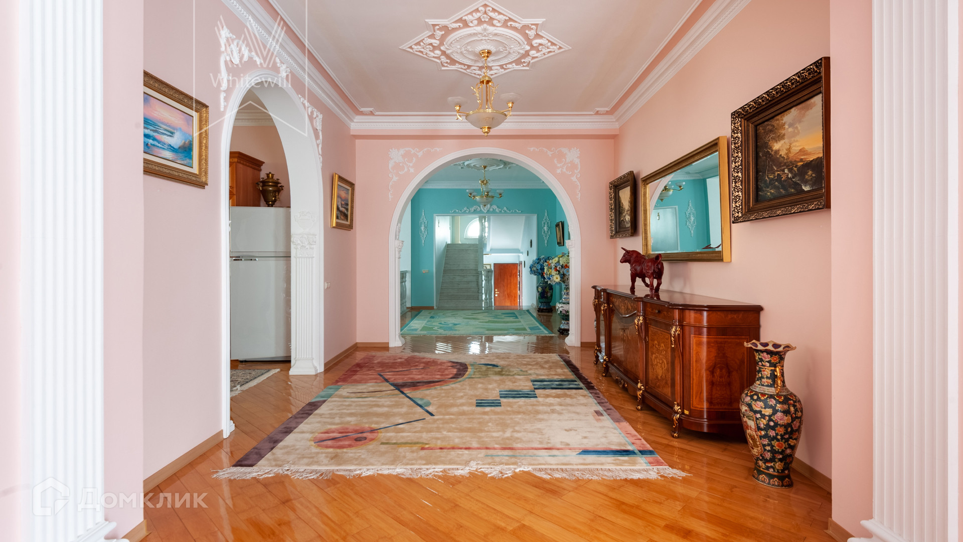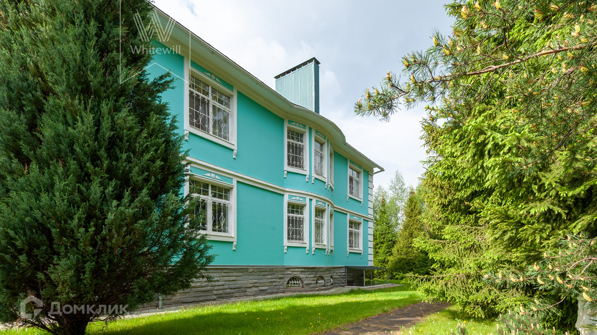 ID 11 538. Горышкино. Загородная резиденция площадью 800 м² построена на просторном участке 80 соток с собственным выходом в лес. Фасад здания выполнен в классическом стиле, облицован бирюзовой штукатуркой и декорирован белыми колоннами, наличниками и резными элементами. В отделке интерьера использованы широкая палитра пастельных оттенков, мрамор и лепнина ручной работы. Планировка дома включает 5 спален, 3 гостиные, одна из которых с камином, кухню, столовую, кабинет, домашний кинотеатр, игровую зону с бильярдом и настольным теннисом и гараж на 2 машины. На цокольном уровне разместили SPA-зону с бассейном, сауной, комнатой отдыха и массажной. На участке с ландшафтным дизайном, обустроенными аллеями с мраморными, каменными и гипсовыми статуями расположены декоративный бассейн, пруд глубиной до 6 метров, дом для персонала и гараж на 1 машину с мастерской.
