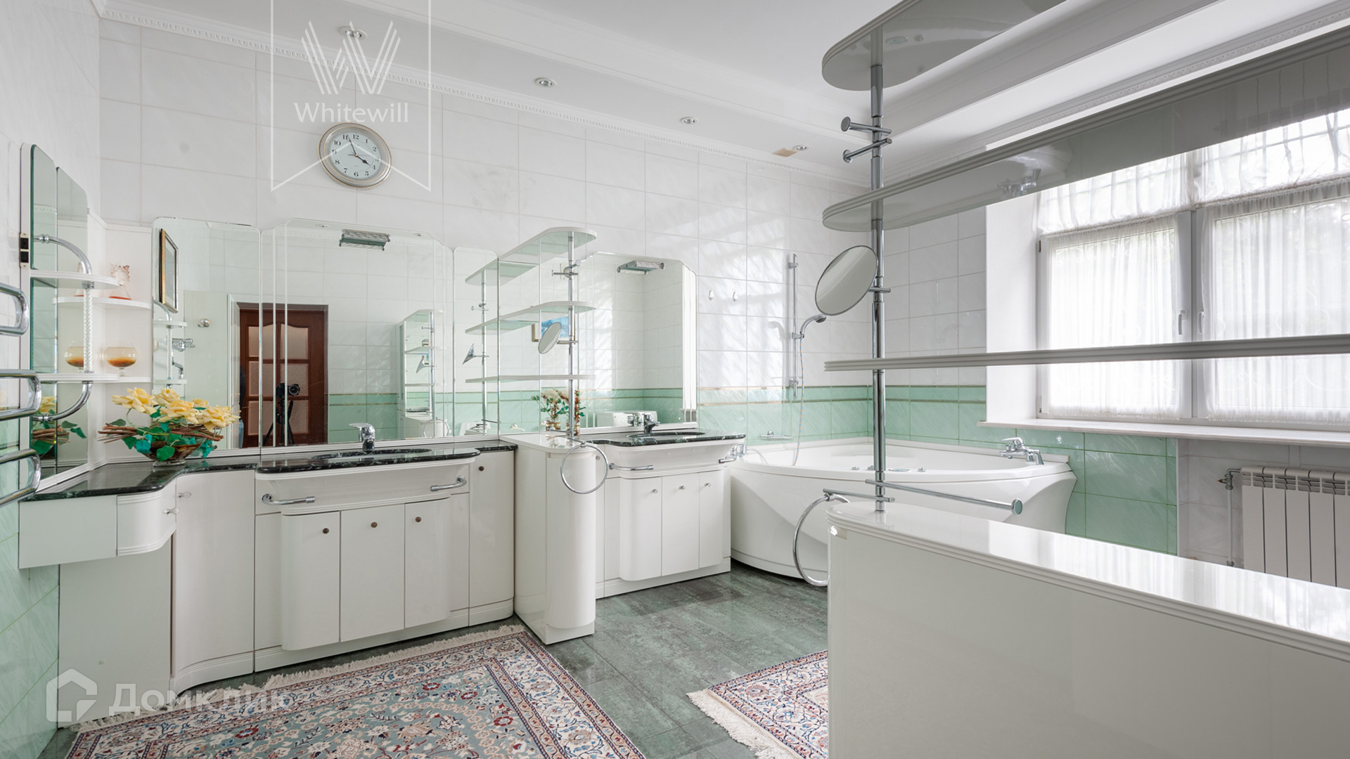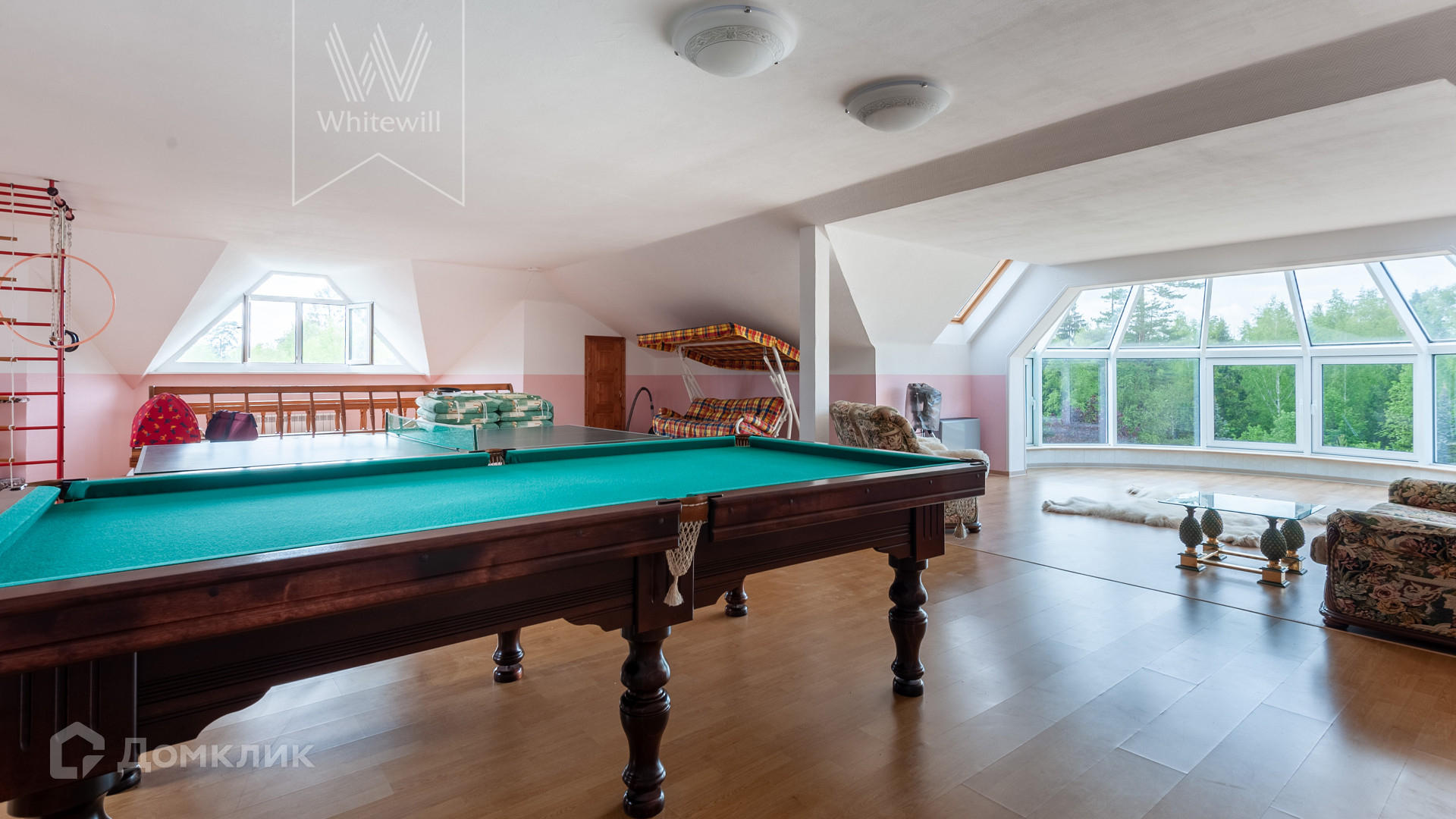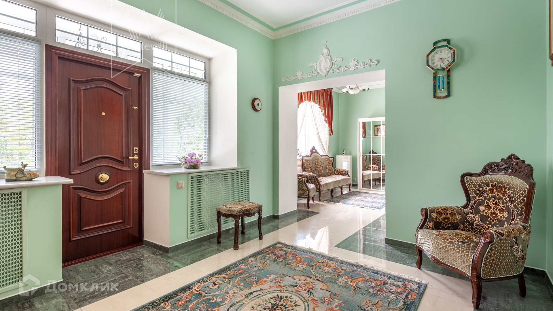 ID 11 538. Горышкино. Загородная резиденция площадью 800 м² построена на просторном участке 80 соток с собственным выходом в лес. Фасад здания выполнен в классическом стиле, облицован бирюзовой штукатуркой и декорирован белыми колоннами, наличниками и резными элементами. В отделке интерьера использованы широкая палитра пастельных оттенков, мрамор и лепнина ручной работы. Планировка дома включает 5 спален, 3 гостиные, одна из которых с камином, кухню, столовую, кабинет, домашний кинотеатр, игровую зону с бильярдом и настольным теннисом и гараж на 2 машины. На цокольном уровне разместили SPA-зону с бассейном, сауной, комнатой отдыха и массажной. На участке с ландшафтным дизайном, обустроенными аллеями с мраморными, каменными и гипсовыми статуями расположены декоративный бассейн, пруд глубиной до 6 метров, дом для персонала и гараж на 1 машину с мастерской.