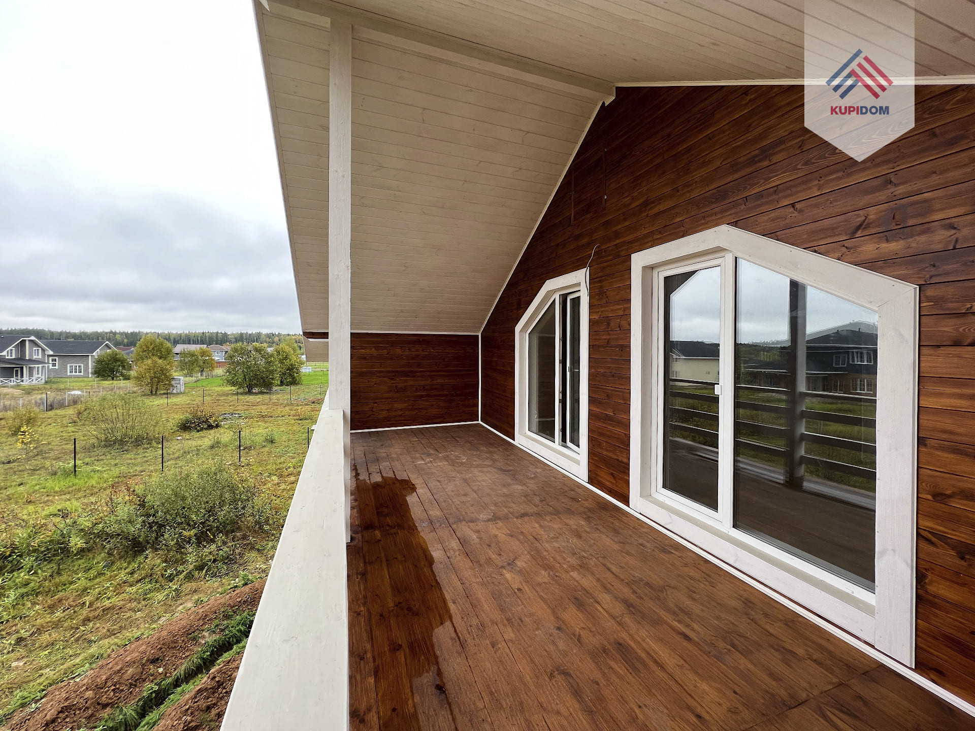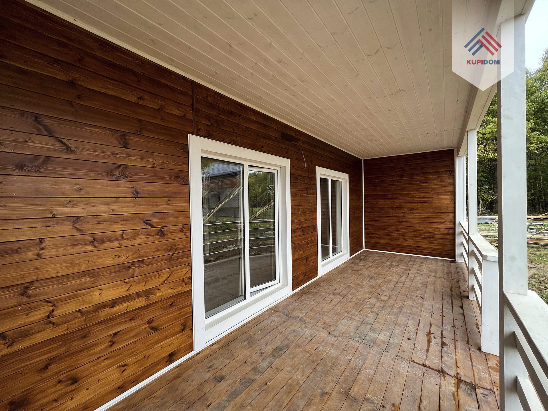 Материал дома брус сечением - 150x100 мм с утеплением; Внешняя и внутренняя отделка дома - обработанная имитация бруса; Утепление дома - стены 100 мм; пол, потолки, крыша - 150 мм.; Окна - двухкамерные стеклопакеты Rehau; Крыша - металлочерепица; Фундамент - монолитная плита; Полы - плитка\ламинат; На крыше и террасах установлена водосточная система.