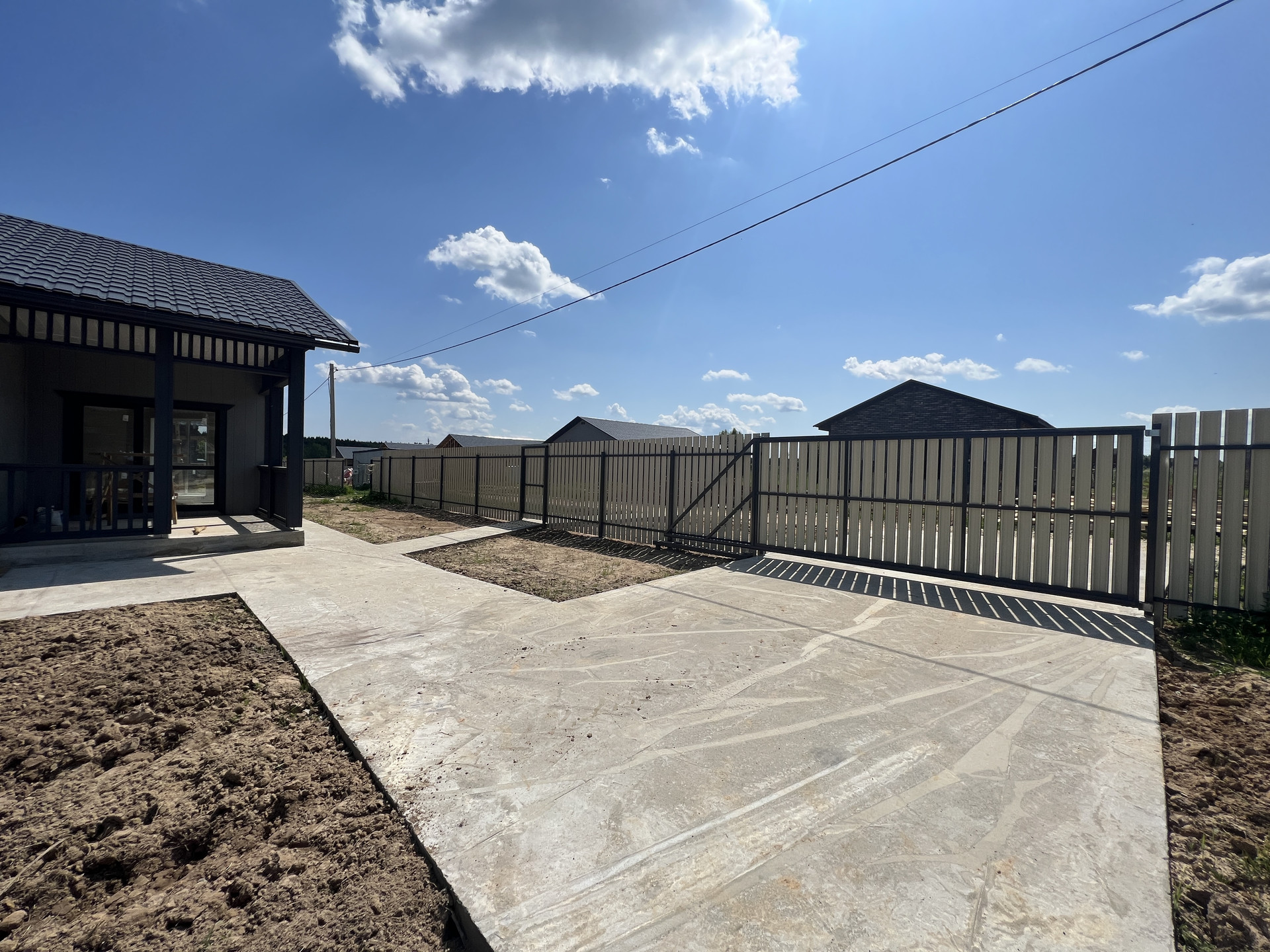 Категория - земли населенных пунктов (ИЖС); 10 соток, ровный, прямоугольной формы; По периметру установлен забор - металлический штакетник / рабица; Установлены откатные ворота; Оборудовано место для машины; Стоянка, отмостка, дорожка забетонированы.