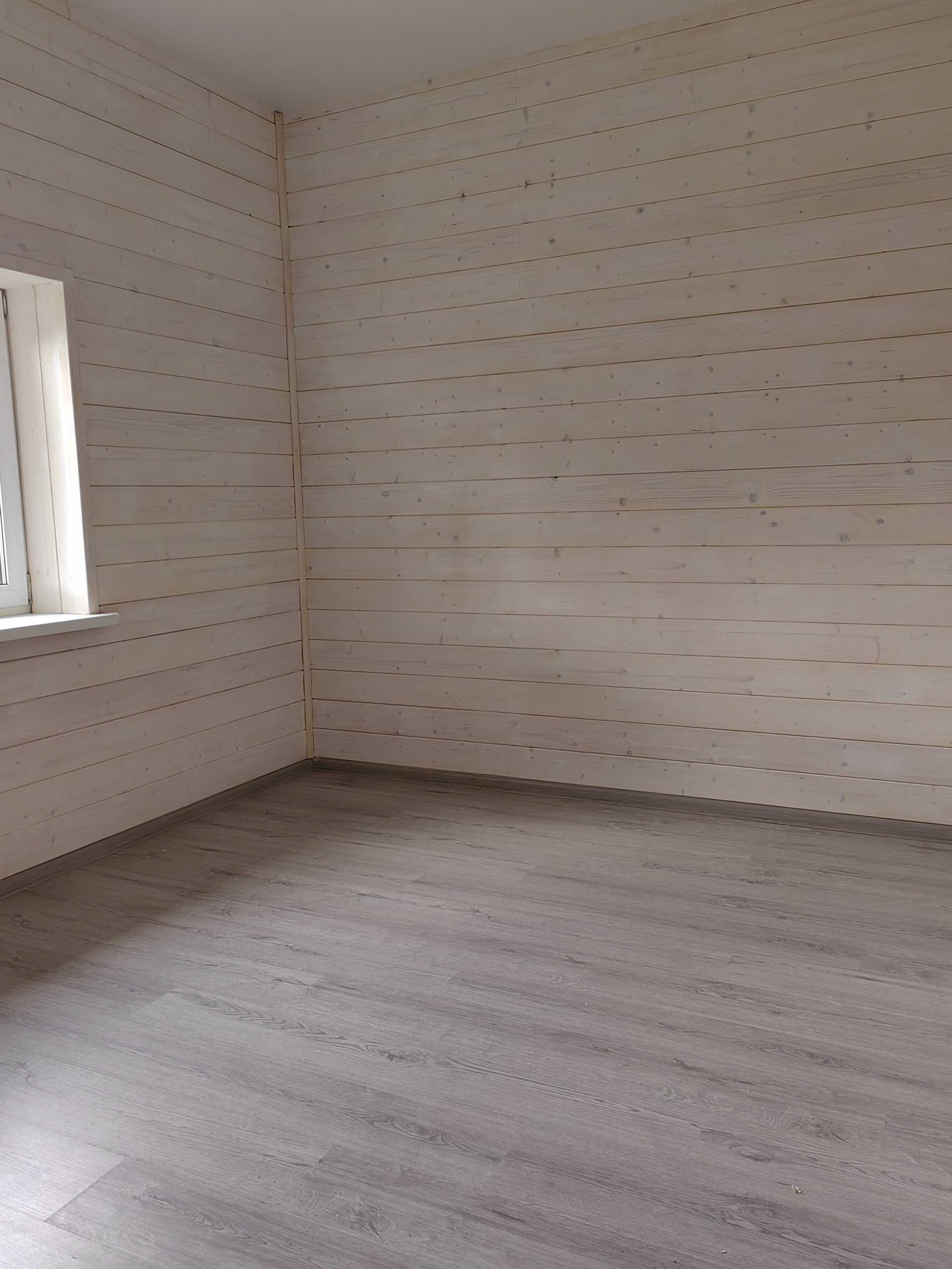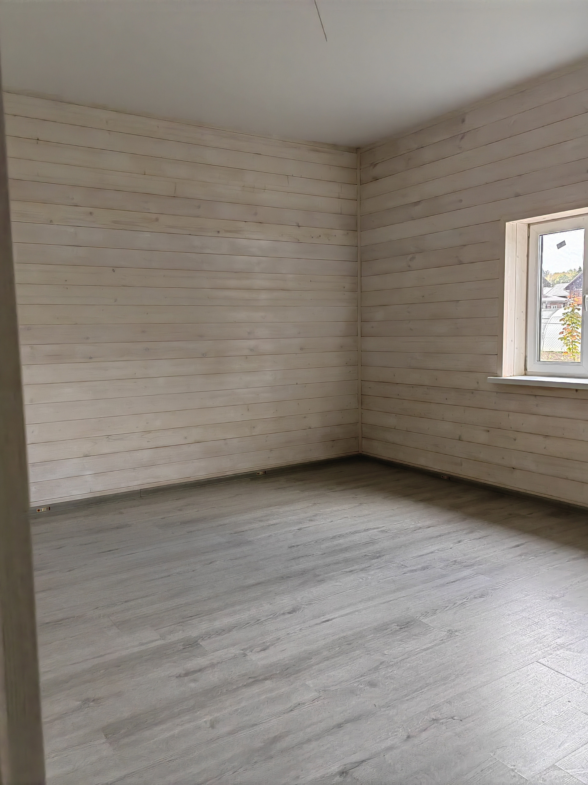 -стены комбинированные: обои ,имитация бруса, плитка в сан узле.