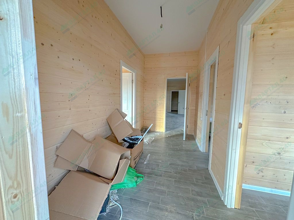 Материал стен – газоблоки с утеплением, отделка наружная: фасадная плитка Hauberk, внутренняя – покрашенная имитация бруса;