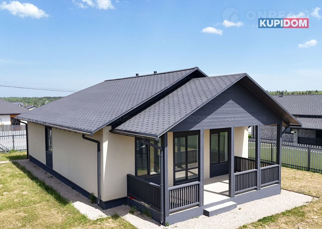 Фундамент - монолитная армированная плита; Материал стен - газоблок Воnоlit с утеплением; внутренние перегородки - газоблок; Внешняя отделка - белая декоративная штукатурка "барашек"; Кровля - Мягкая черепица; Крыша и фасад - вентилируемые; Окна - двухкамерные стеклопакеты с темной ламинацией.