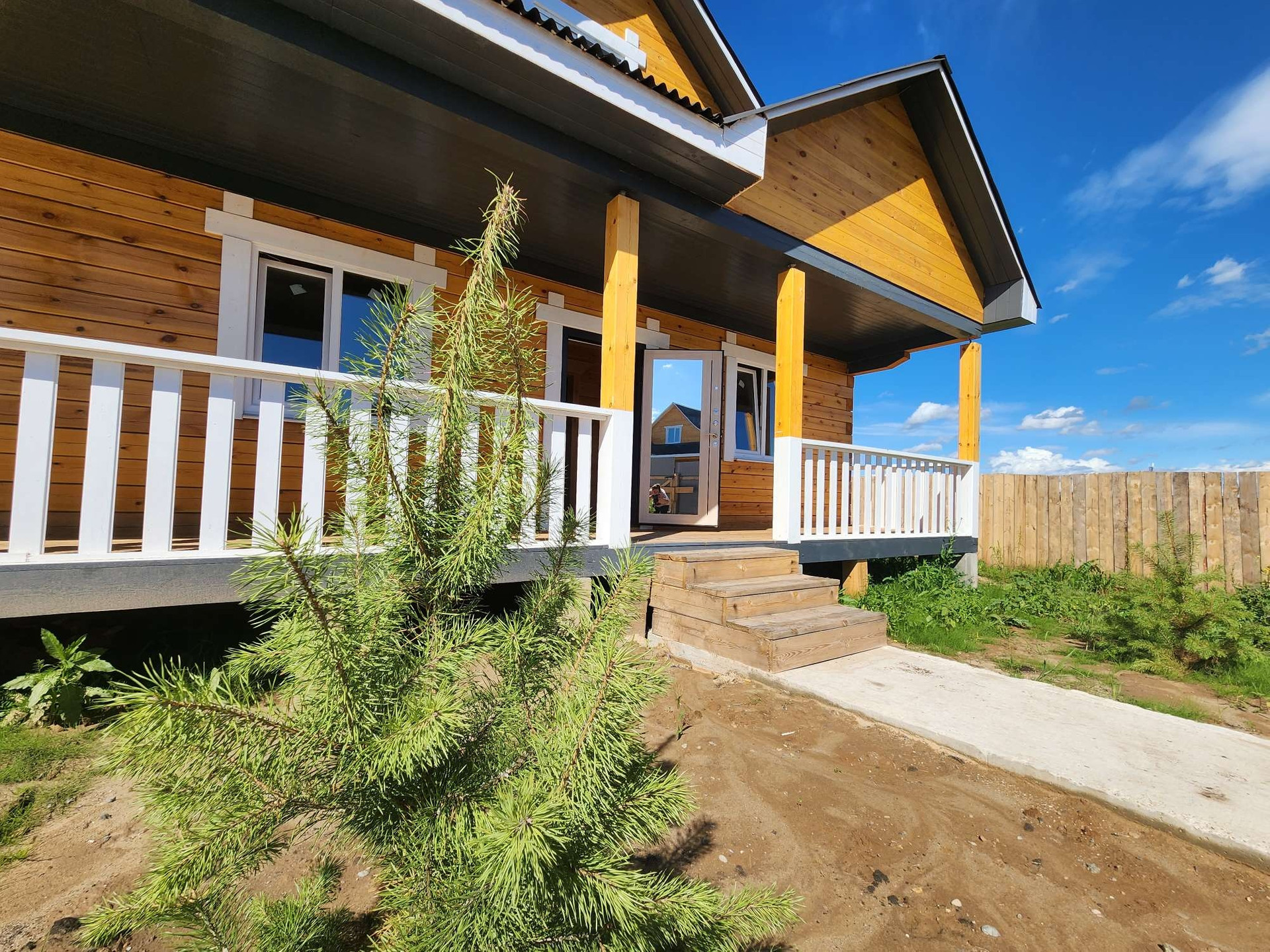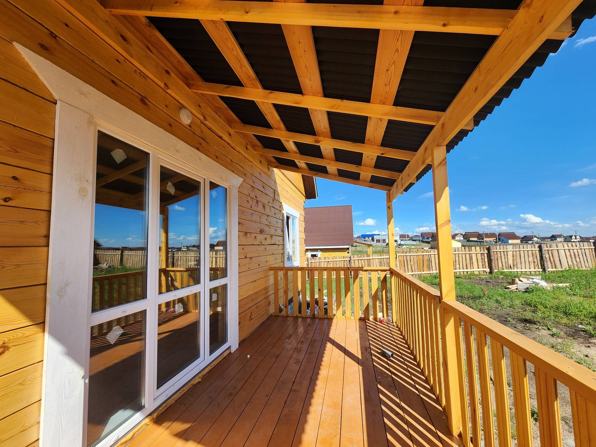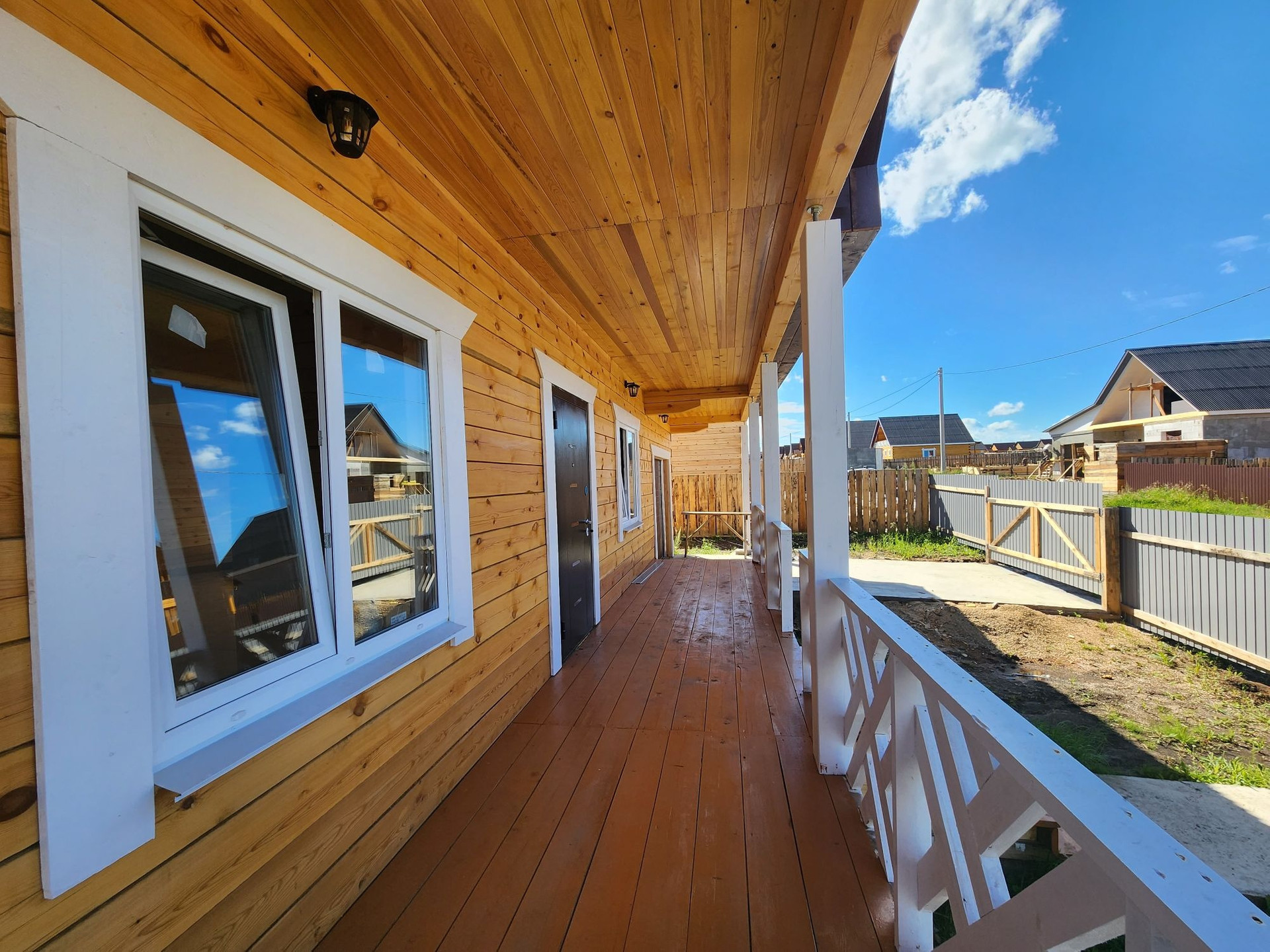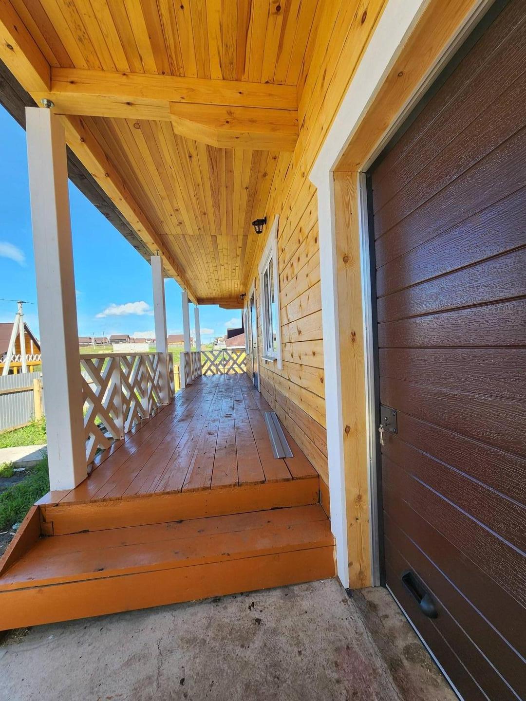 Внешняя отделка дома: снаружи брус обработан огне-био защитой, кровля ондулин, установлены трёхкамерные окна, хорошая входная дверь.