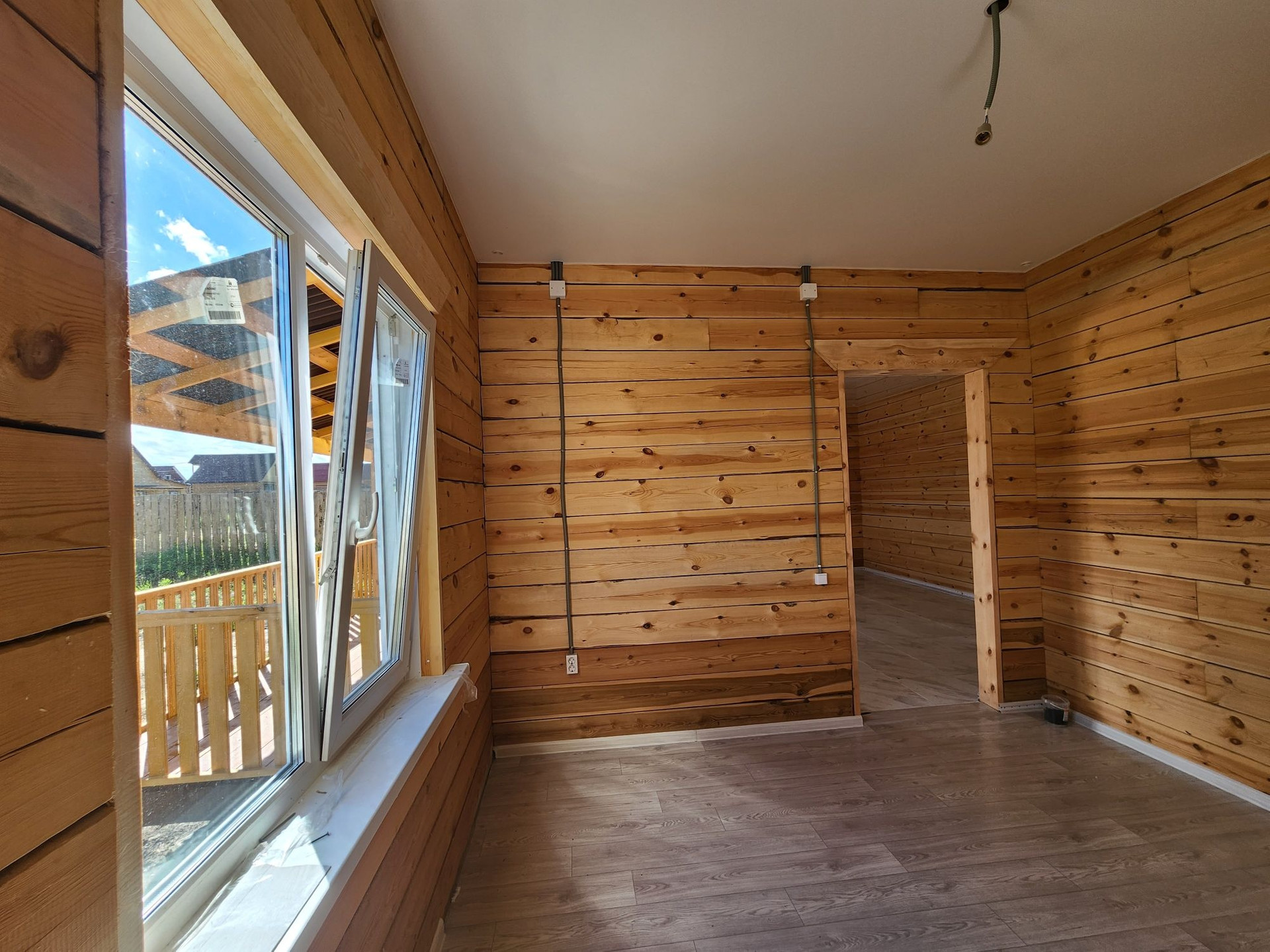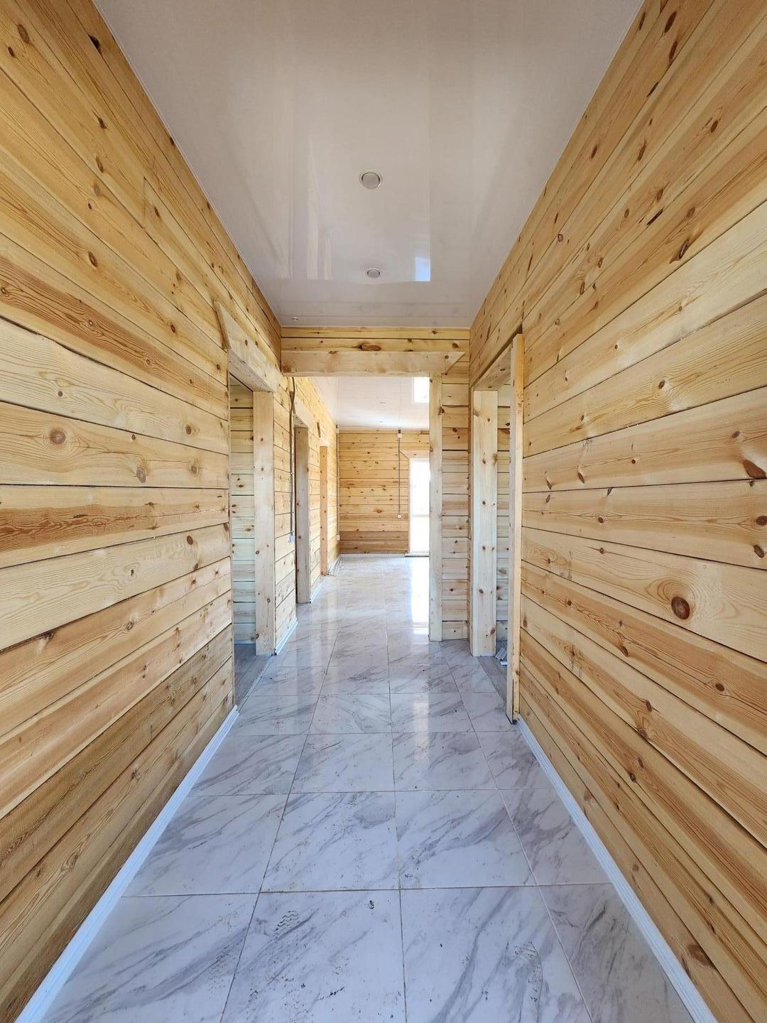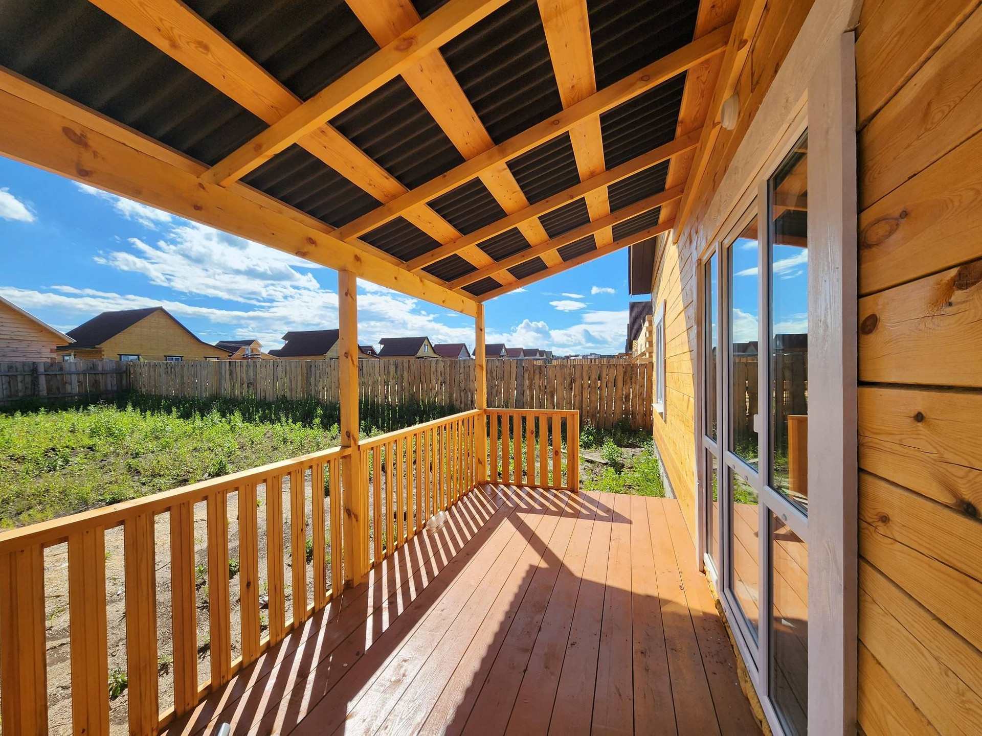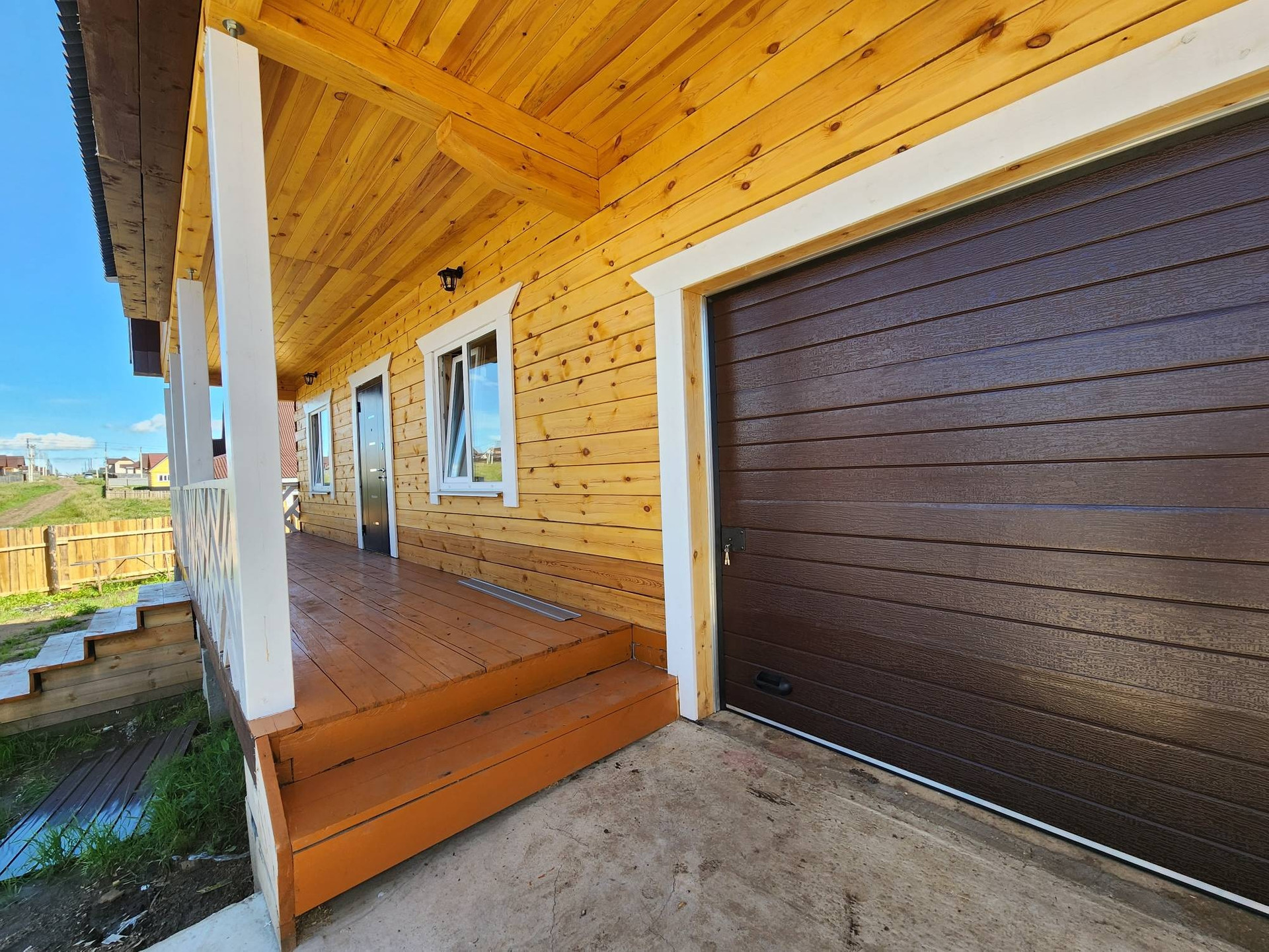 Внешняя отделка дома: снаружи брус обработан огне-био защитой, кровля ондулин, установлены трёхкамерные окна, хорошая входная дверь.