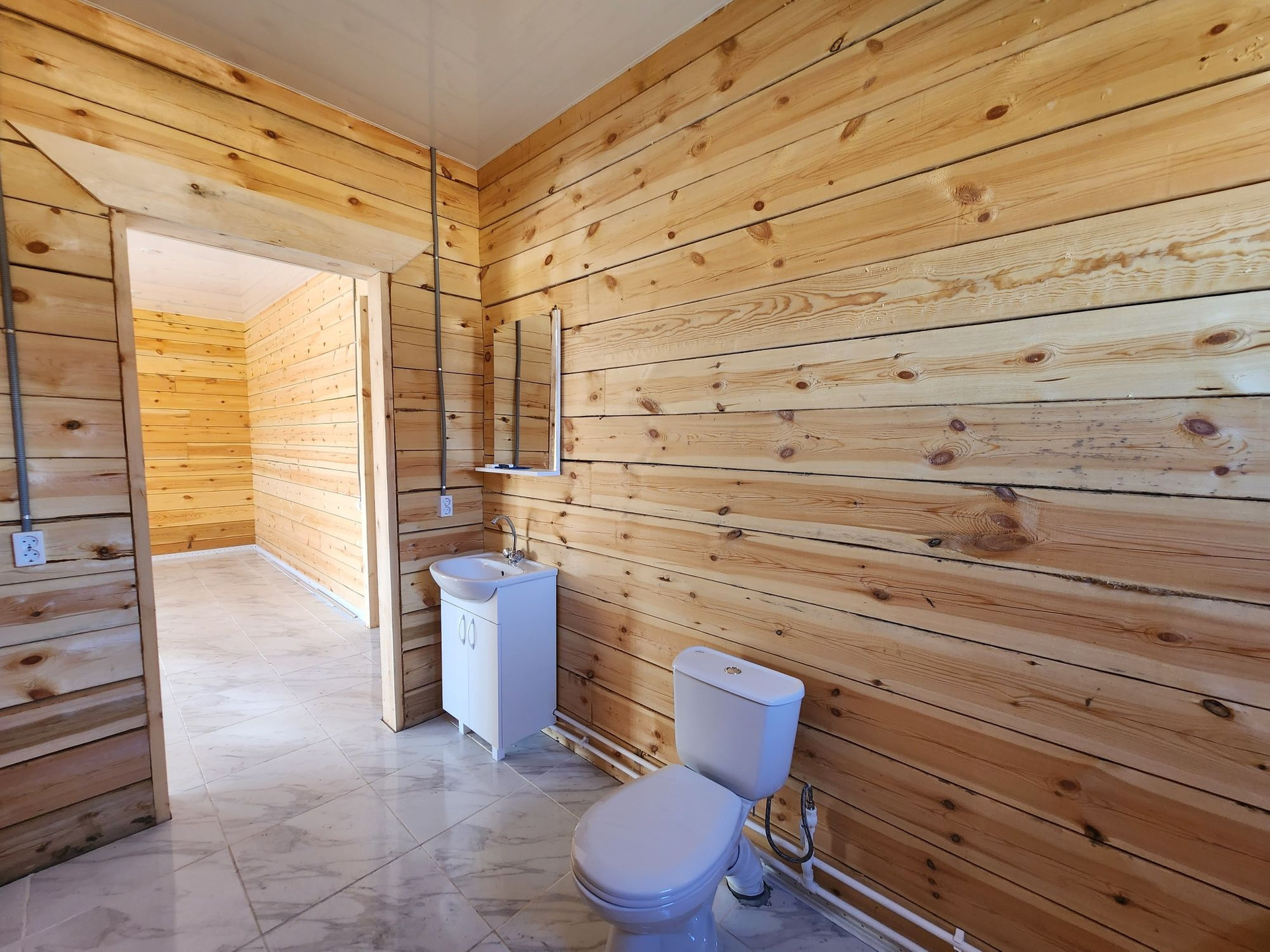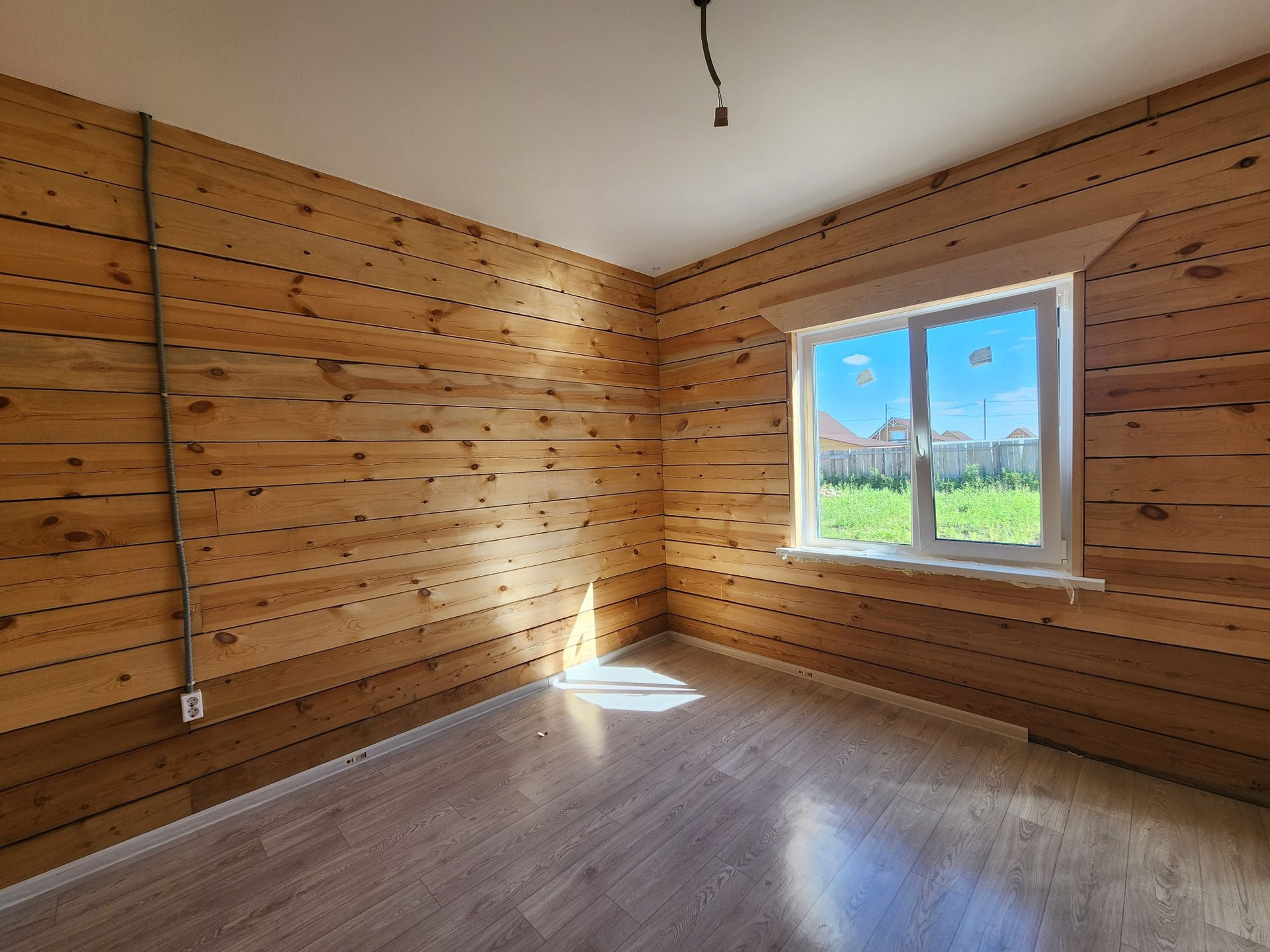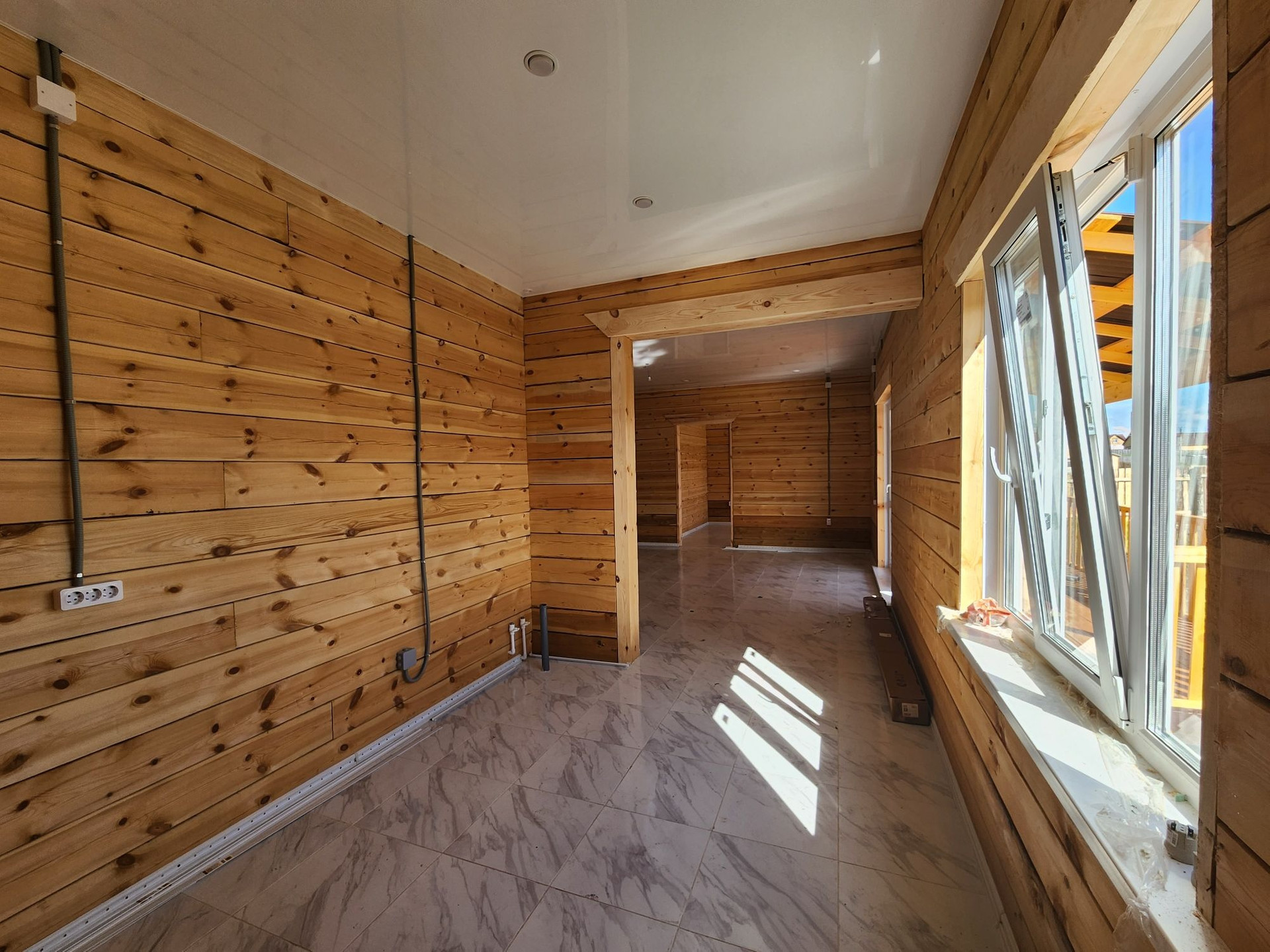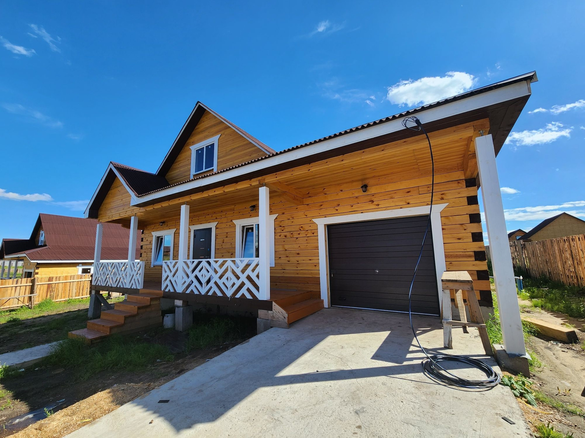 Внешняя отделка дома: снаружи брус обработан огне-био защитой, кровля ондулин, установлены трёхкамерные окна, хорошая входная дверь.