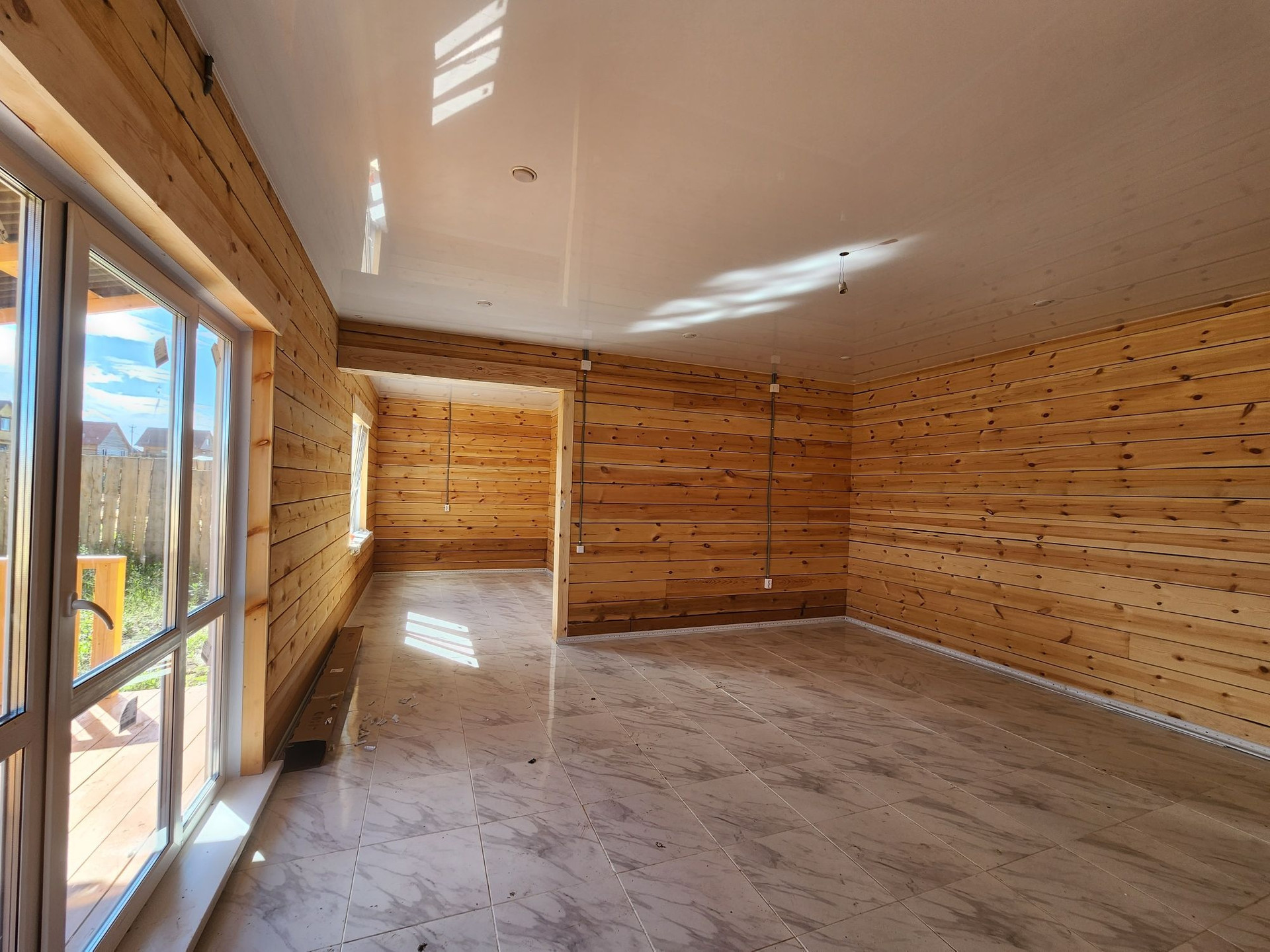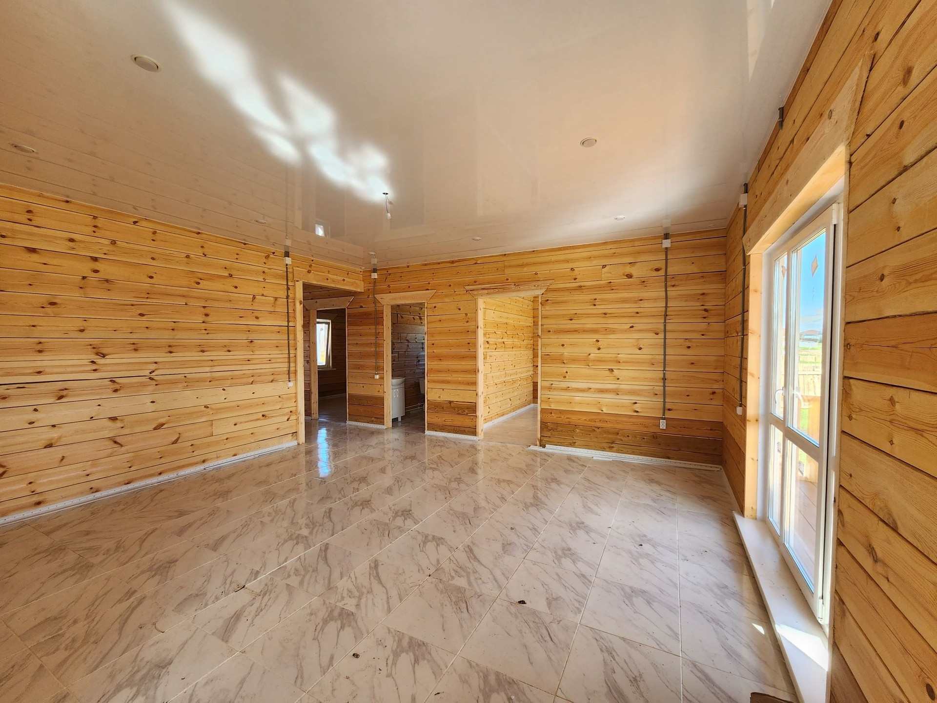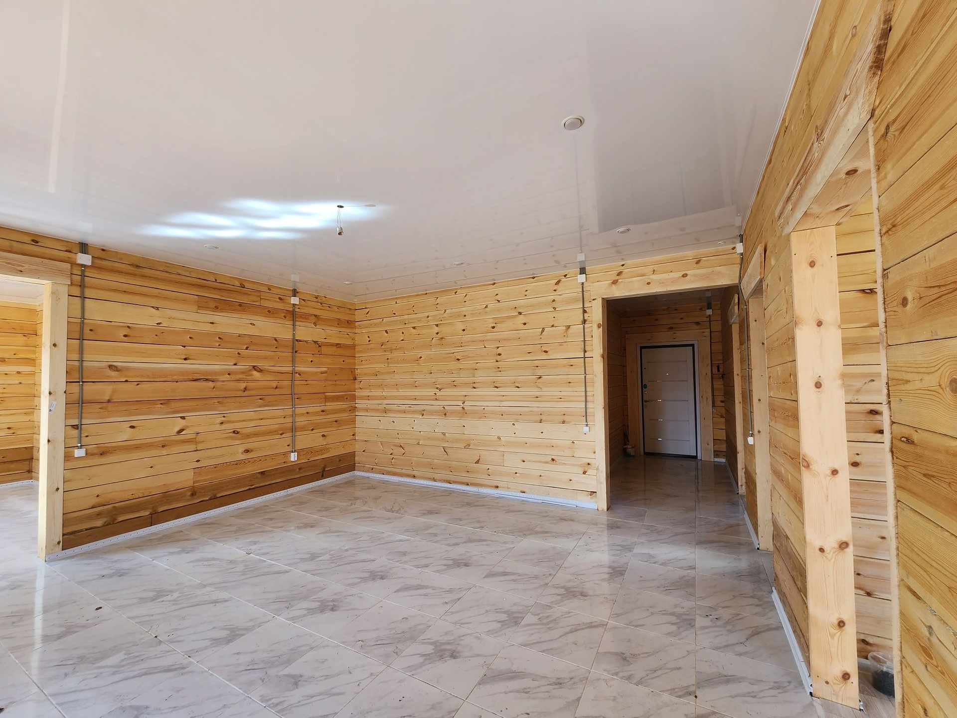 Внутренняя отделка: во всех комнатах натяжной потолок с точечным освещением, половое покрытие керамическая плитка (прихожая, сан.узел, кухня-гостиная), линолеум (спальни).