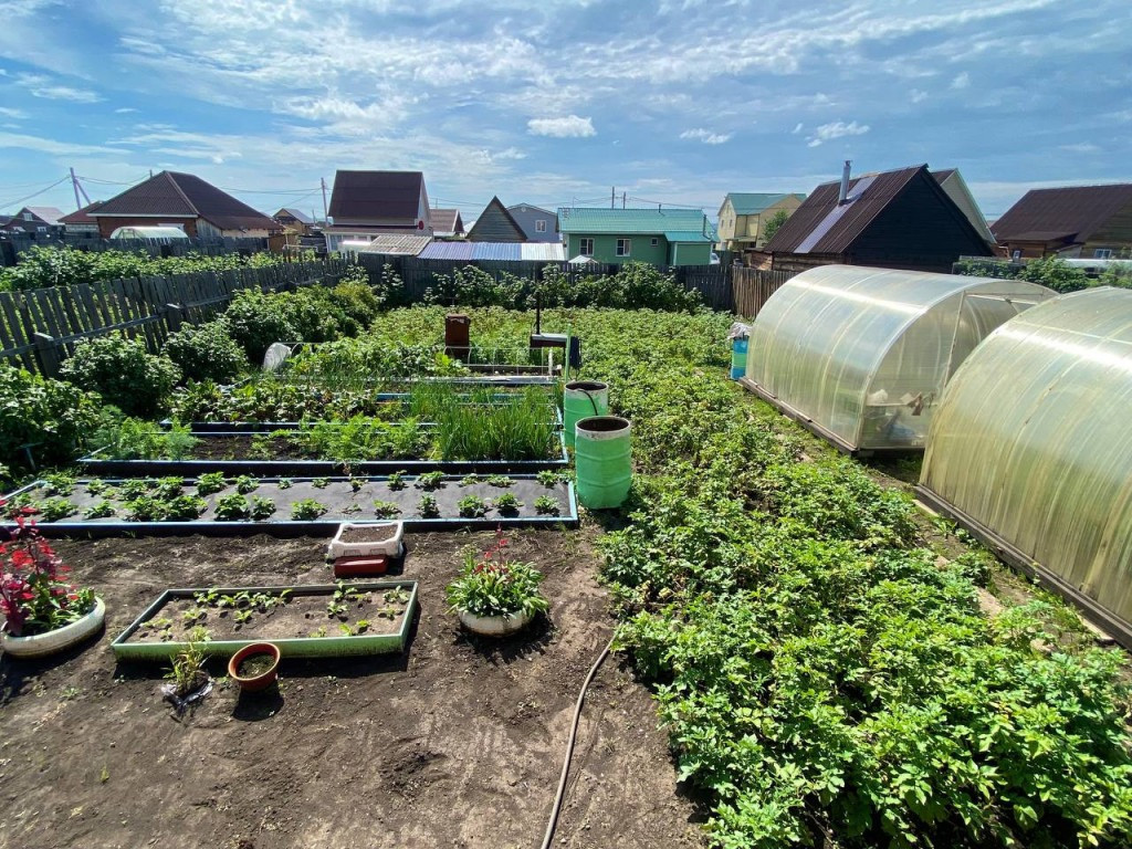 Участок ровный ,разработан, установлено 2 теплицы, есть насаждения плодово ягодные.