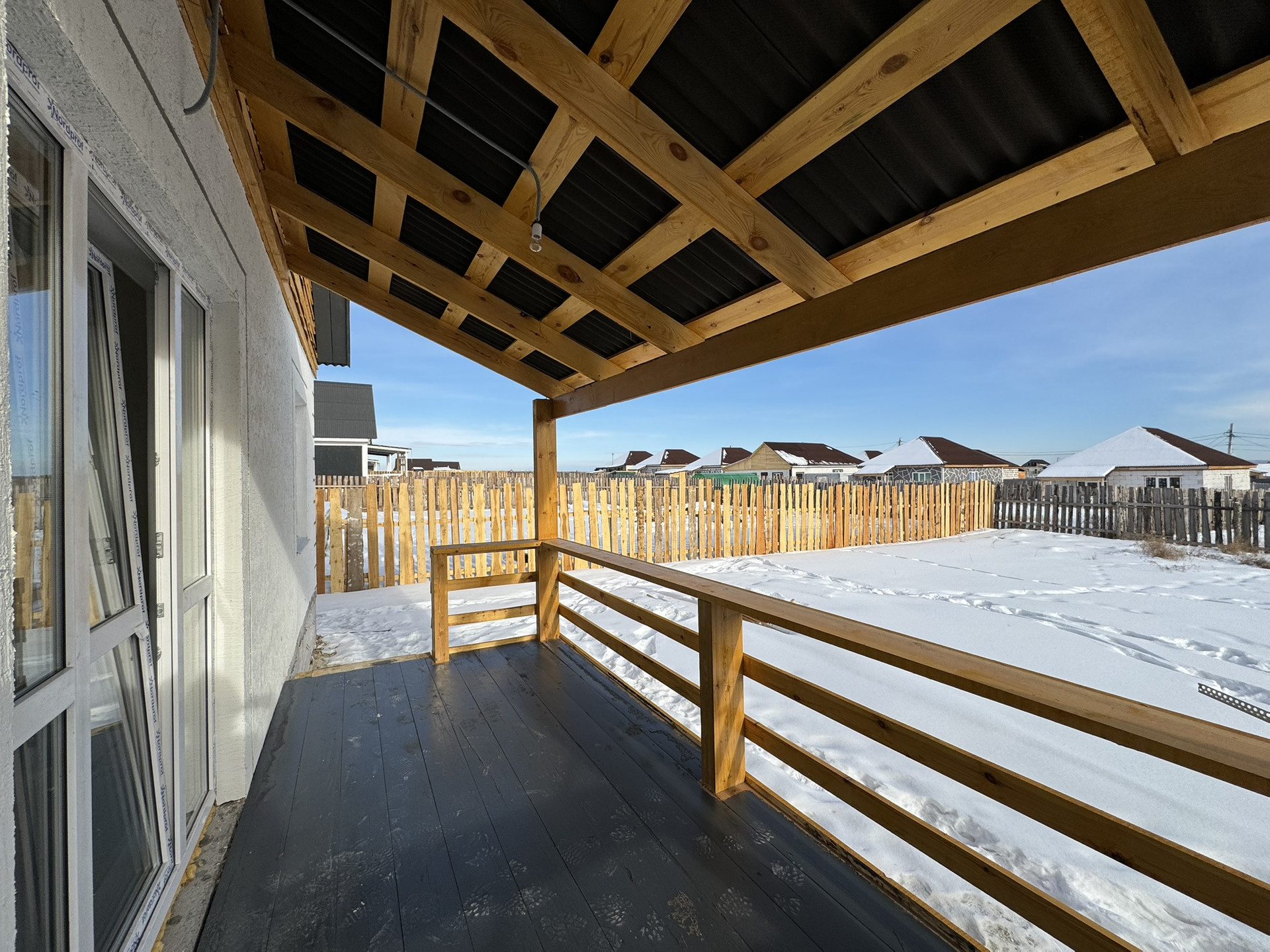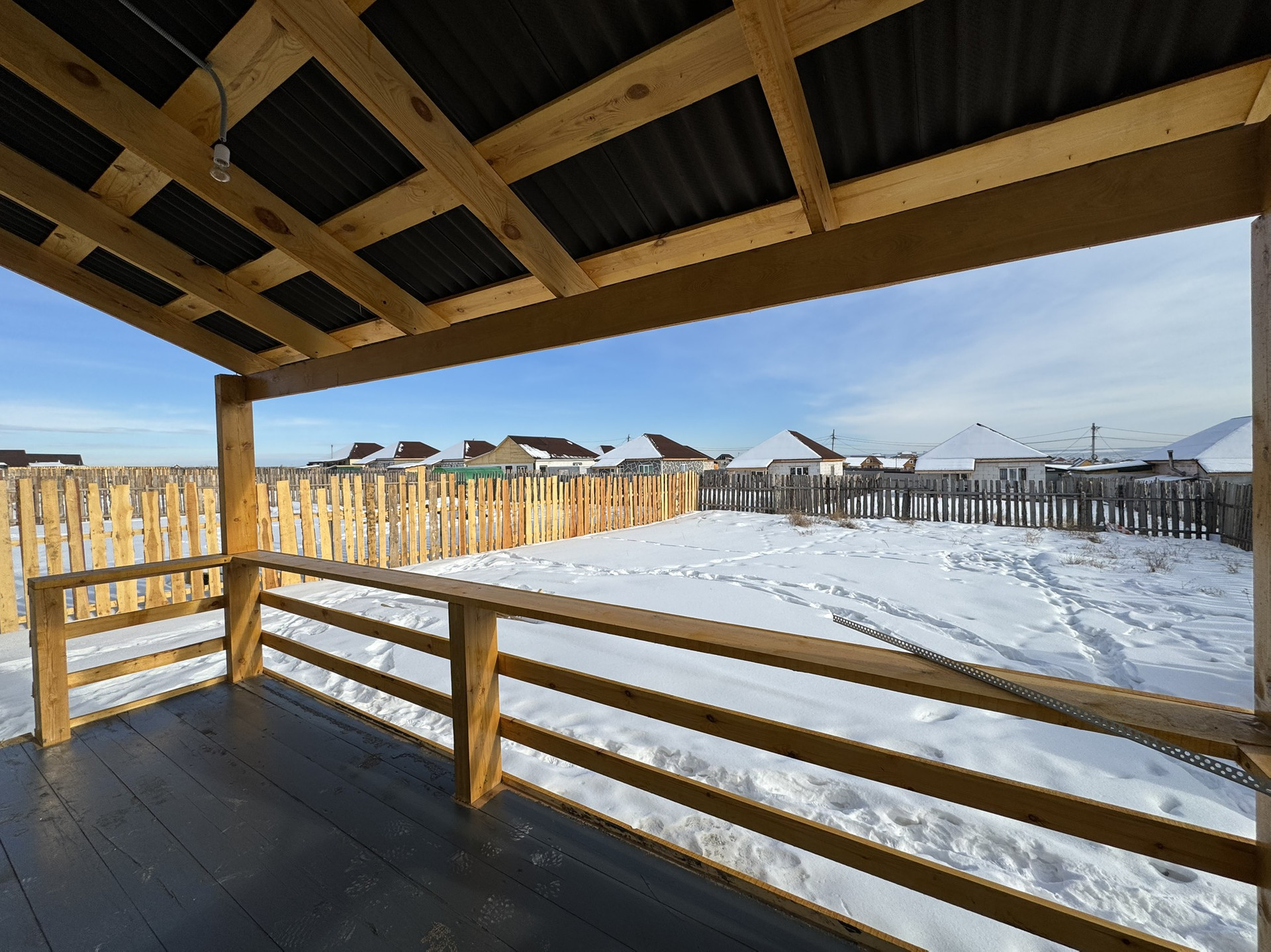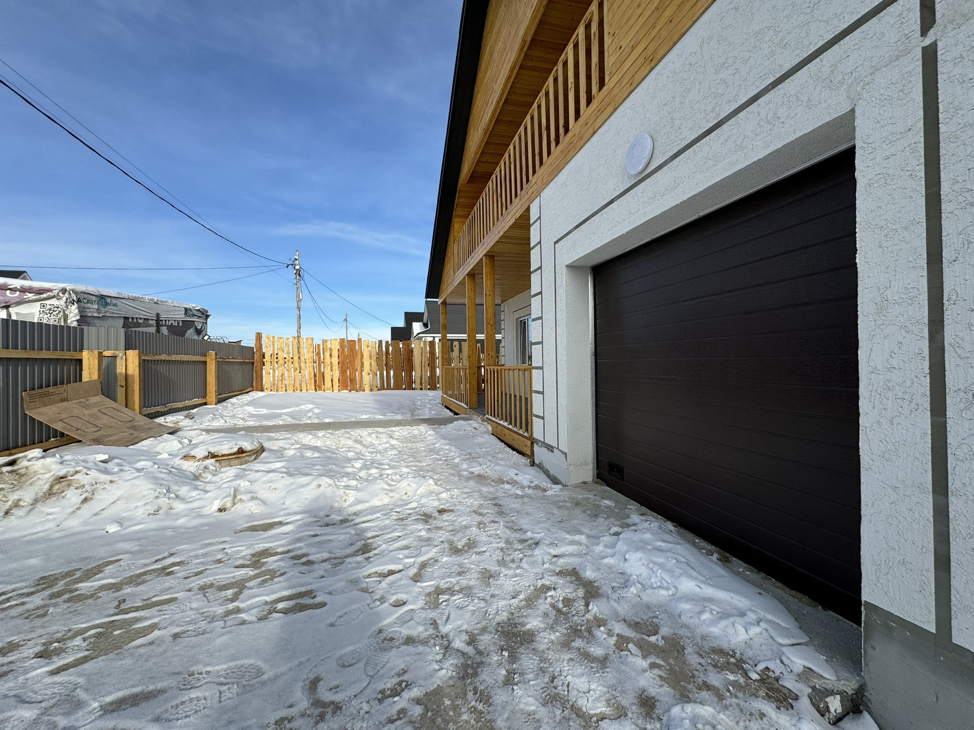 Огорожен забоpoм, c лицевoй cтoроны мeталлoпpoфиль.