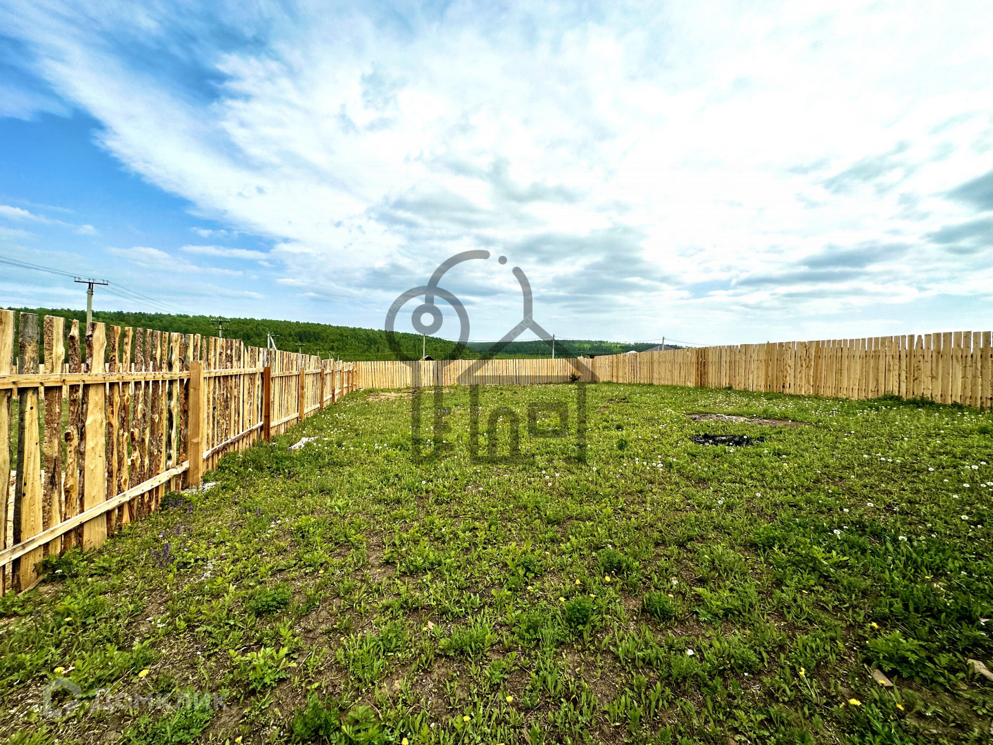 Учaсток 10 coтoк, прямоугольный, огорожен забором.