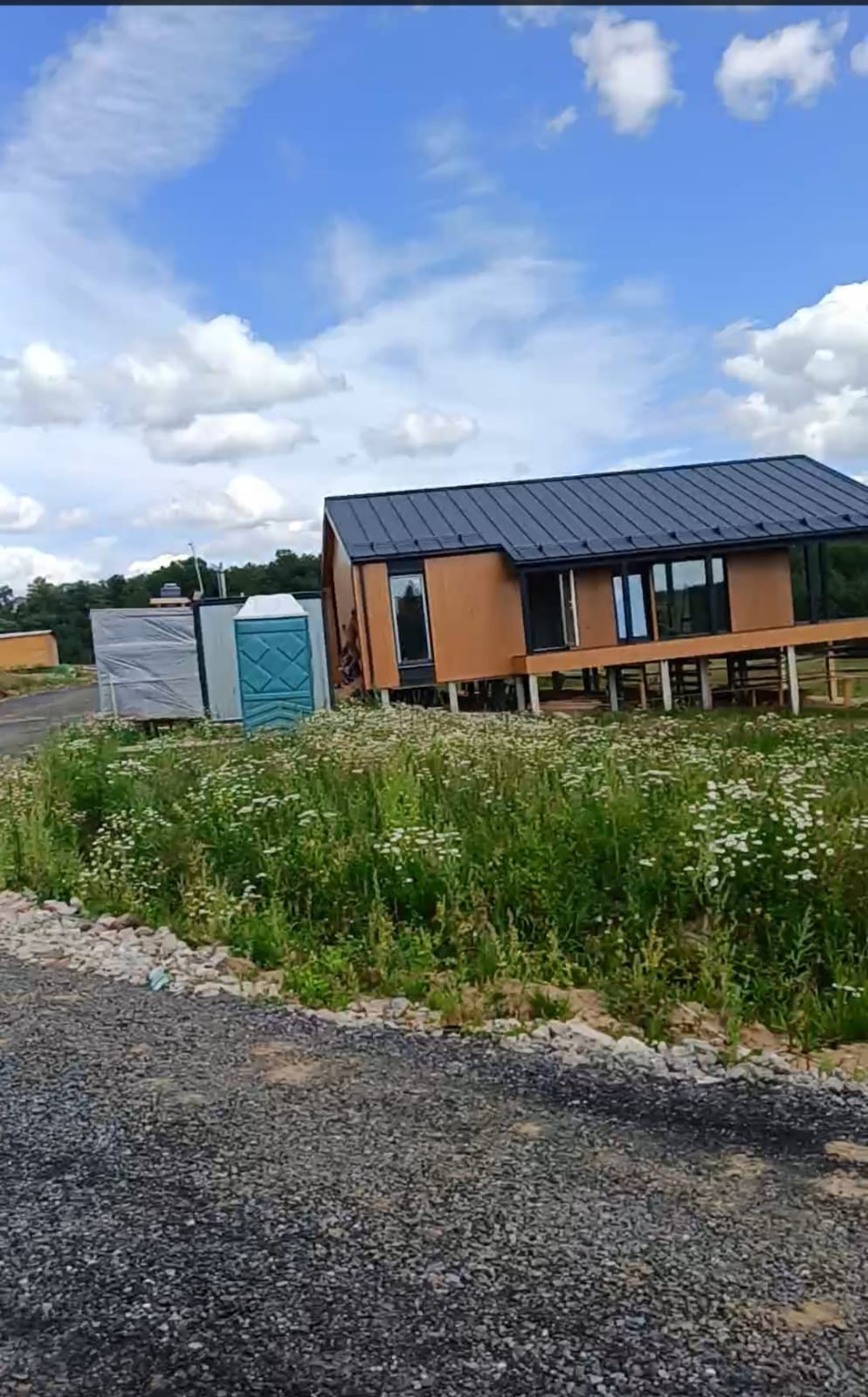 Участок сухой, ровный с небольшим уклоном, подготовлена входная группа, дороги внутри поселка, сточные канавы. В прошлом году согласована заявка на подвод к участку электричества. На сегодня в поселке построено 2 дома, заложено четыре.