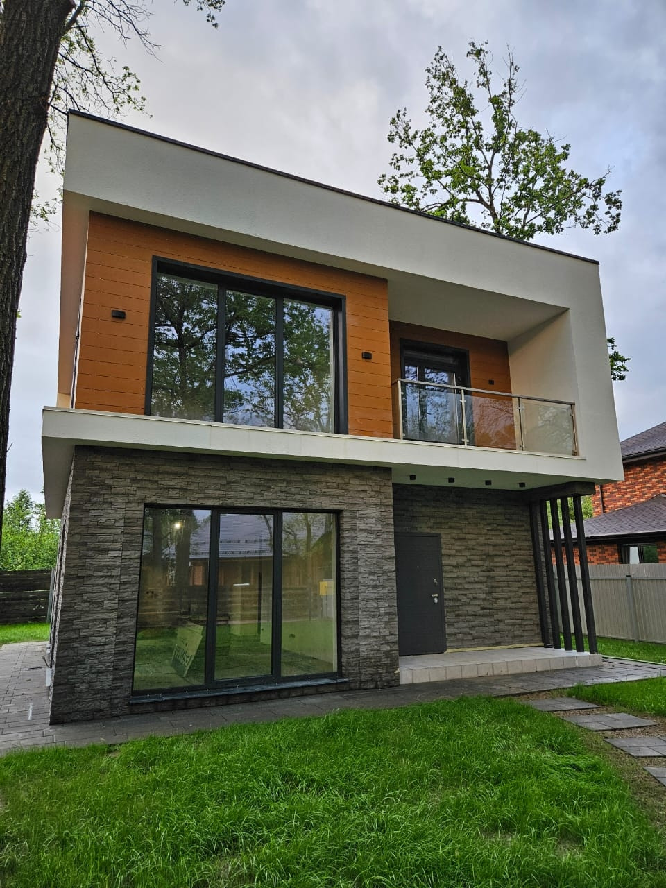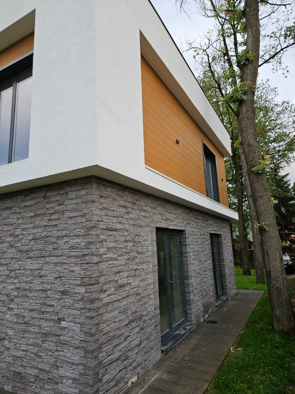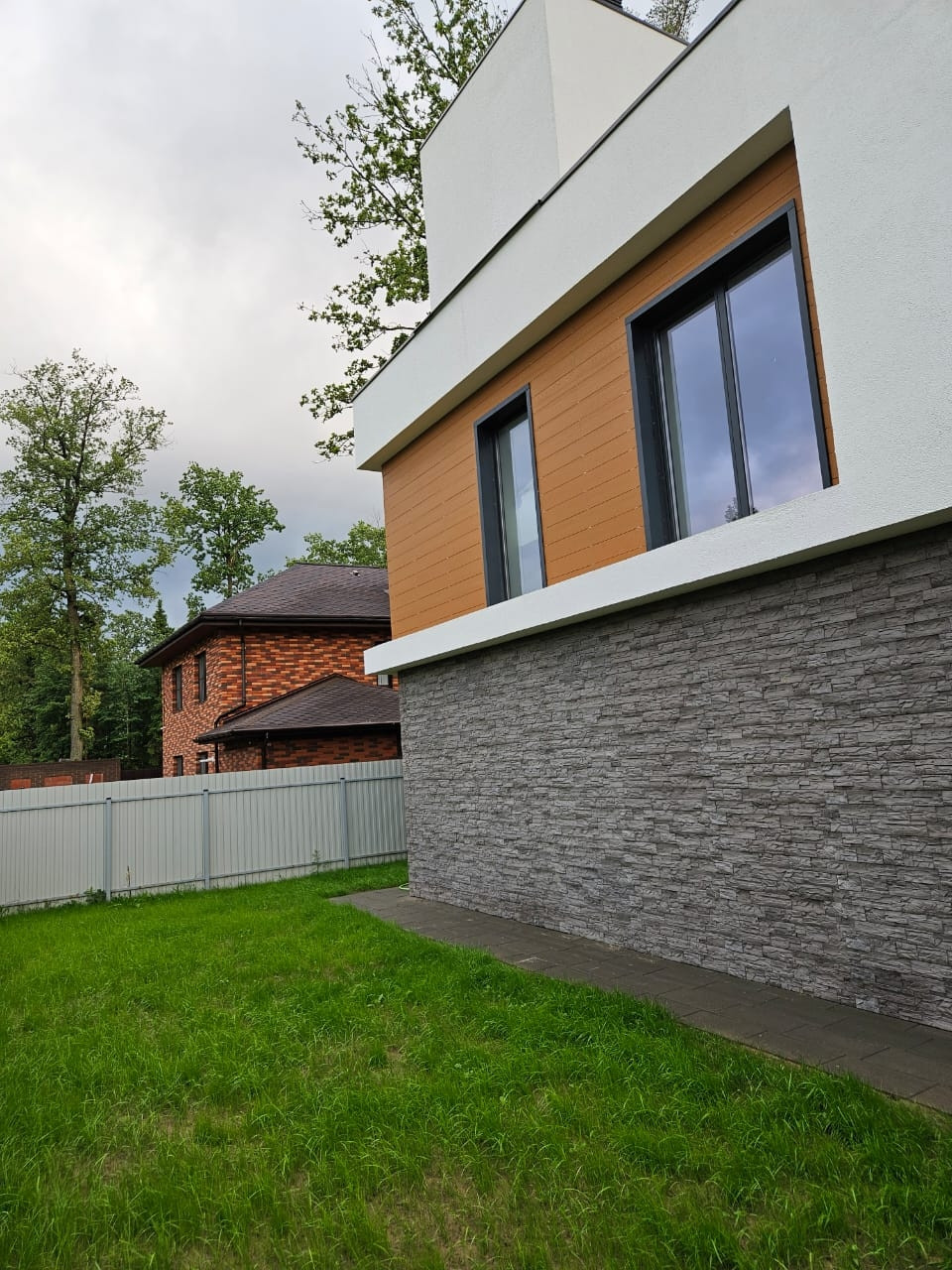 Дом построен на монолитной плите 350мм с утеплением, стены из газосиликатного блока толщиной 400мм, дорогая фасадная отделка, панорамные окна с профилем из теплого алюминия и энергосберегающющими стеклопакетами с напылением.